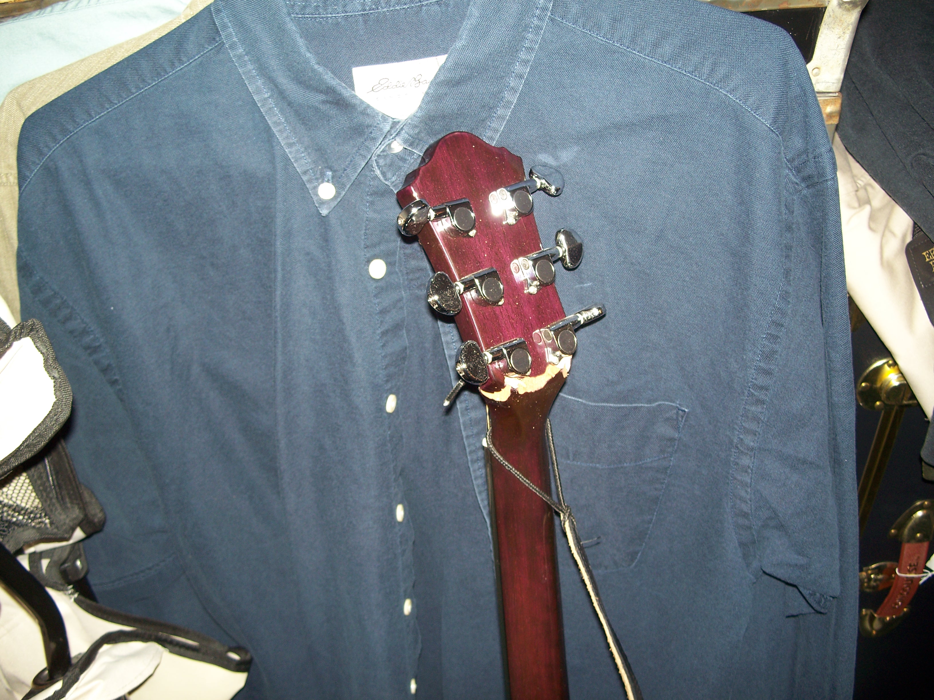 Looking around on the web, I saw mentions of $300 and up to repair such damage, which would have almost exceeded the value of the instrument. As I considered filming myself doing a Pete Townsend with it in the park, I took it down to Pasquele to see whether he could fix it and how much he'd charge. To my surprise, he quoted me $160 and when I returned later to drop it off, dropped the quote to $140 because the instrument wasn't a top-of-the-line guitar, which would necessitate a bit more cosmetic care. About three weeks later I got the instrument back, better than new because the reinforcement Pasquale added to reconstruct the neck actually made it stronger than the original construction.