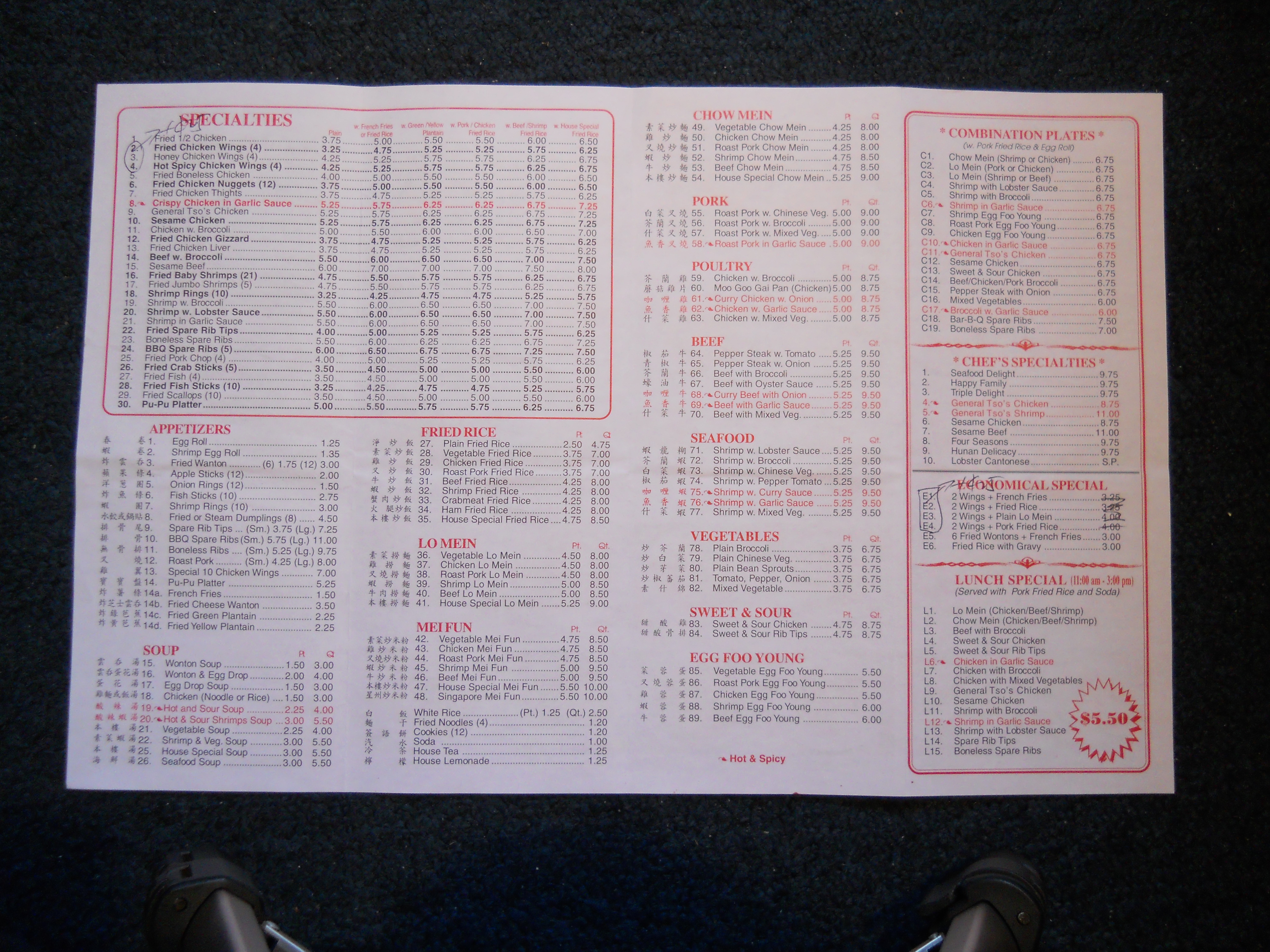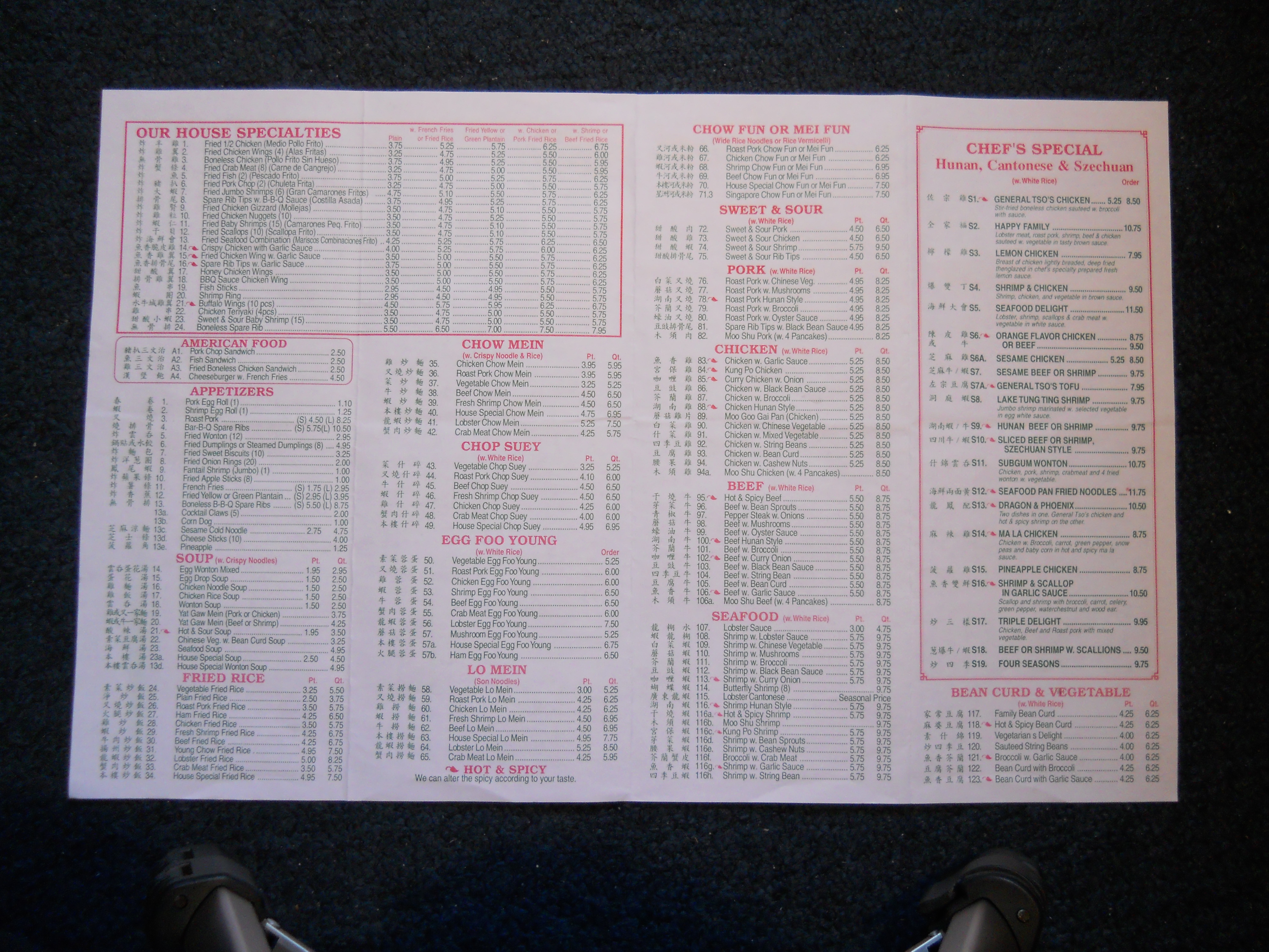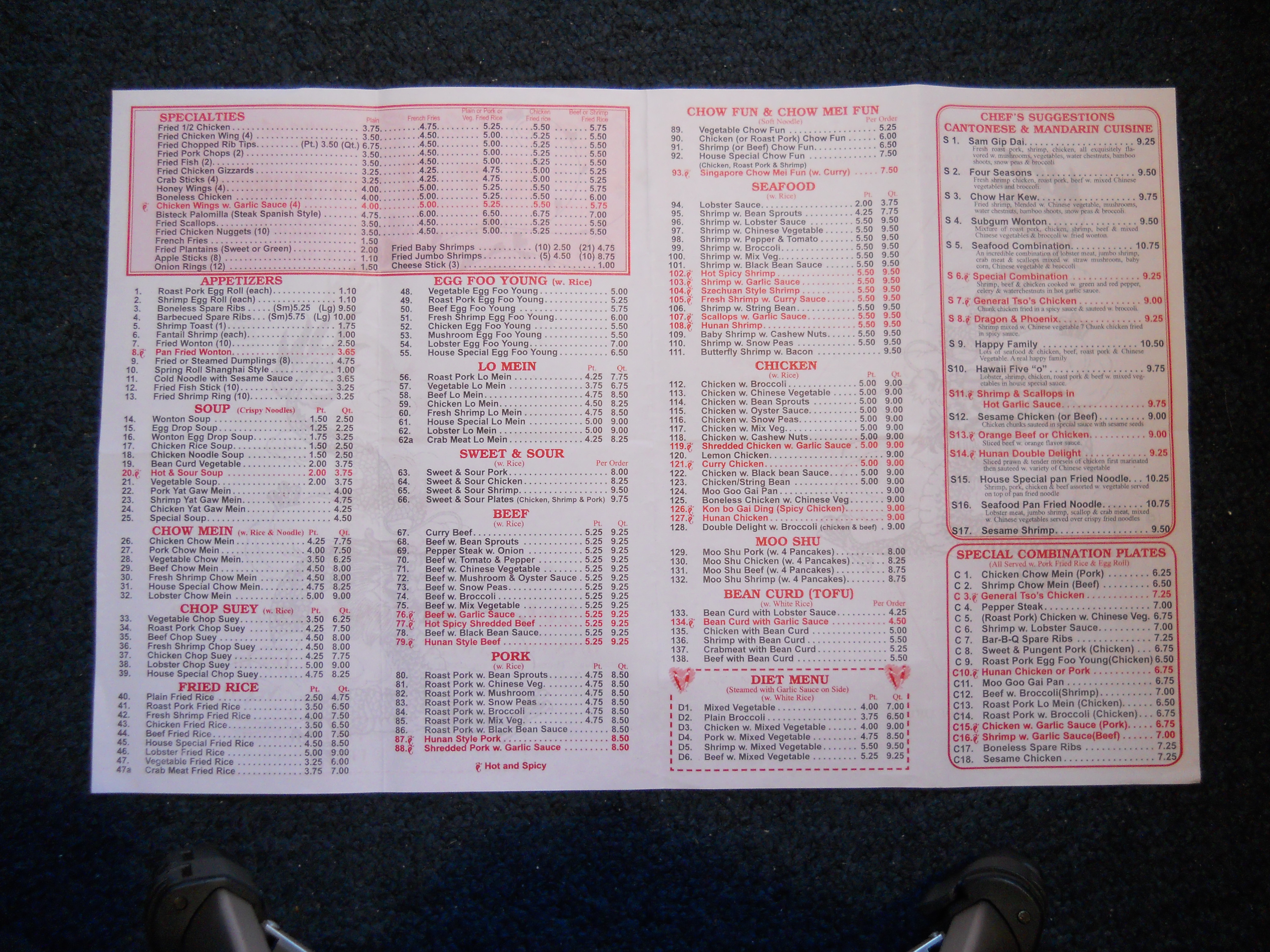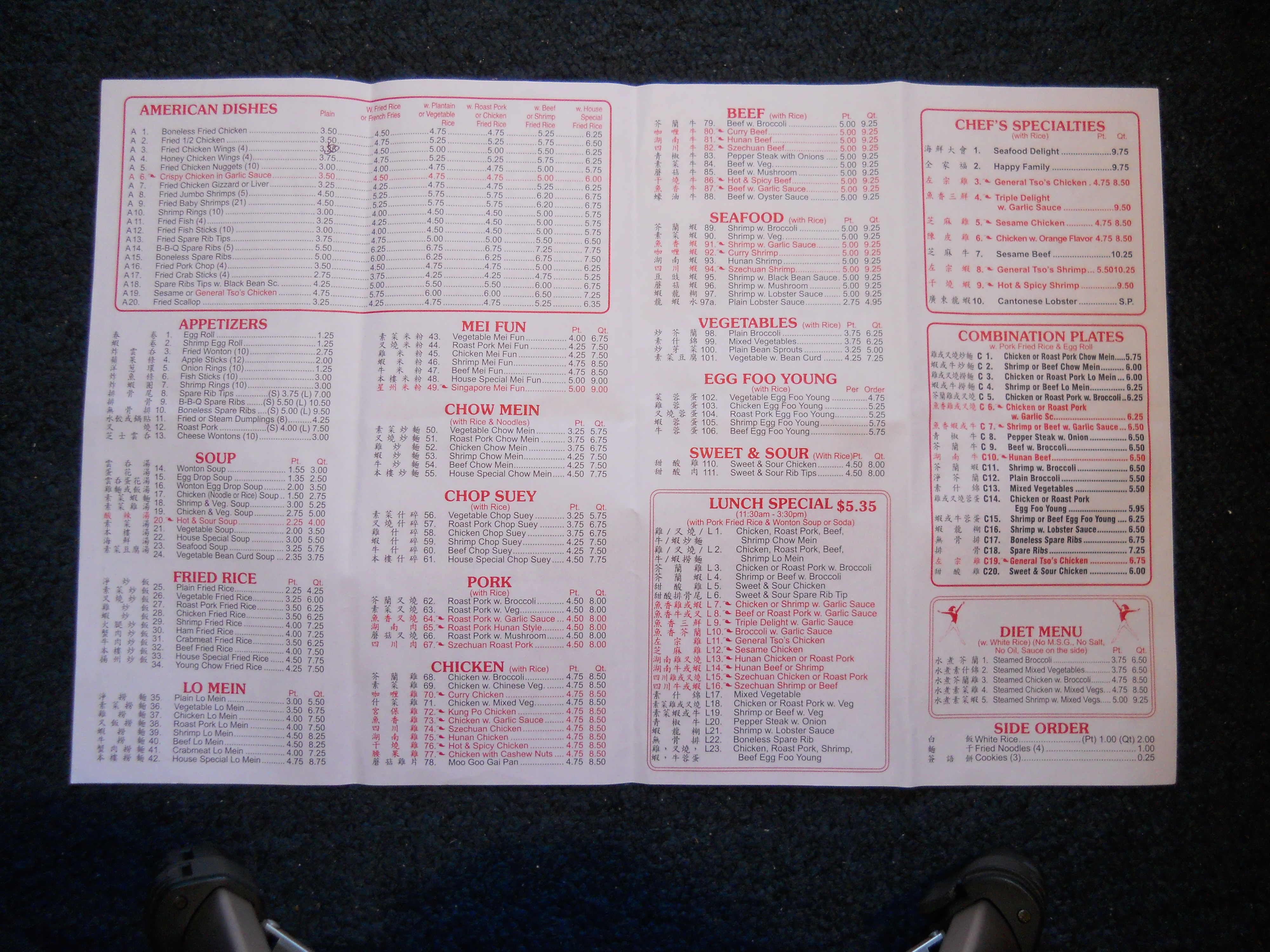 Number One Chinese Restaurant menu