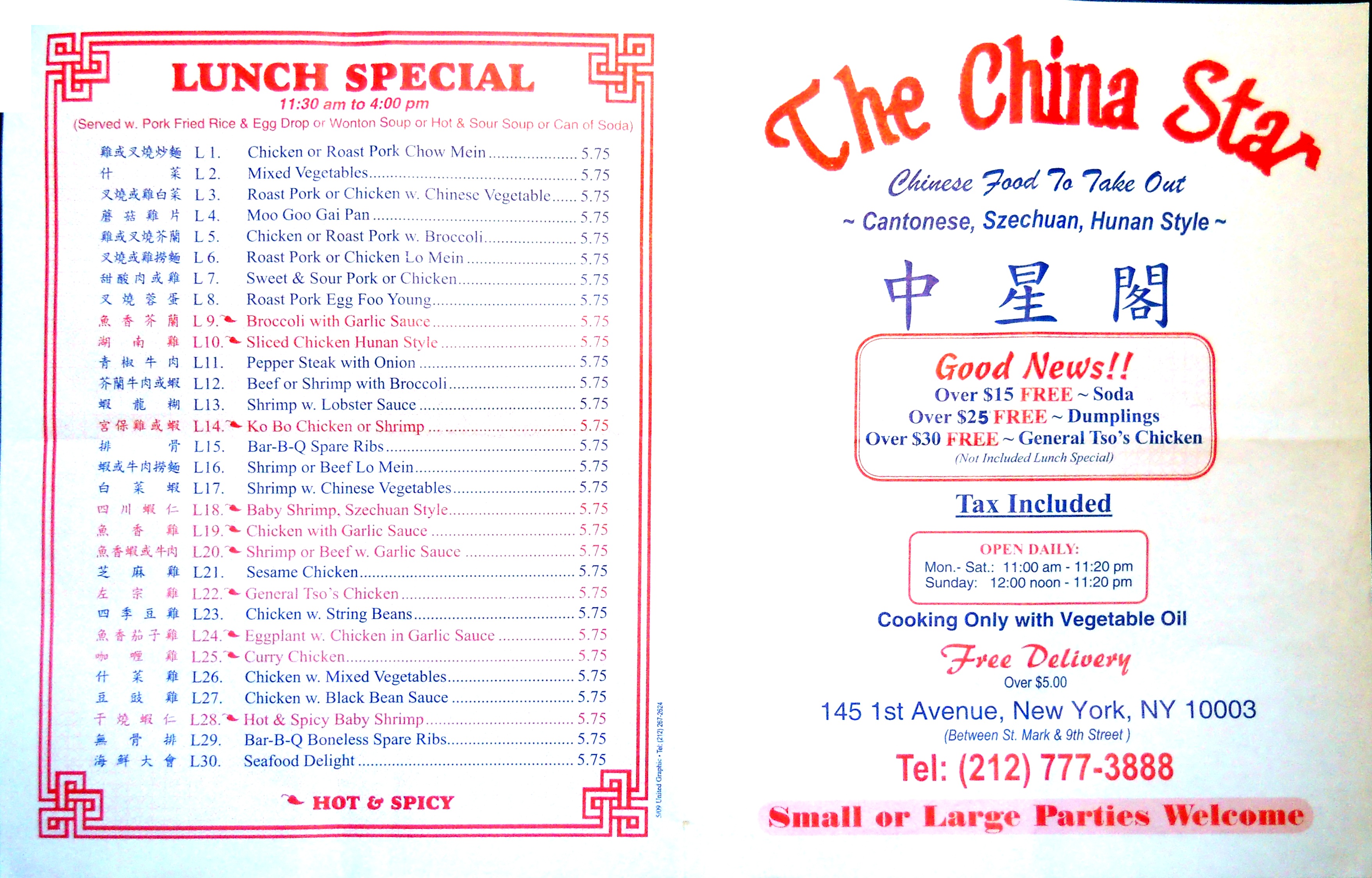 China Star menu, 145 First Avenue, New York, NY 10003 (CAMIS 41029094)