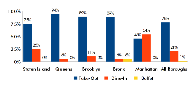 The graph below shows the dominance of the take-out in the city's Chinese restaurants. However, the small number of buffets is surprising given the dominance of that restaurant type in much of the rest of the country. Again, microeconomic and social factors like high rents and a more difficult patron base are likely involved.