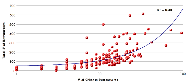 Spatially correlating the density of these restaurants with neighborhood demographics from the 2000 Census revealed few meaningful relationships. As might be expected, there was a slight relationship between population and restaurant density - the more people in a neighborhood, the more Chinese restaurants there are. And there was a fairly strong correlation with the density of all types of restaurants - where there are more restaurants, there are more Chinese restaurants.