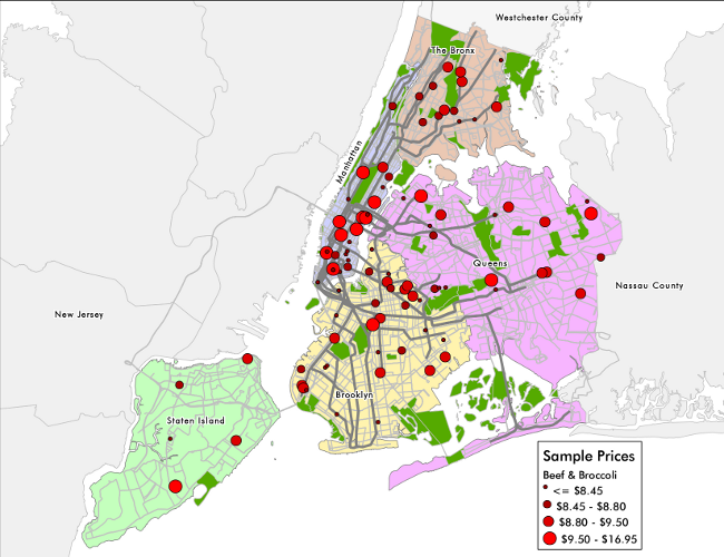 The benchmark for pricing was a large portion of beef and broccoli and the price data from the random sample is mapped below. Most prices were between $7.50 and $10.50, with a handful of high-end restaurants up to $16.50. The narrow range of prices implies a commodification of Chinese food that may also reflect market saturation.