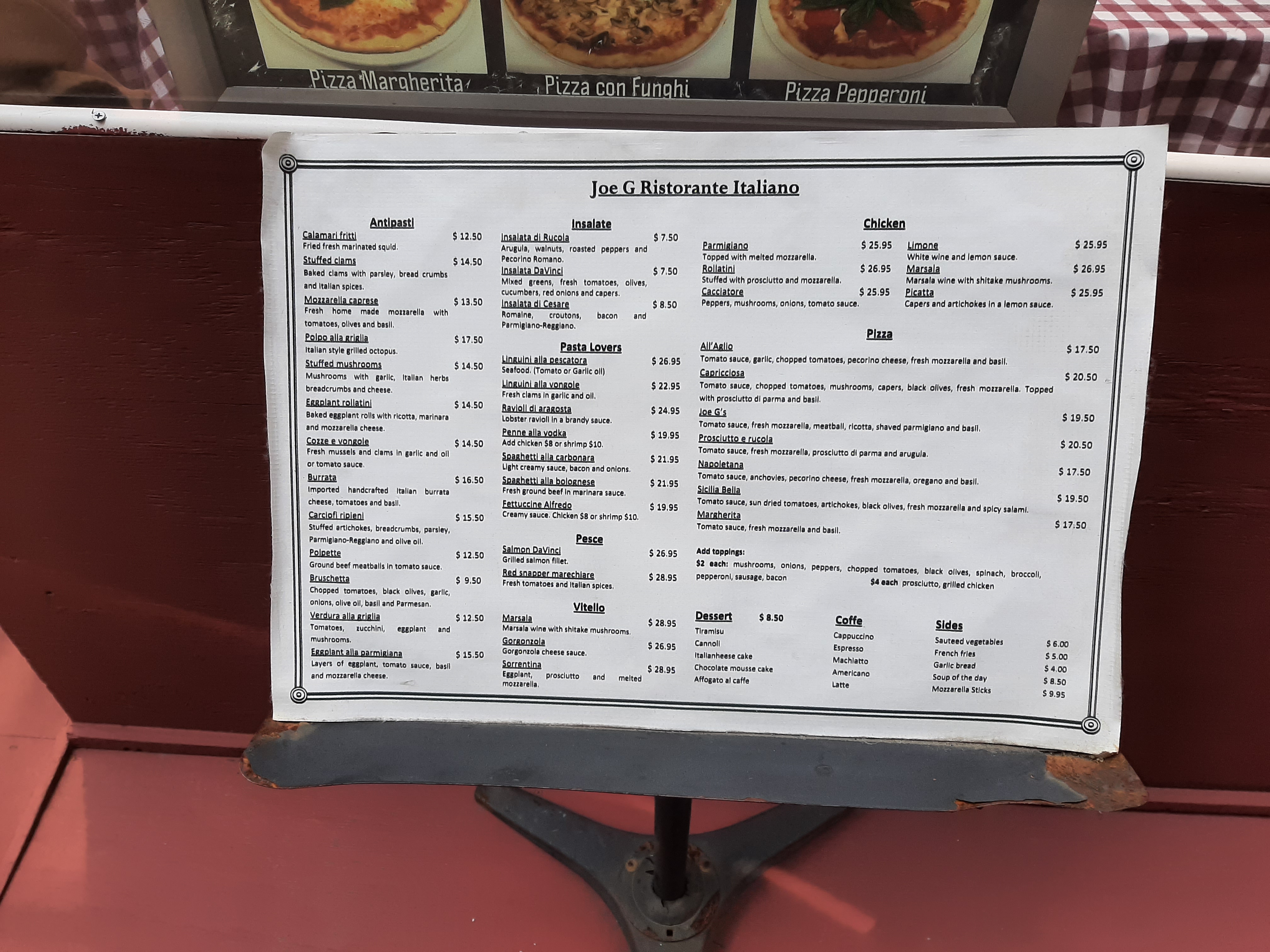 Joe G Restaurant menu