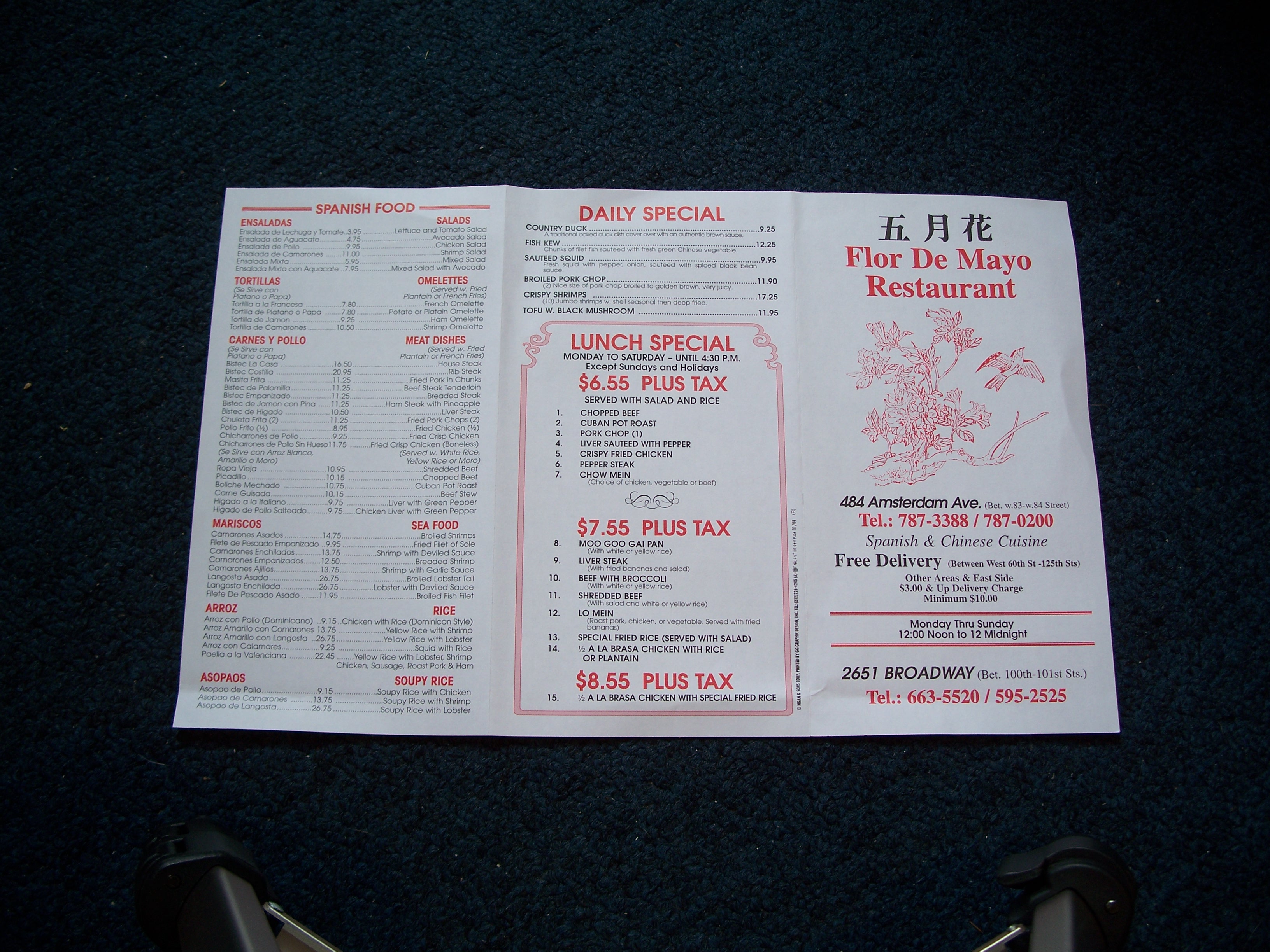 06/16/2009 11:17:46 Flor de Mayo (CAMIS 40689536)06/16/2009 11:17:58 Menu07/17/2009 17:48:33 Chicken and Mixed Vegetables, Flor de Mayo06/02/2019 17:09:41 Flor de Mayo (CAMIS 41445602)06/02/2019 16:40:39 Chow Gai Ding06/02/2019 17:07:34 $20.6906/09/2019 21:06:40 Chow Gai Kew - ten years later06/09/2019 21:30:43 Chow Gai Kew = #22.8606/09/2019 21:24:35 Sunday night at Flor de Mayo (video)