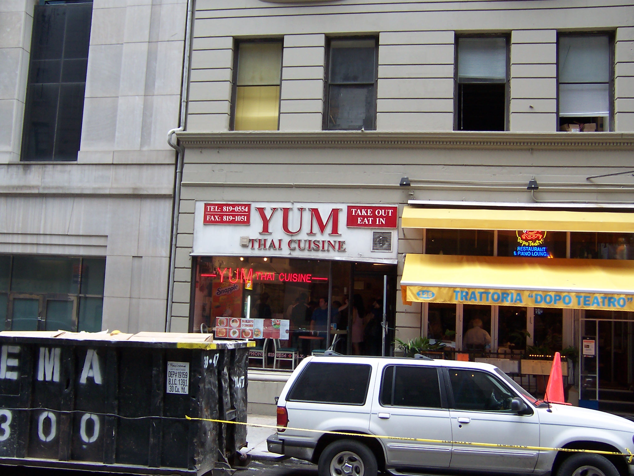 I was introduced to Yum Thai when I was working across the street at Lamb's Theatre (which also no longer exists). Best chicken pad thai I've EVER had. However, it never struck me as the cleanest place in the theatre district and the health department apparently agreed, shutting it down for good in November of 2007.