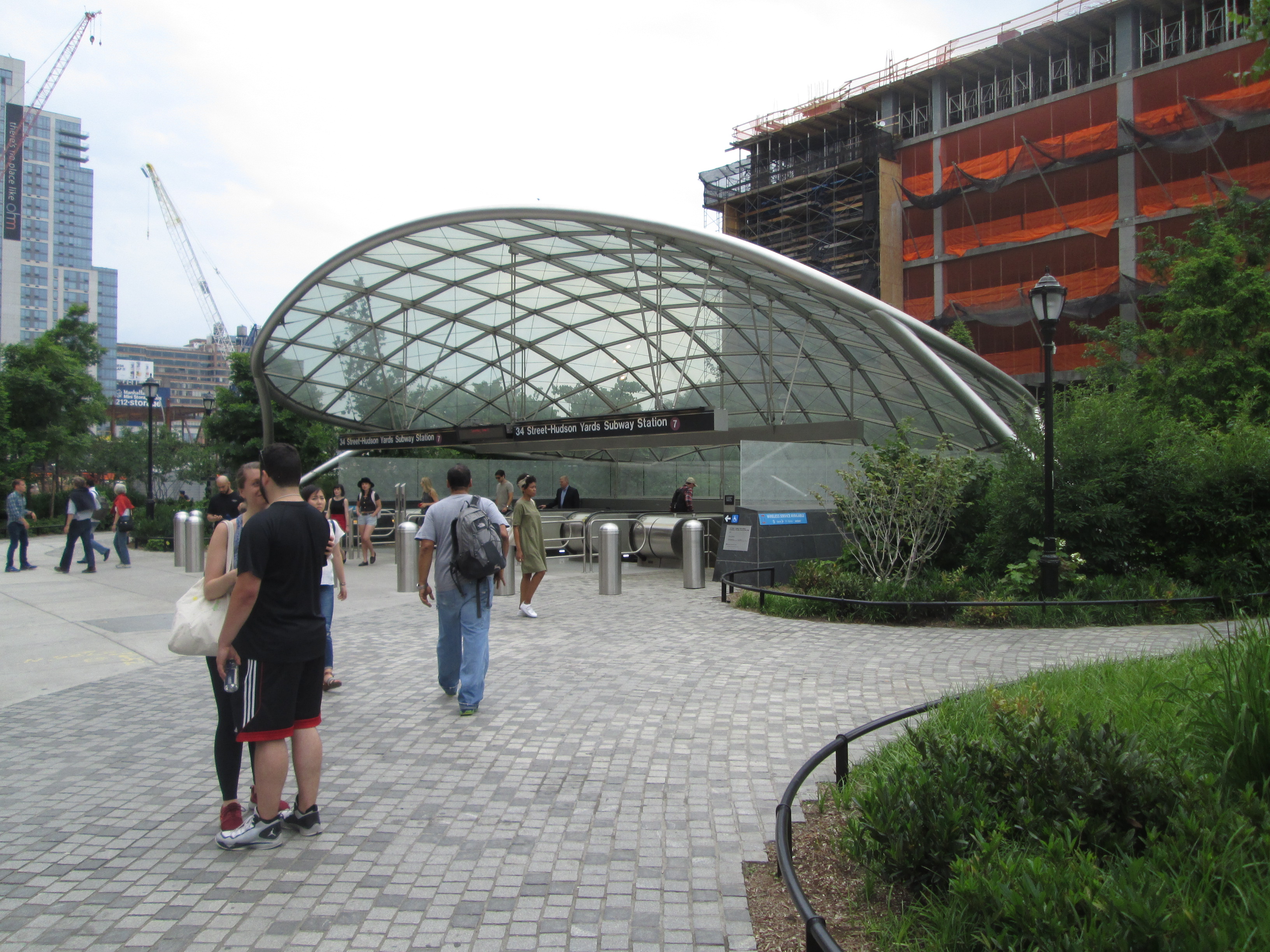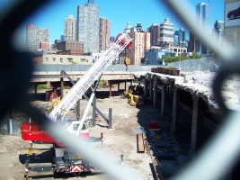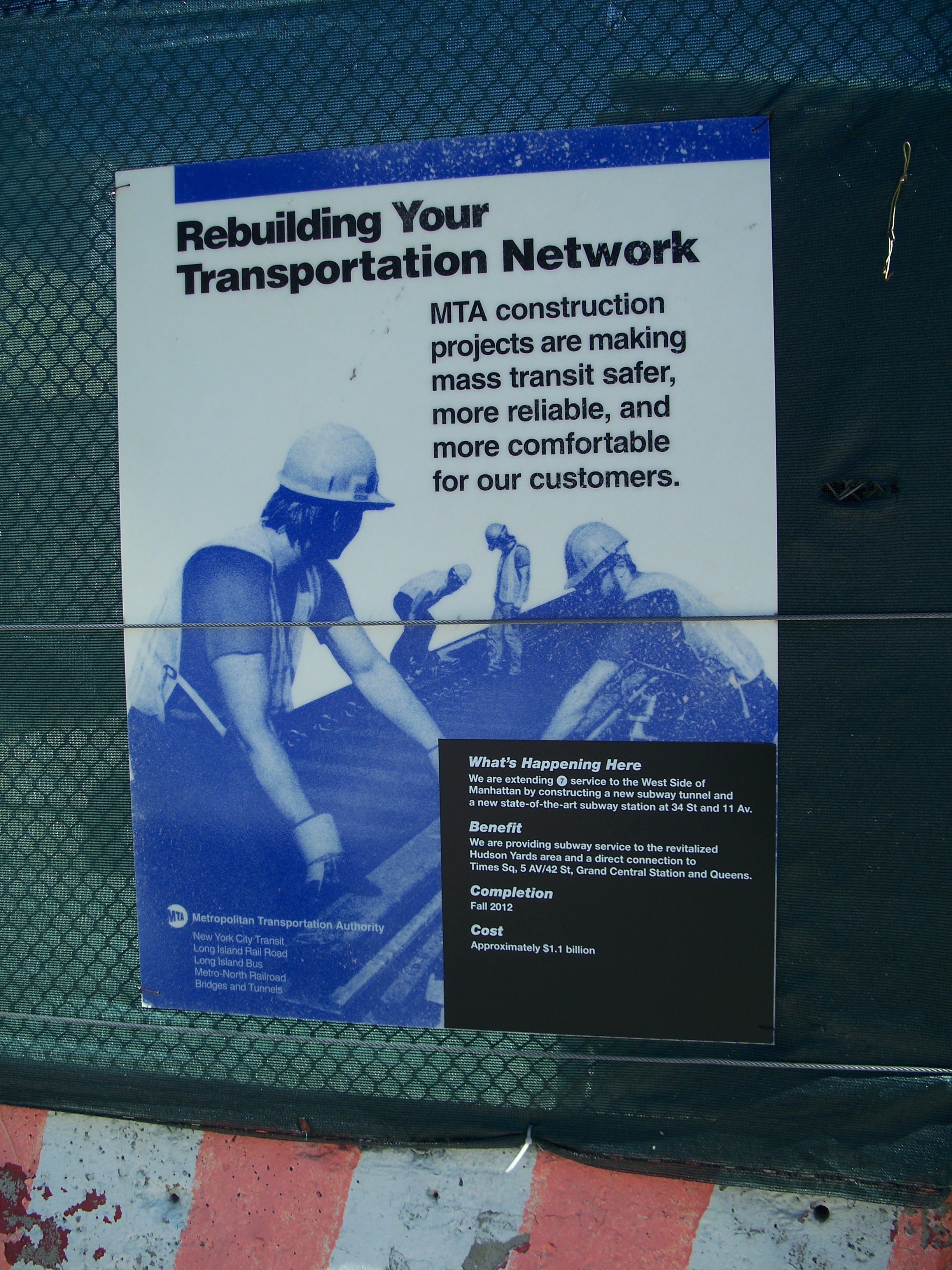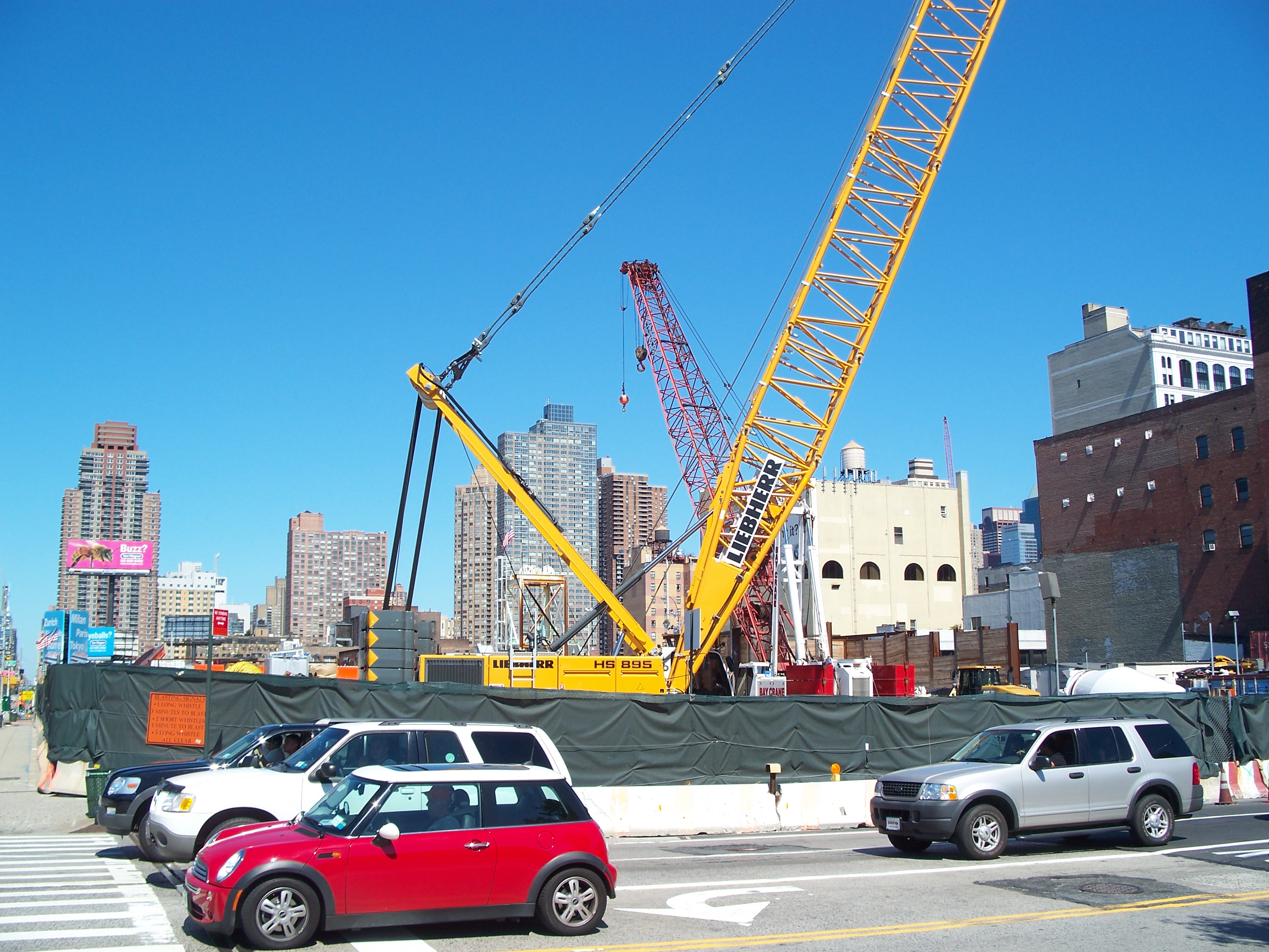 In October of 2007, the Metropolitan Transit Authority began awarding contracts for an extension of the IRT Flushing Line (#7 Train) from its existing terminus at Times Square under 41st Street (which opened in 1917) to an new station here on Eleventh Avenue at 34th Street across from the Jacob Javits Convention Center. The two-track extension will run through a new 7,000-foot deep-bored tunnel under 41st Street that turns south and runs under Eleventh Avenue. While there is interest in building a station at 41st Street and Eleventh Avenue to service the burgeoning crop of luxury development on the far west side of Hell's Kitchen, as of this writing, the city (suffering from chronic financial difficulties) hasn't come up with the money to build the station. The tunnel will actually continue south to 23rd street to provide train storage, leaving the possibility of later extension further south into Chelsea and the Chelsea Piers recreational area.