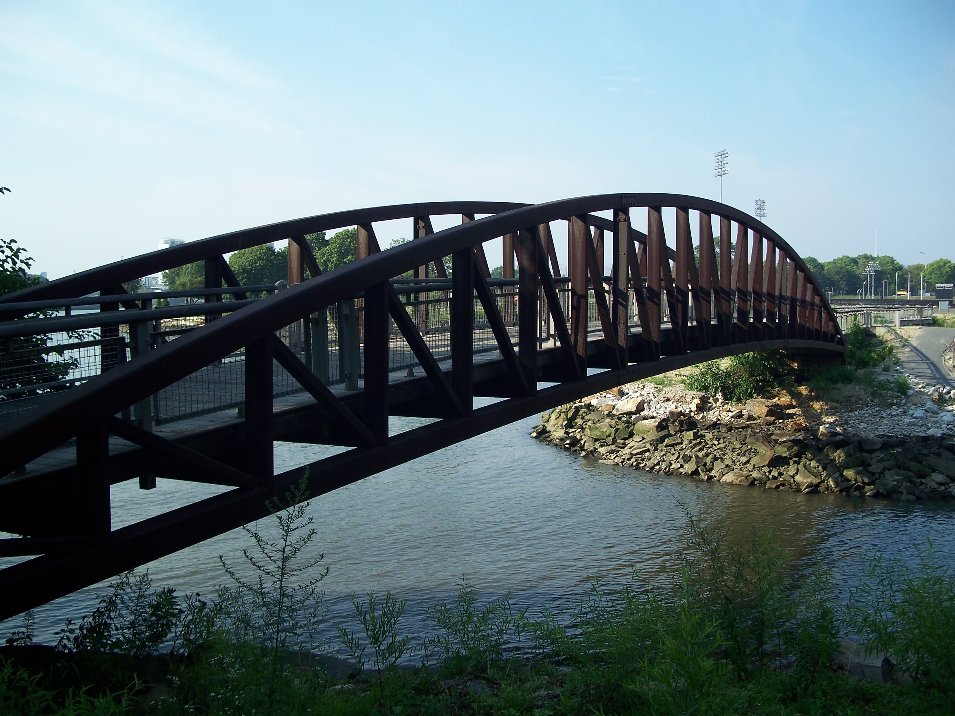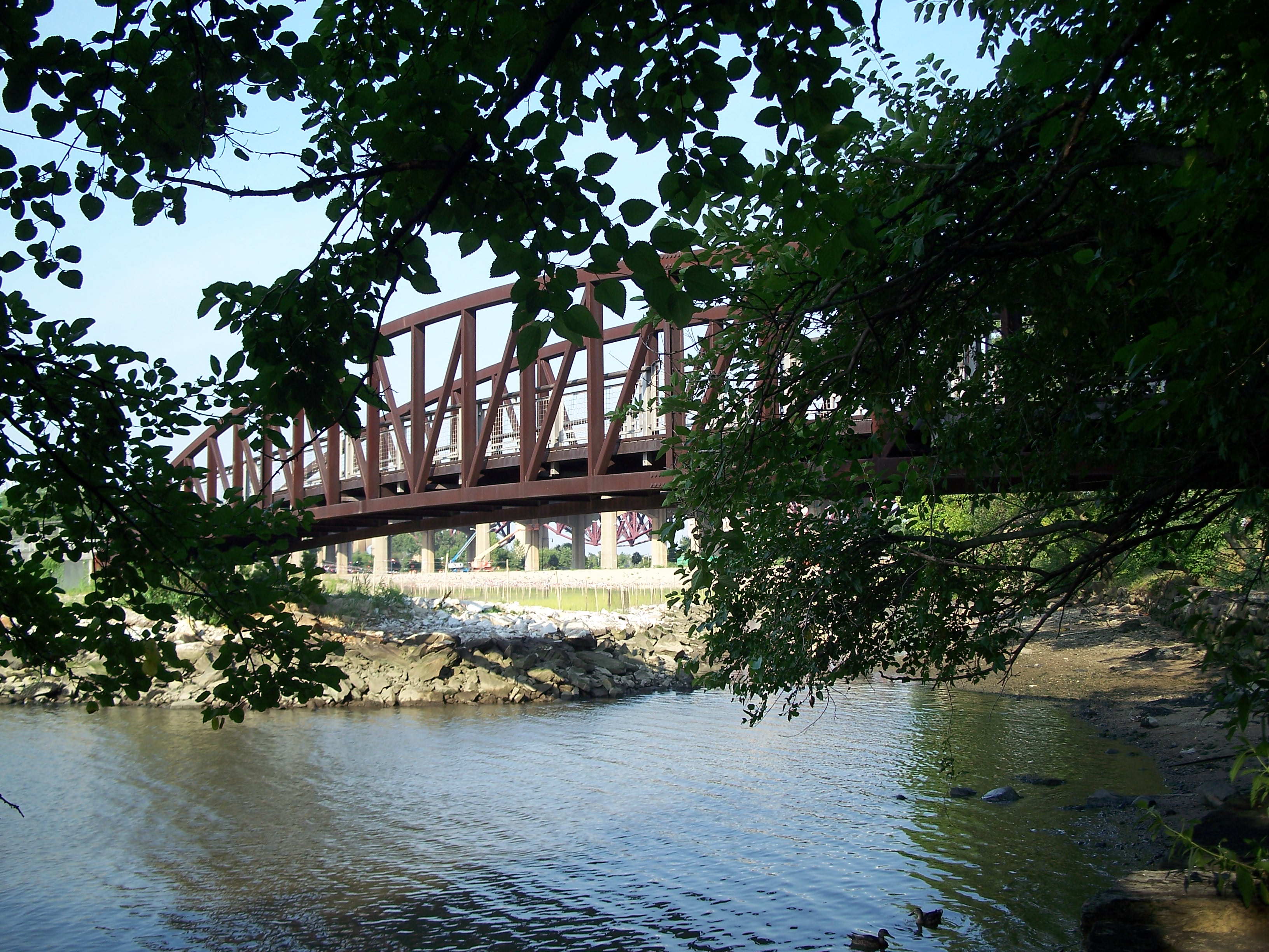 Little Hell Gate (the water separating Wards and Randalls Island which is now filled in) was traversed by four 300-foot deck arch spans with inverted bowstring trusses sitting on 155-foot towers. The final fixed truss span over Bronx Kill (also now largely filled in) is 350-feet long. The steel-arch span was the longest of its type in the world, until being surpassed by Ammann's Bayonne Bridge in 1931.