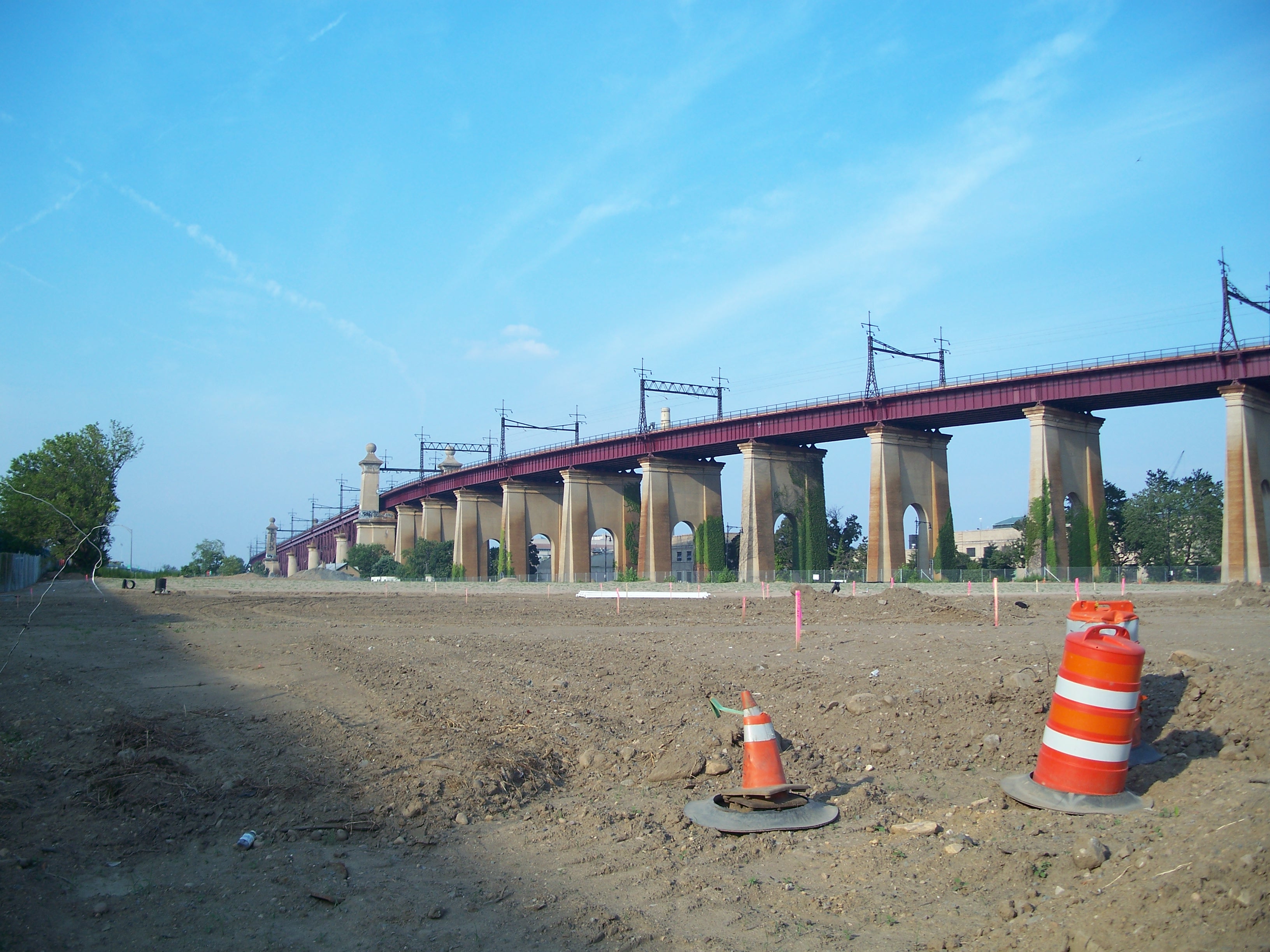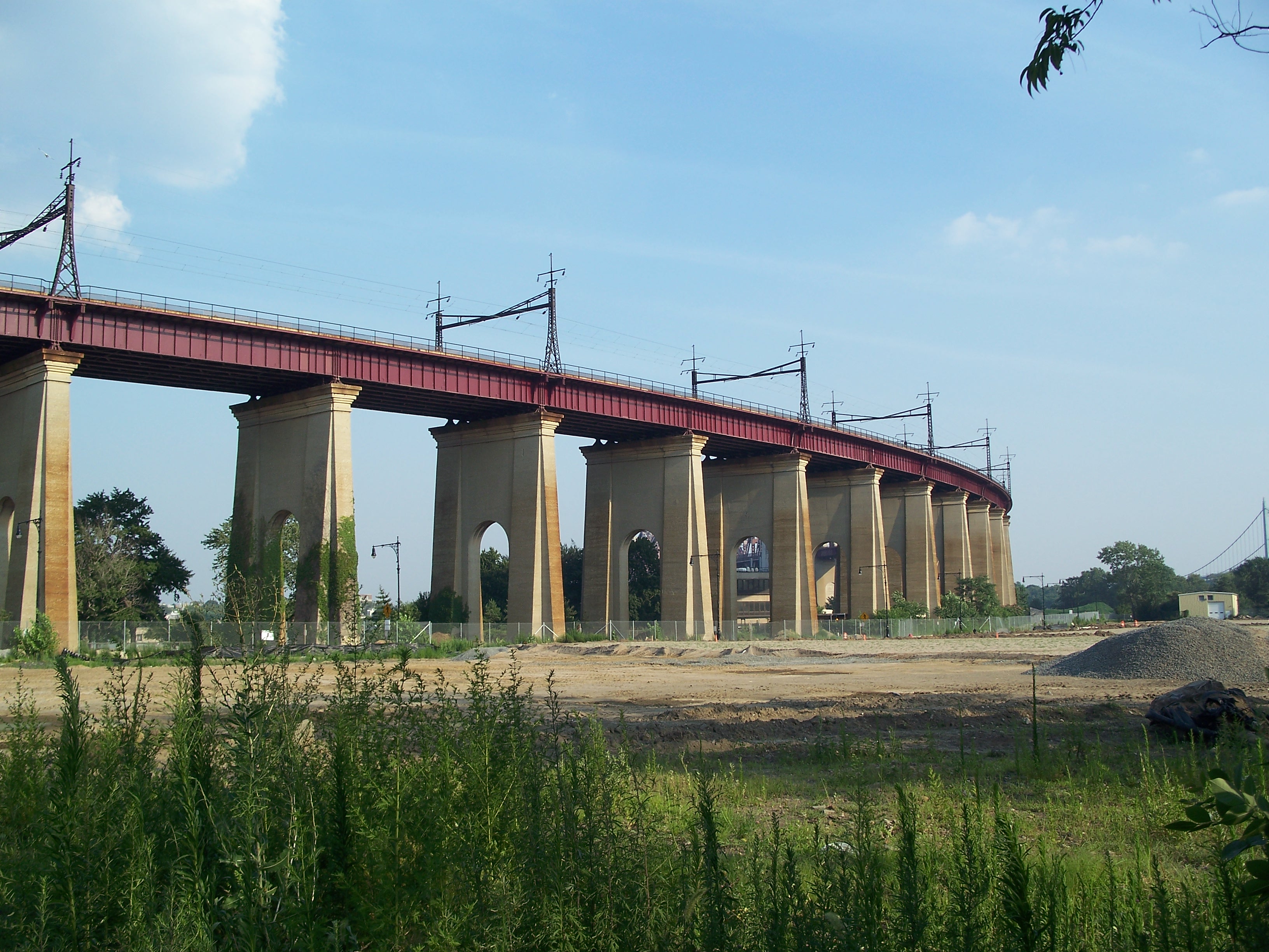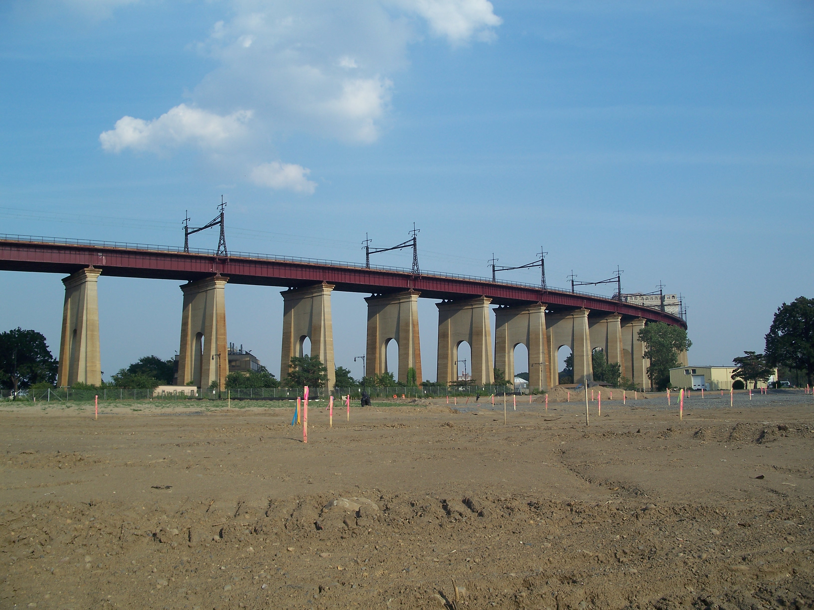 The New York Connecting Railroad runs on a viaduct from the Hell Gate Bridge across Wards Island and Randalls Island, gently descending into Port Morris on the other side of Bronx Kill.