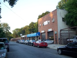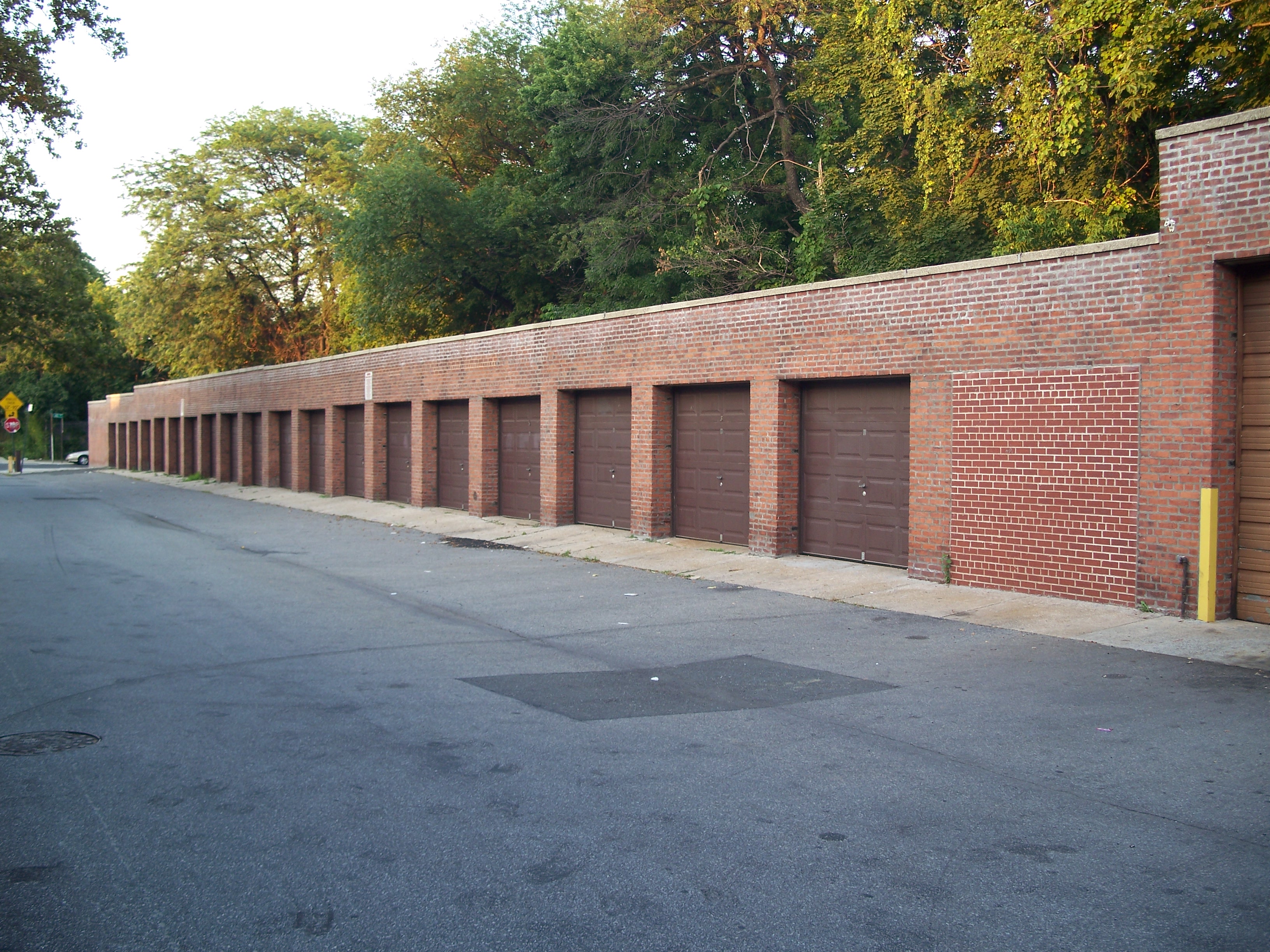 Low-rise storage garages along the east side of the track on Shaler Avenue