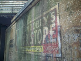 Ghost sign outside New Lots Station for Tobey's Liquor Store