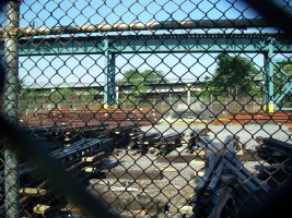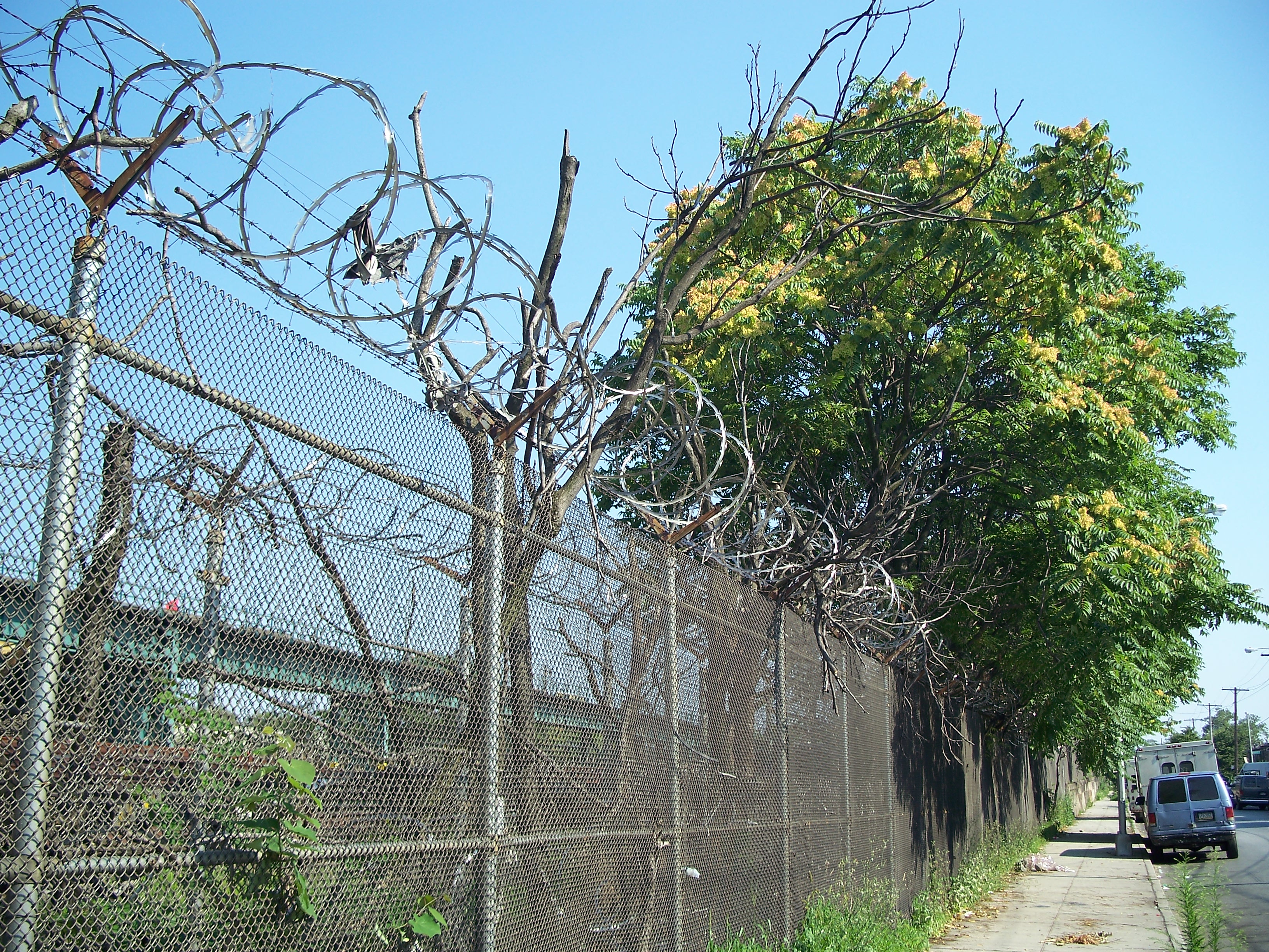 Razor wire and dead trees protect the storage yard