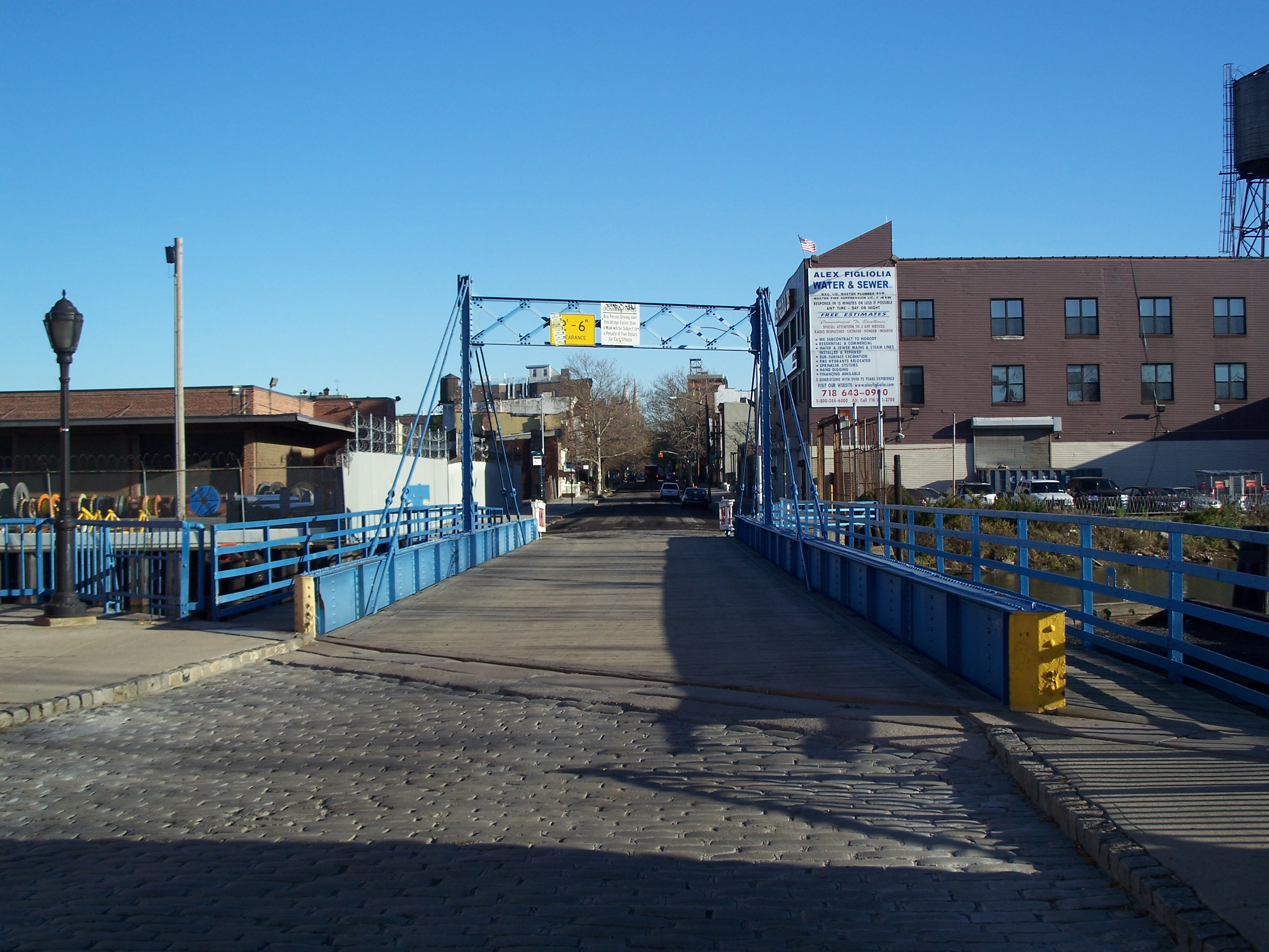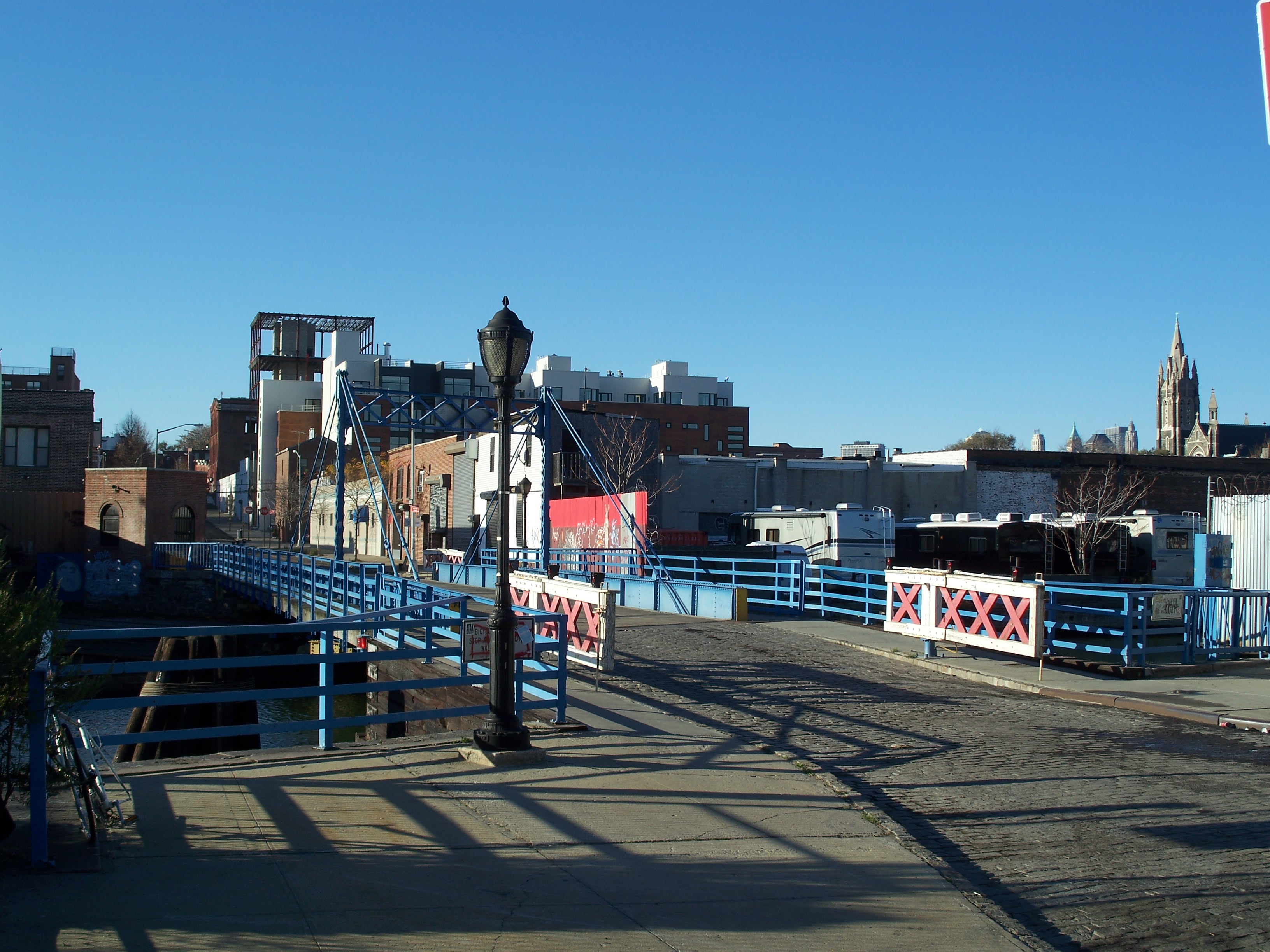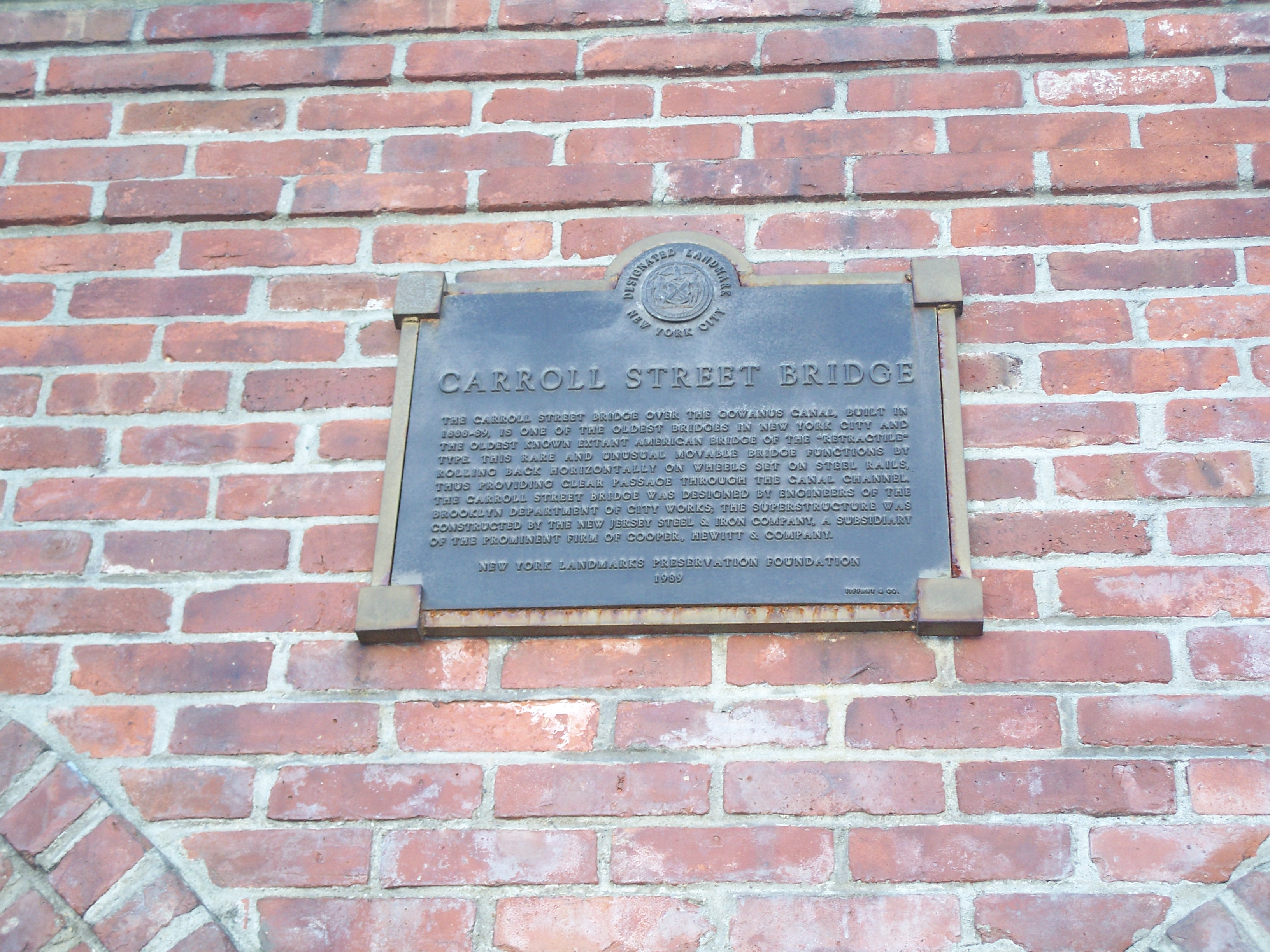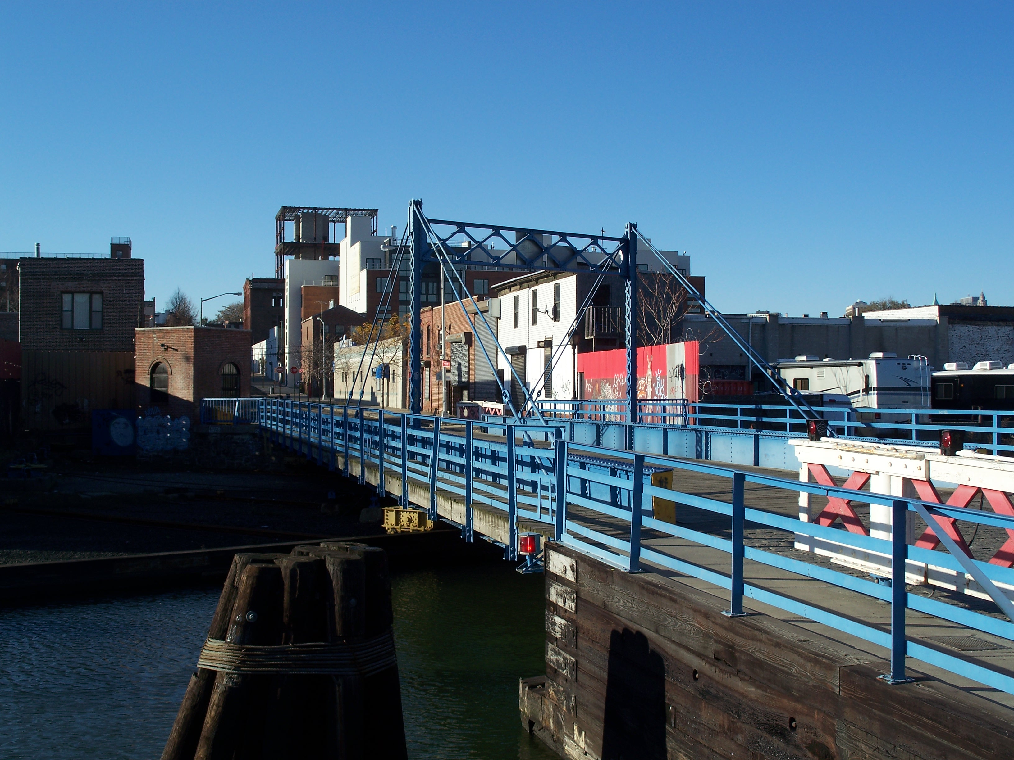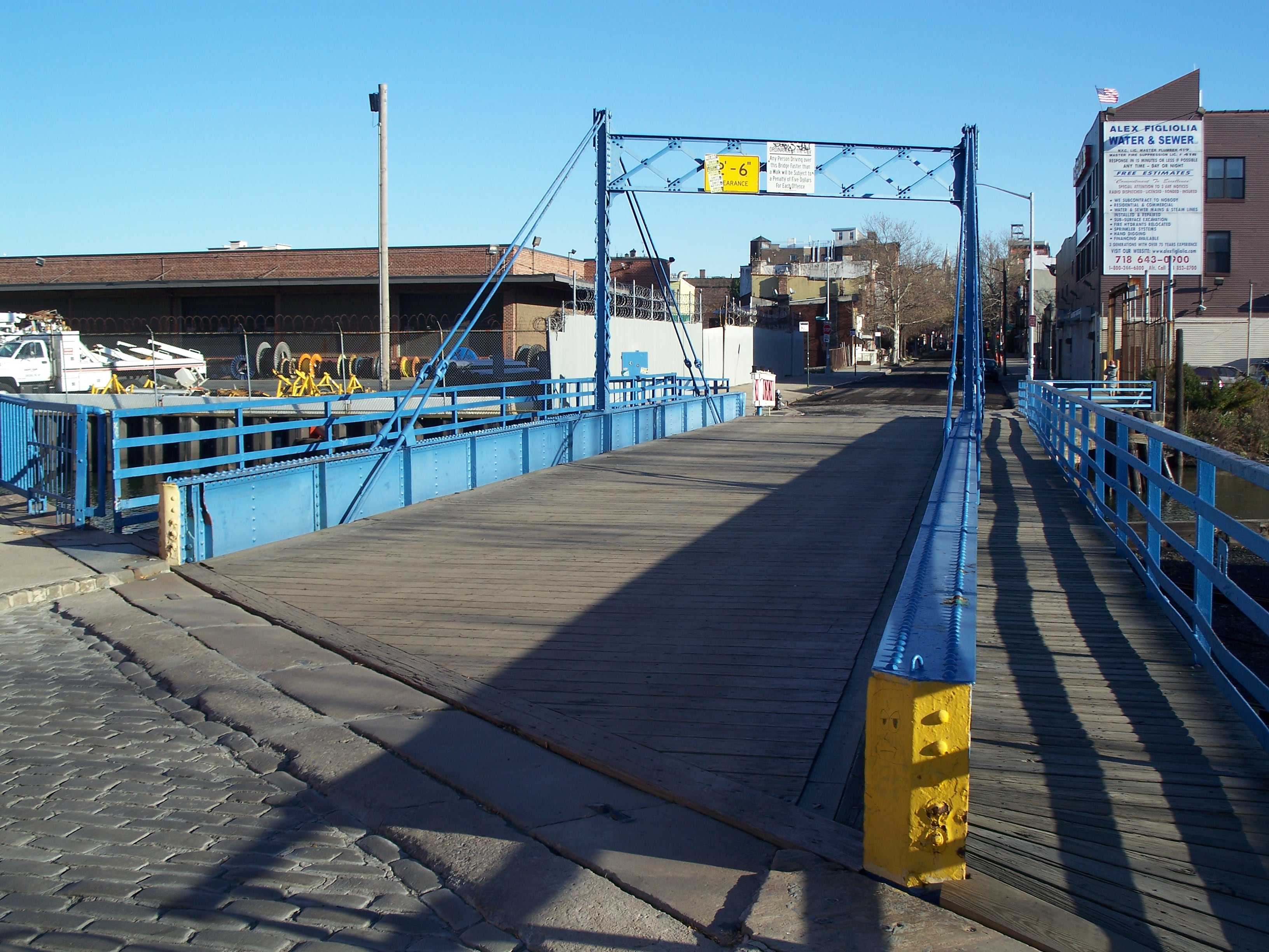 The Carroll Street Bridge (NYC BIN #2240260) opened in 1889 and is a very rare example of a retractile drawbridge in which the main span is slid back on rails diagonally to clear passage through the canal. It is also notable as a rare surviving example of a kingpost truss - in this case constructed with plate girders. The bridge was designed by engineers at the Brooklyn Department of Public Works and built by the New Jersey Steel and Iron Company (Trenton Iron Works), a subsidiary of the firm of Cooper, Hewitt and Co. The bridge is trapezoidal in shape with a 17-foot roadway and 4-foot sidewalks. The span is 63 feet with a total bridge length of 107 feet. The channel it clears is 38 feet wide.