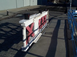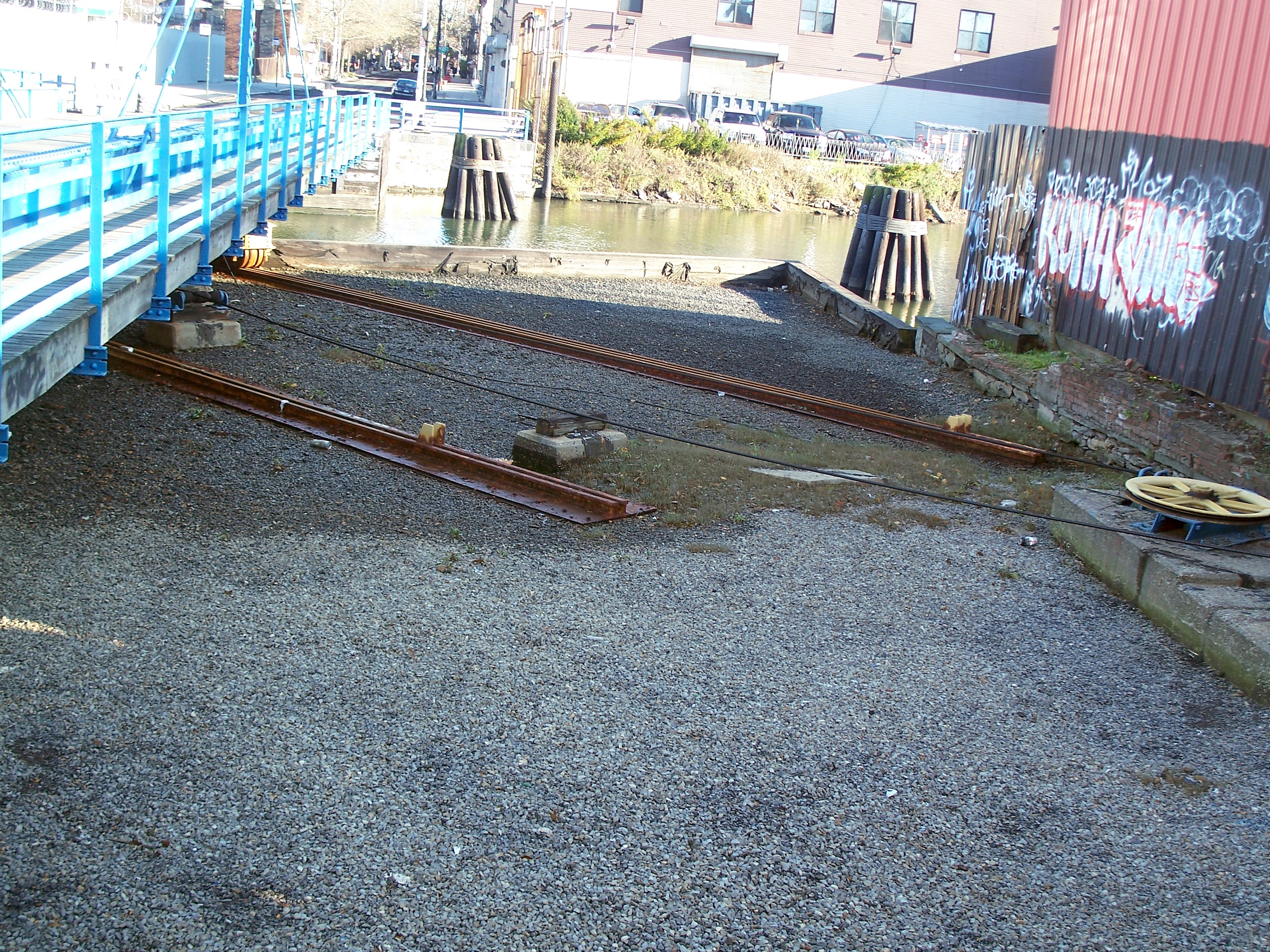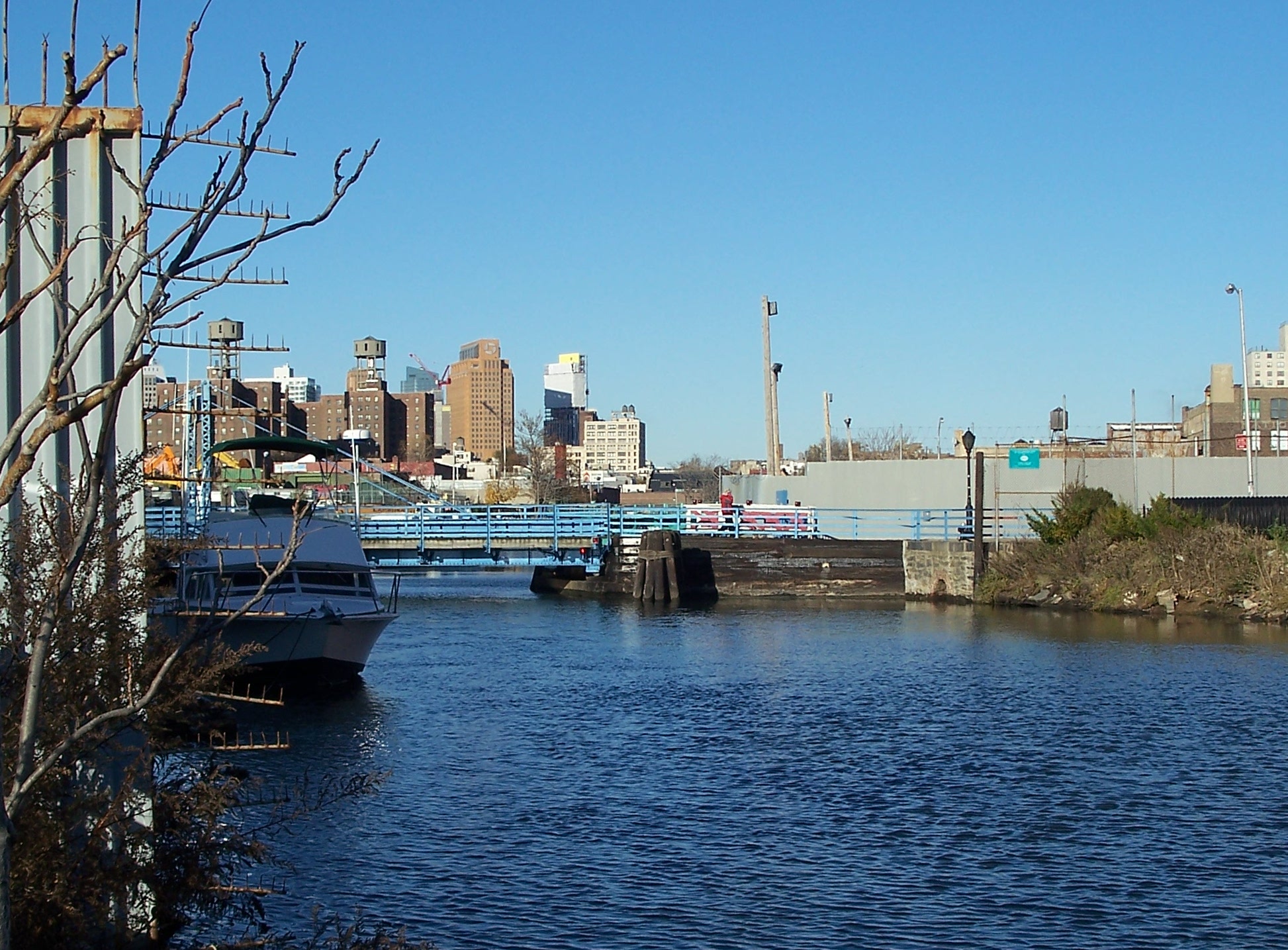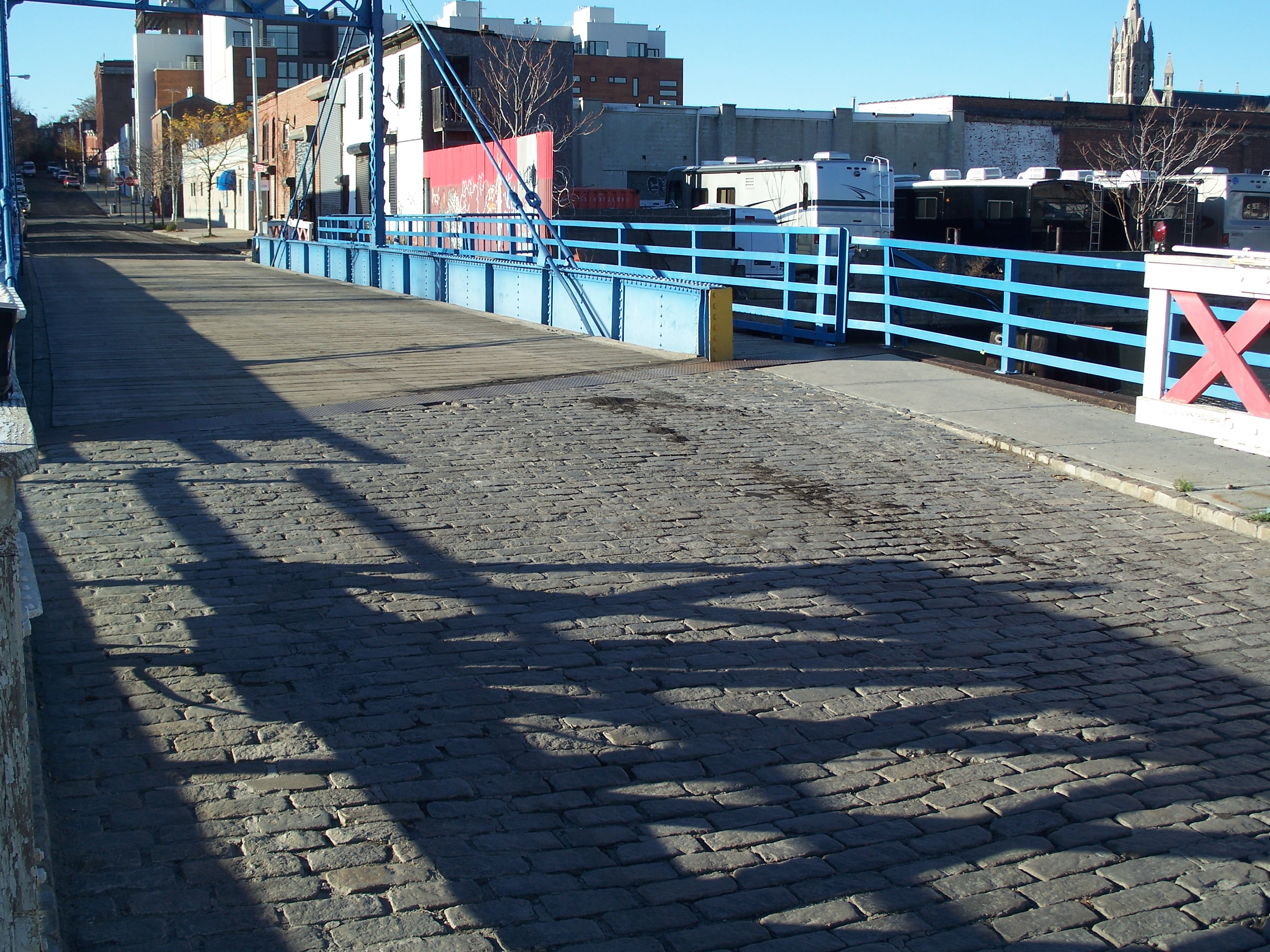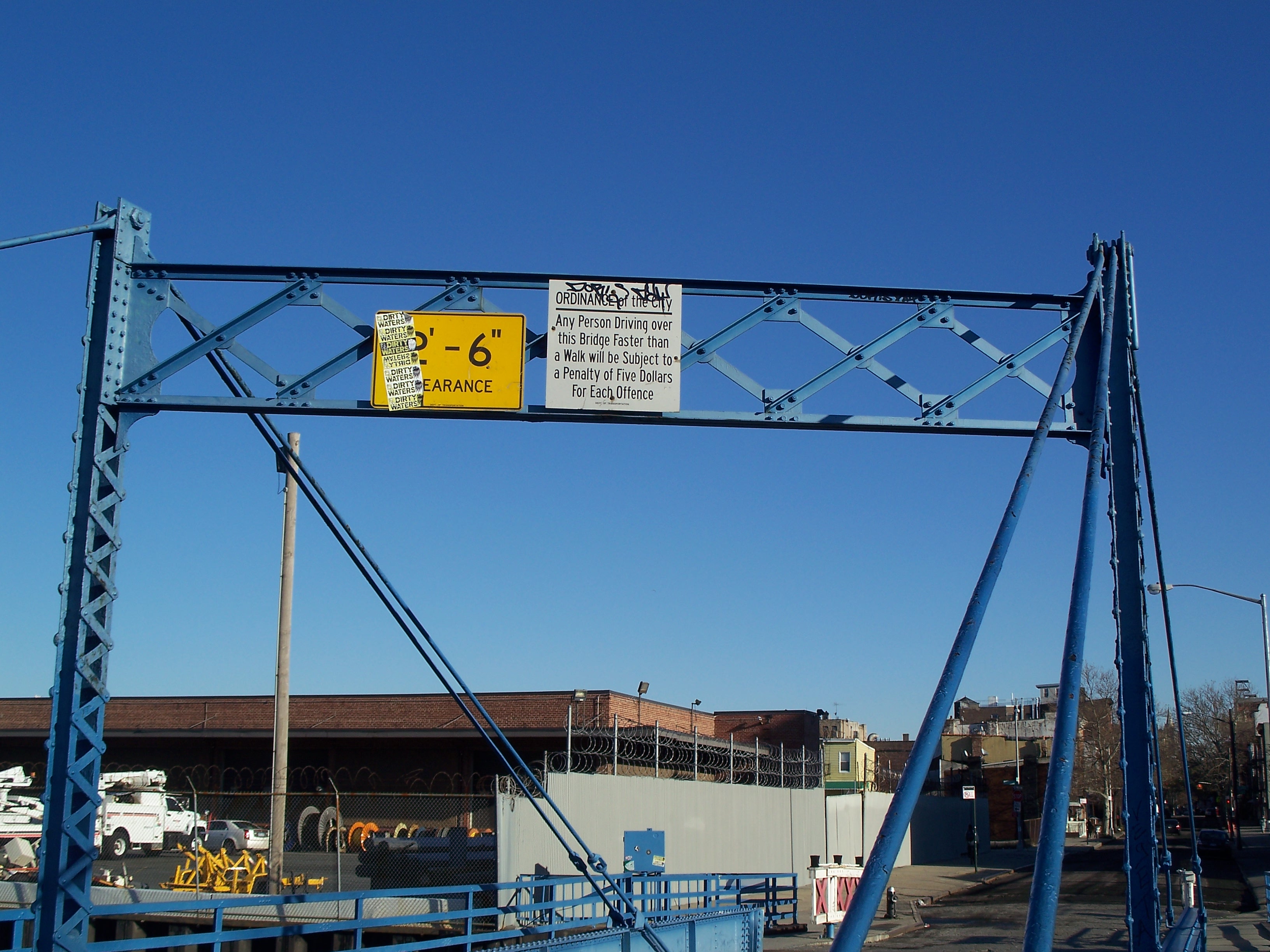 The Carroll Street Bridge (NYC BIN #2240260) opened in 1889 and is a very rare example of a retractile drawbridge in which the main span is slid back on rails diagonally to clear passage through the canal. It is also notable as a rare surviving example of a kingpost truss - in this case constructed with plate girders. The bridge was designed by engineers at the Brooklyn Department of Public Works and built by the New Jersey Steel and Iron Company (Trenton Iron Works), a subsidiary of the firm of Cooper, Hewitt and Co. The bridge is trapezoidal in shape with a 17-foot roadway and 4-foot sidewalks. The span is 63 feet with a total bridge length of 107 feet. The channel it clears is 38 feet wide.