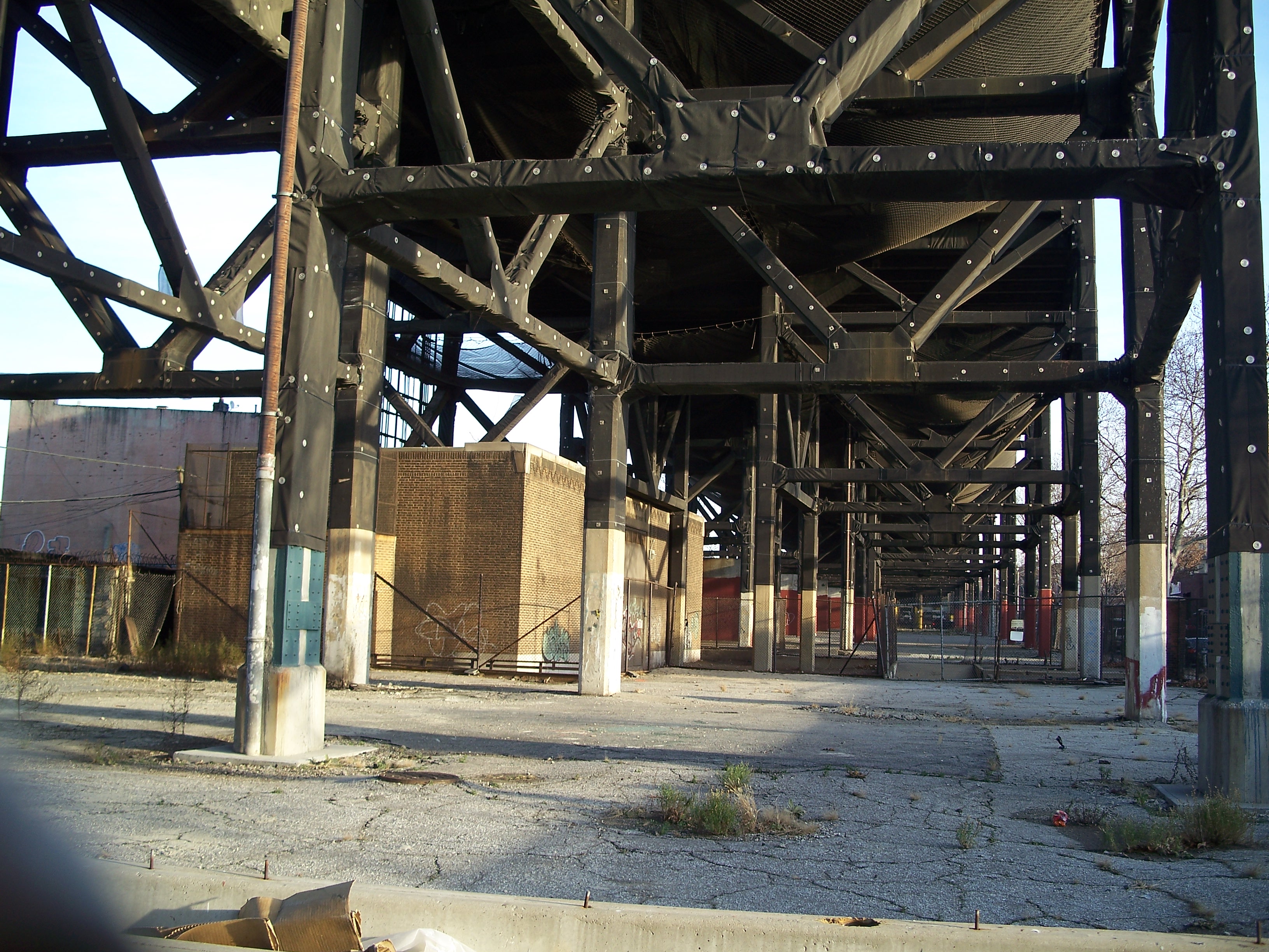 The viaduct concrete deteriorated considerably over the years and a fabric cladding was wrapped around the supporting structure to prevent chunks of concrete from falling off and causing damage or injury. (NY Times 2009).