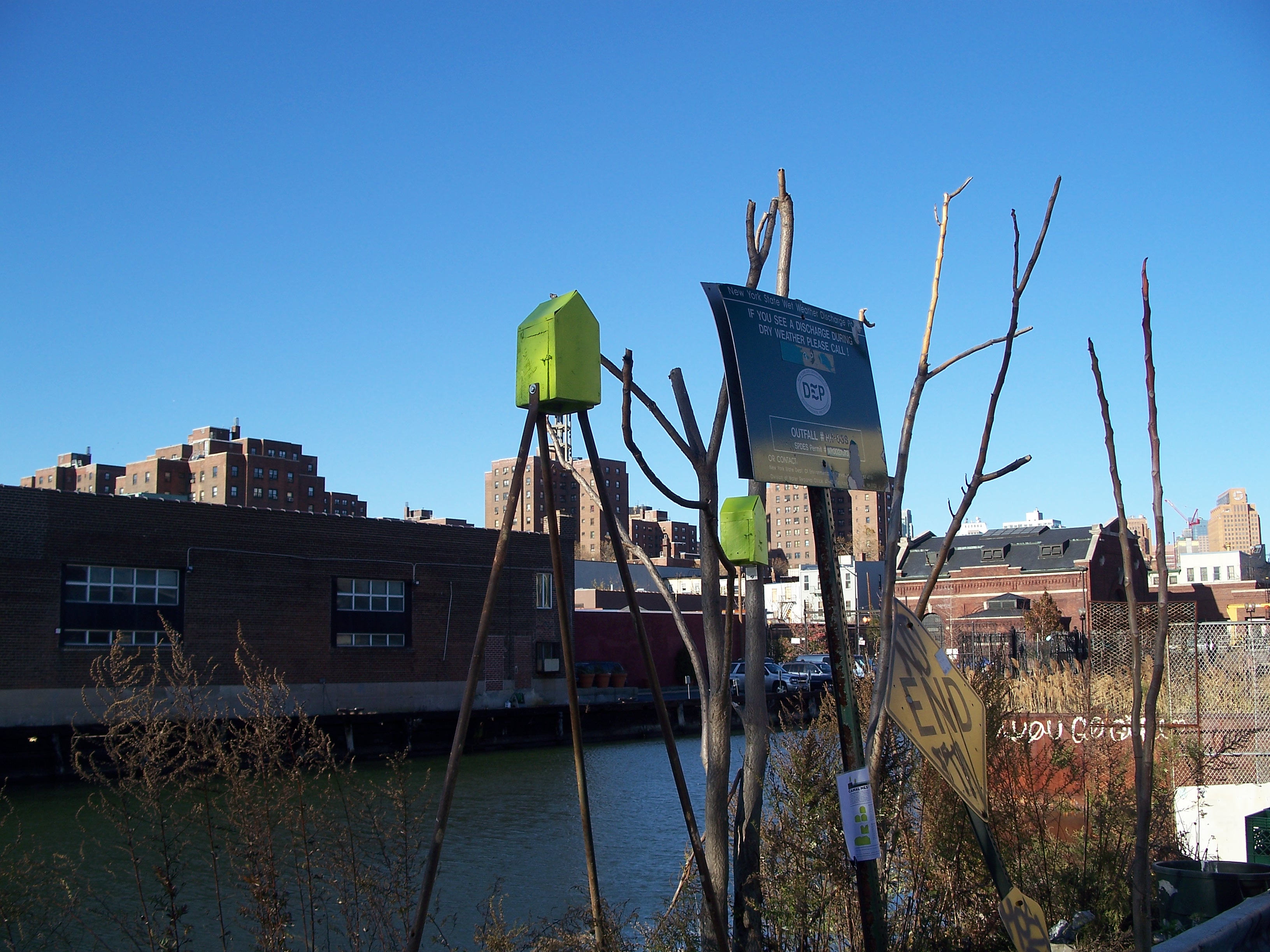Birdhouses on east bank at Degraw St