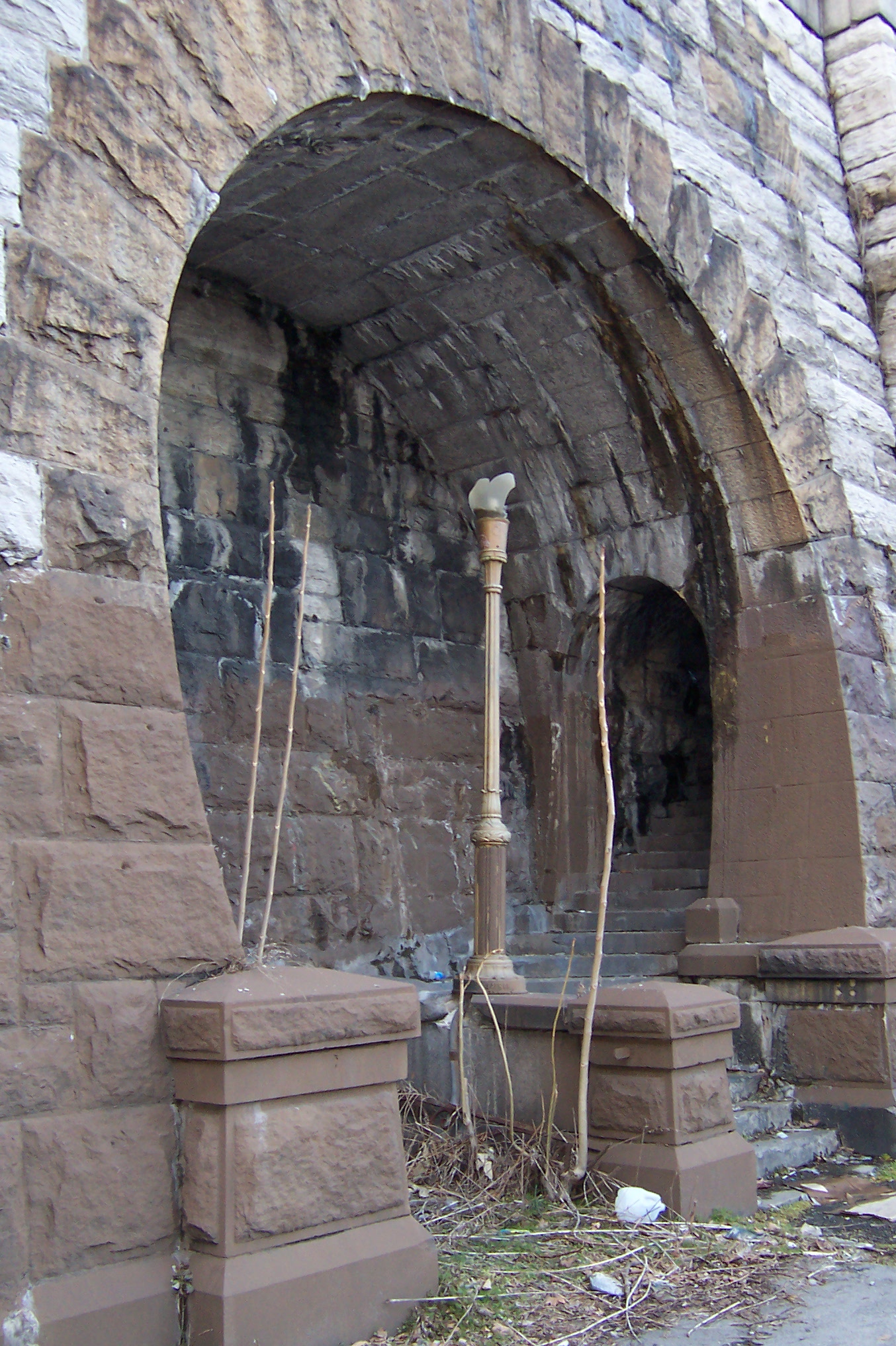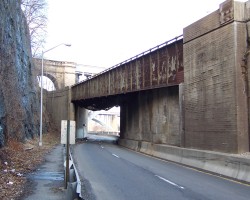 There is a stair and tunnel retaining wall structure between the Alexander Hamilton Bridge and Washington Bridge that leads from Highbridge Park down to a narrow pathway on the West side of the Harlem River Drive. It was built as part of the New Croton Aqueduct (ca. 1885-1893) which crosses under the river at that spot. On 21 January 1897, during the course of construction of Shaft #25 (a vertical shaft on the Manhattan side of the river that met the horizontal water tunnel under the river) there was a rock slide at the cliff near the work site. This structure is the second of two built to stabilize the cliff, and included the ornamental stairway to allow pedestrian access to what was then the new Harlem River Speedway. It is stylistically similar to a likewise abandoned structure on the other side of the island by the George Washington Bridge. (thanks to Michael Miscione for this info)