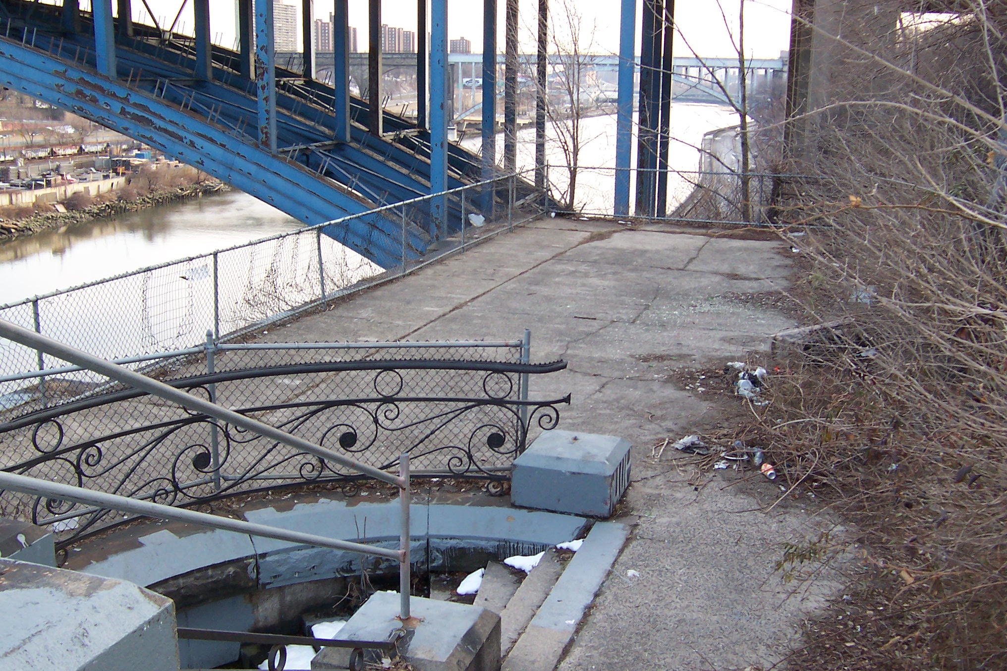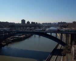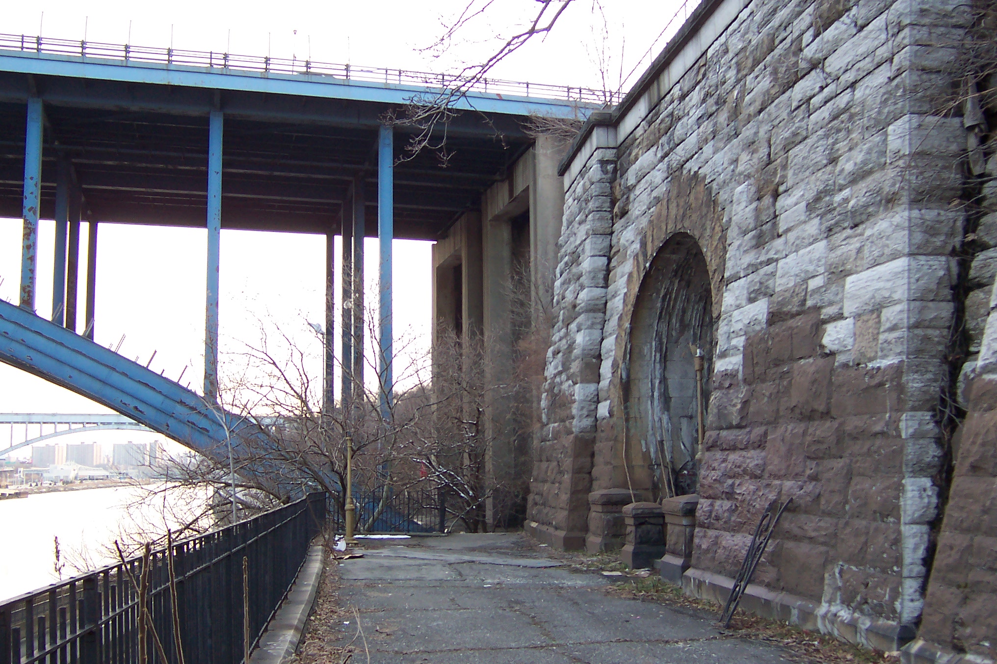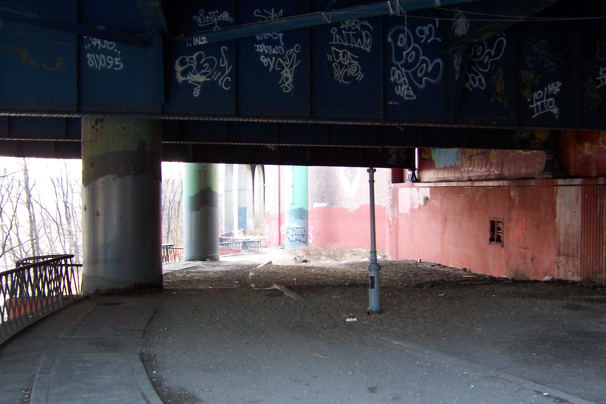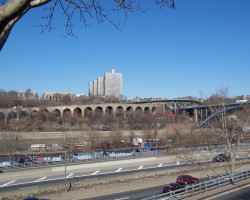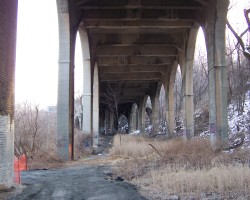 The approaches to the Alexander Hamilton Bridge are a nightmarish maze of spaghetti viaducts. The brick and concrete arched approaches from the Southwest are especially interesting. The smell of campfires indicates refuge for a few homeless people. A gentlemen in fatigues approached me menacingly, but only asked for a cigarette (I don't smoke) and didn't seem too upset that I couldn't accomodate him.