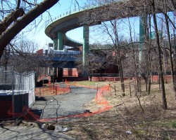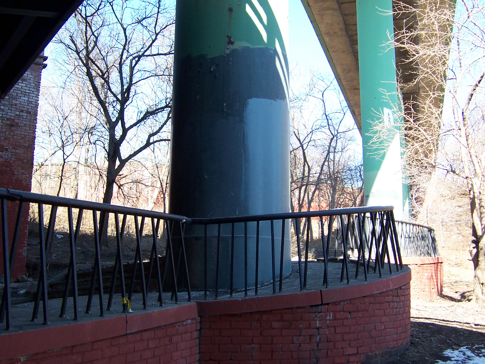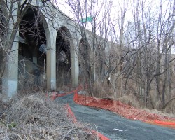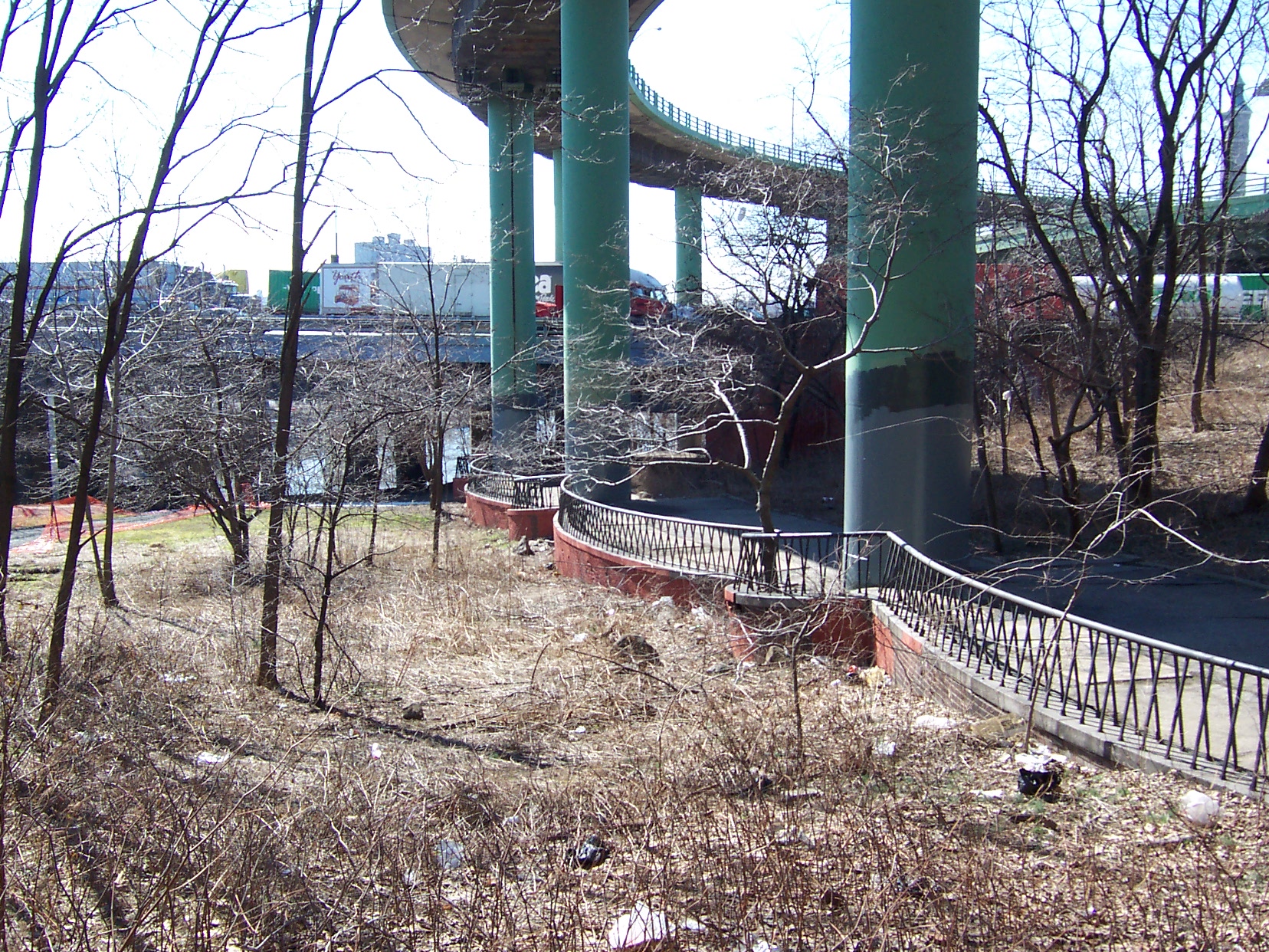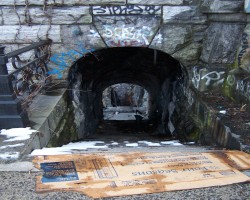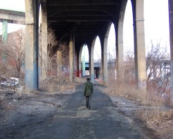 The approaches to the Alexander Hamilton Bridge are a nightmarish maze of spaghetti viaducts. The brick and concrete arched approaches from the Southwest are especially interesting. The smell of campfires indicates refuge for a few homeless people. A gentlemen in fatigues approached me menacingly, but only asked for a cigarette (I don't smoke) and didn't seem too upset that I couldn't accomodate him.