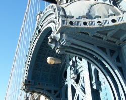 The Manhattan Bridge connects lower Manhattan at Canal Street with Flatbush Avenue in Brooklyn. The design features a 1,470-foot suspension span that was originally configured to carry four lanes of vehicular traffic, eight rail lines (on two decks) and two pedestrian walkways. In the 1940's the decks were reconfigured to carry seven lanes of vehicles and four subway tracks. The bridge was designed by Leon Moisseiff with approaches designed by Carrere and Hastings. Serious structural problems were discovered in 1978, forcing an emergency closure and 26 years of reconstruction.