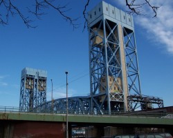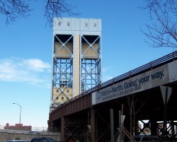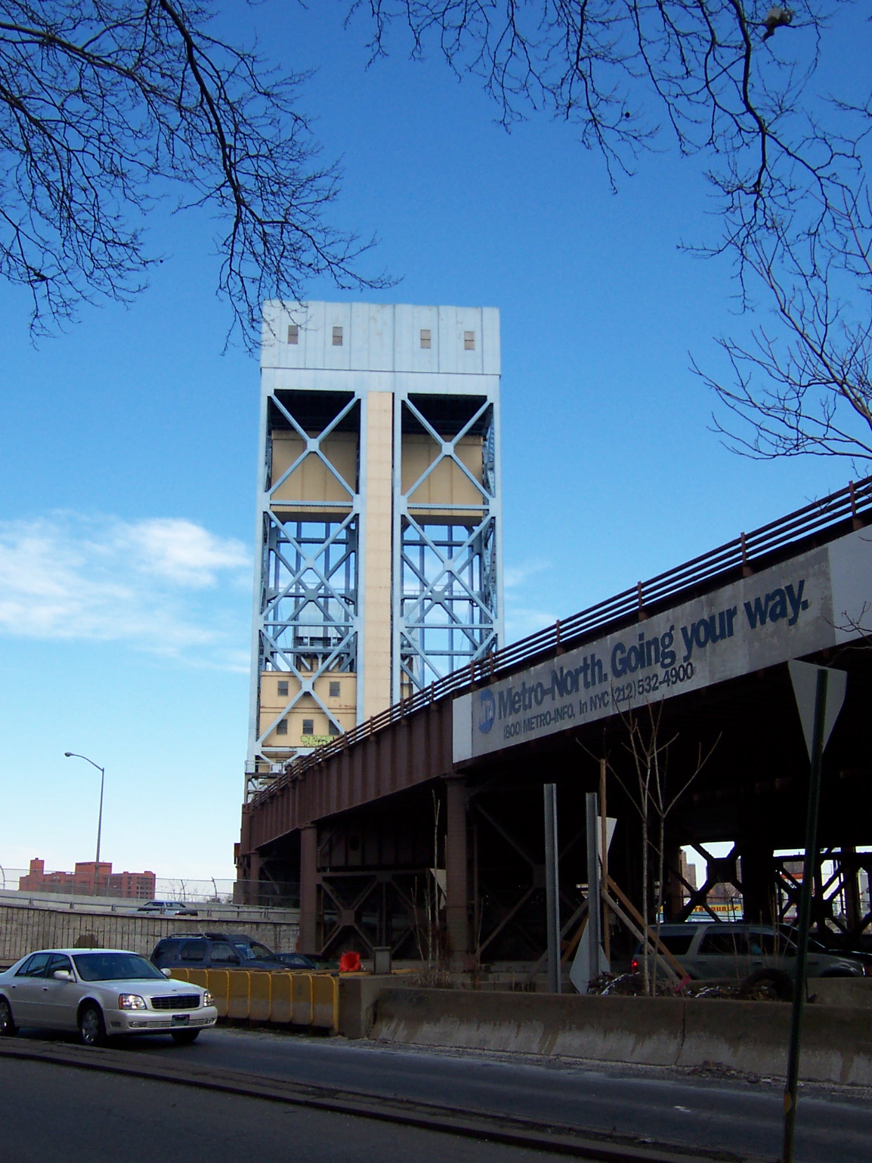 The Park Avenue Bridge carries the Metro-North commuter rail lines across the Harlem River at 135th Street. It is a lift bridge with two parallel 340-foot double-track spans. There is no path for pedestrian traffic. The bridge opened in 1956 and was owned by numerous struggling rail companies before falling into the hands of the MTA. As with so much other postwar American infrastructure, the bridge power and lift systems are no longer operational.