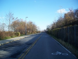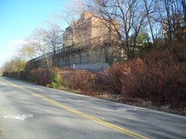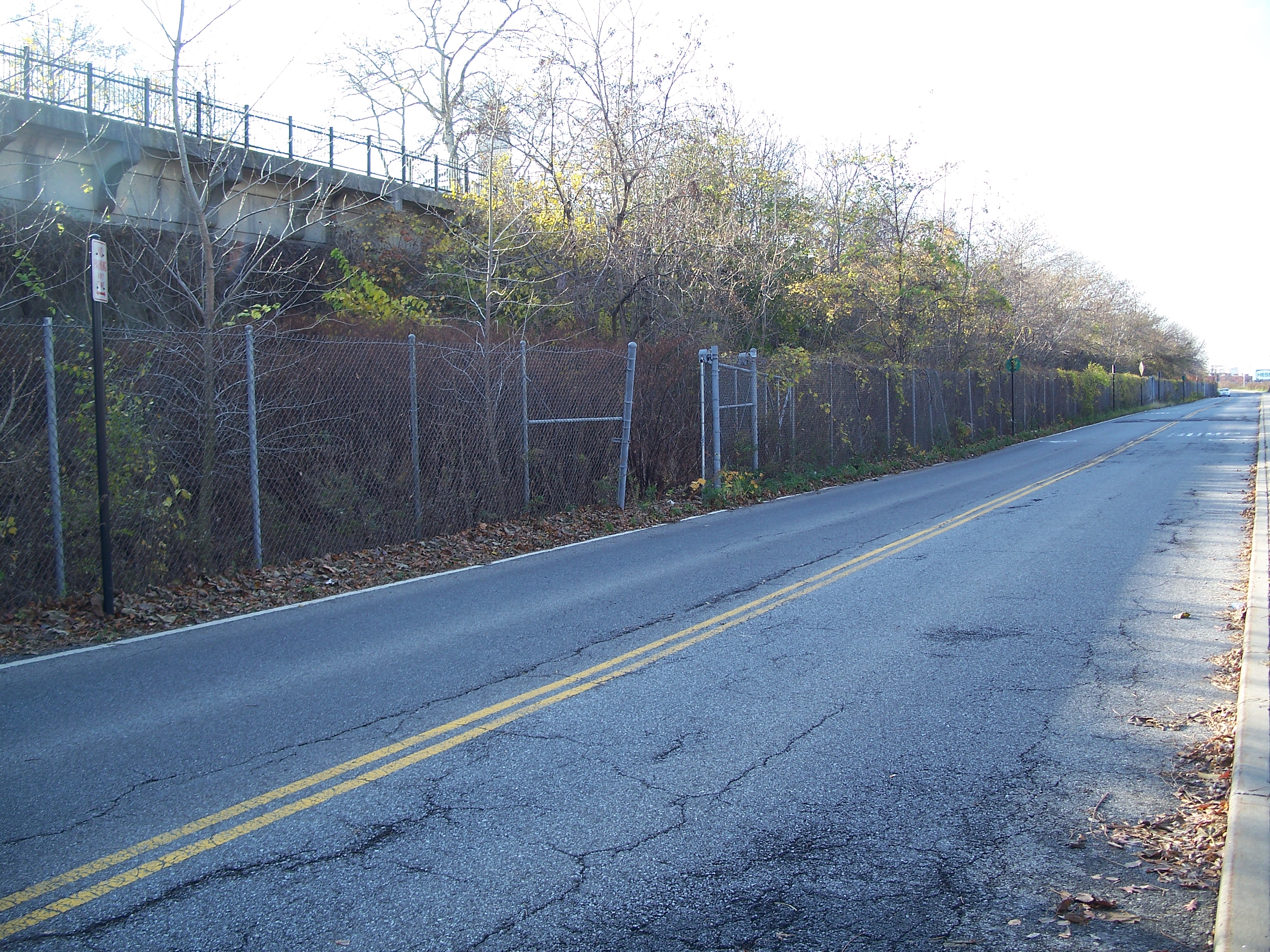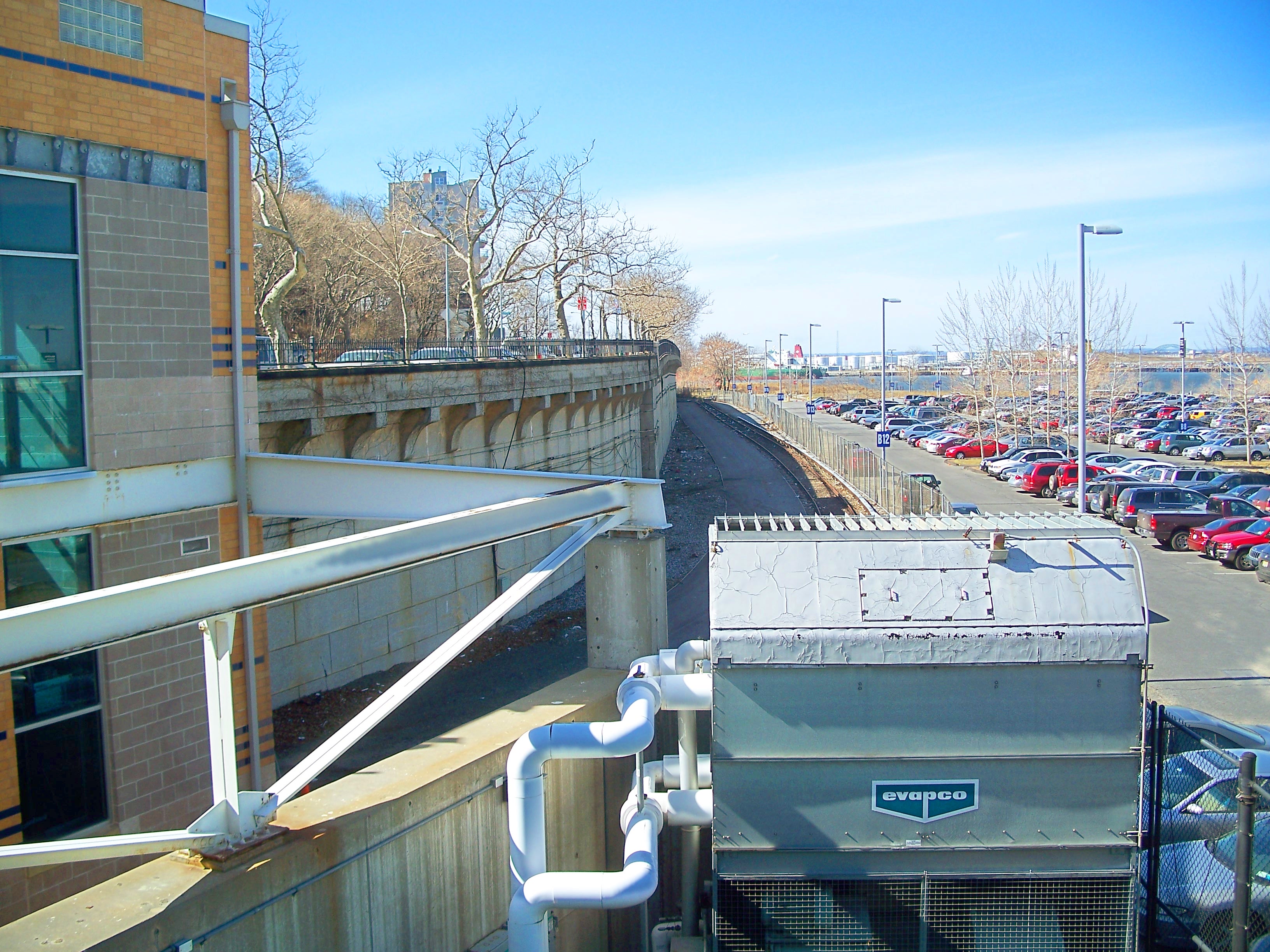The intact ROW (overgrown and with no track) continues directly alongside Richmond Terrace to the site of the (now-defunct) New Brighton stop at the foot of Jersey Street. Reactivation of the ROW would entail moving Bank Street (which runs parallel to the ROW and is used to access the parking lot from Jersey Street) around 20 feet away from the ROW.