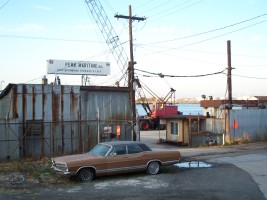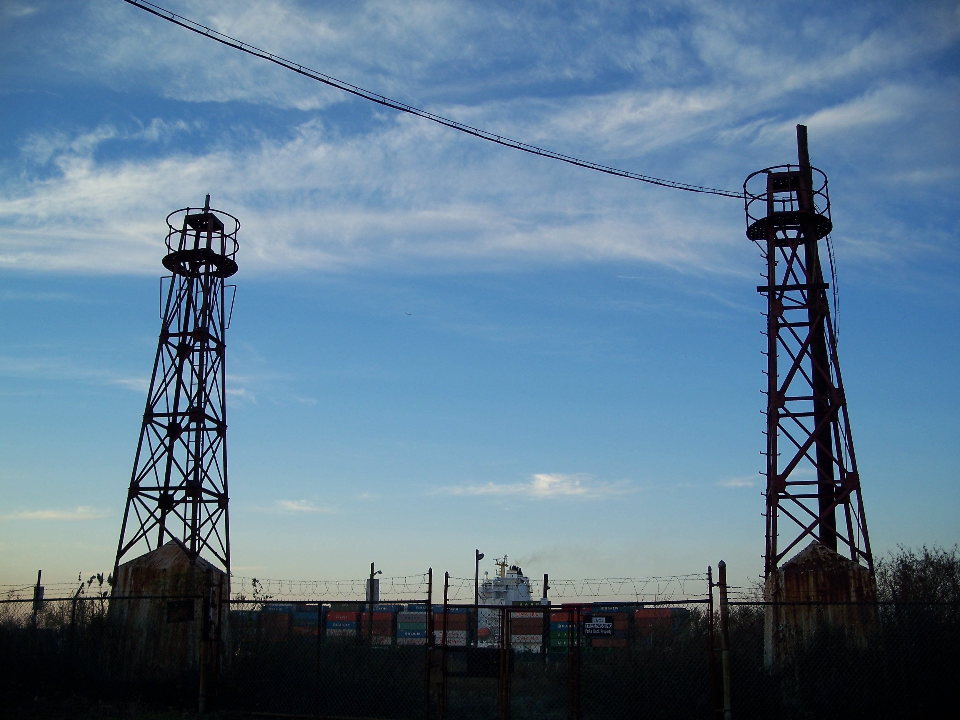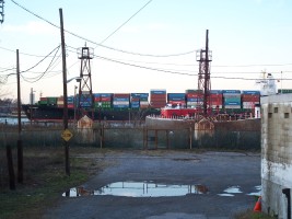 ROW at foot of Tompkins Ct., Container ship on Kill van Kull