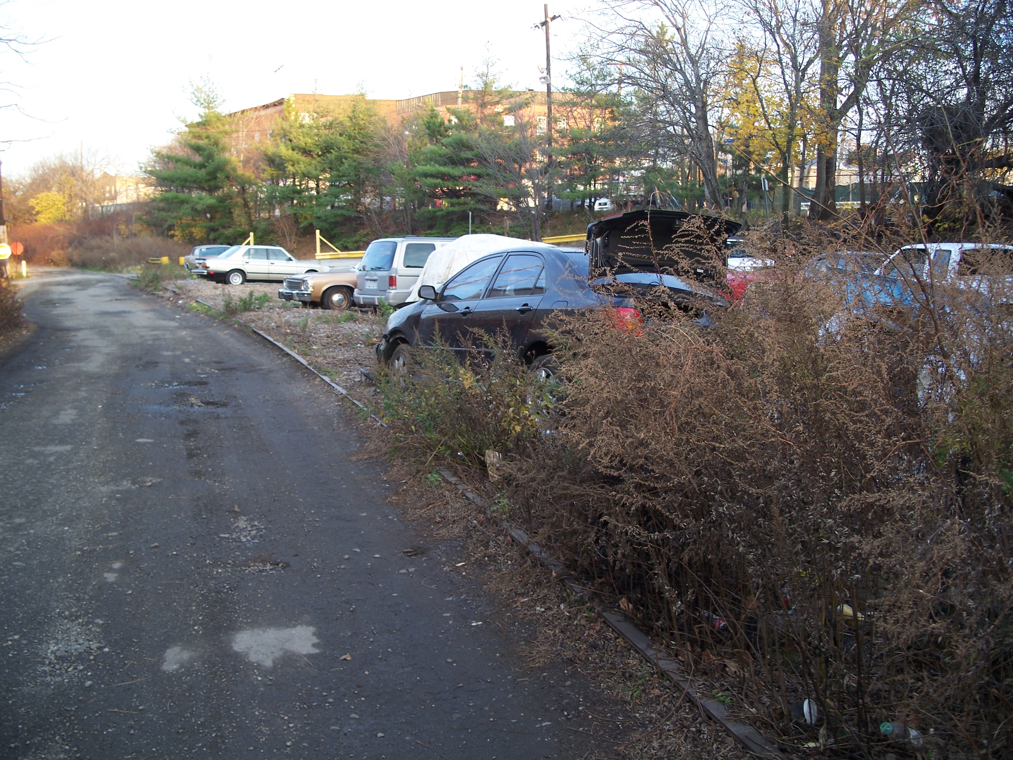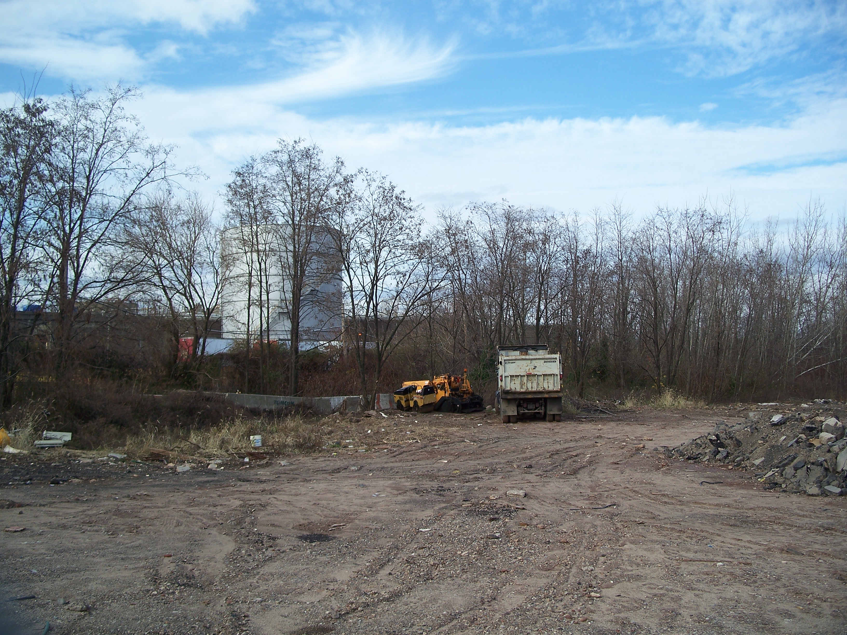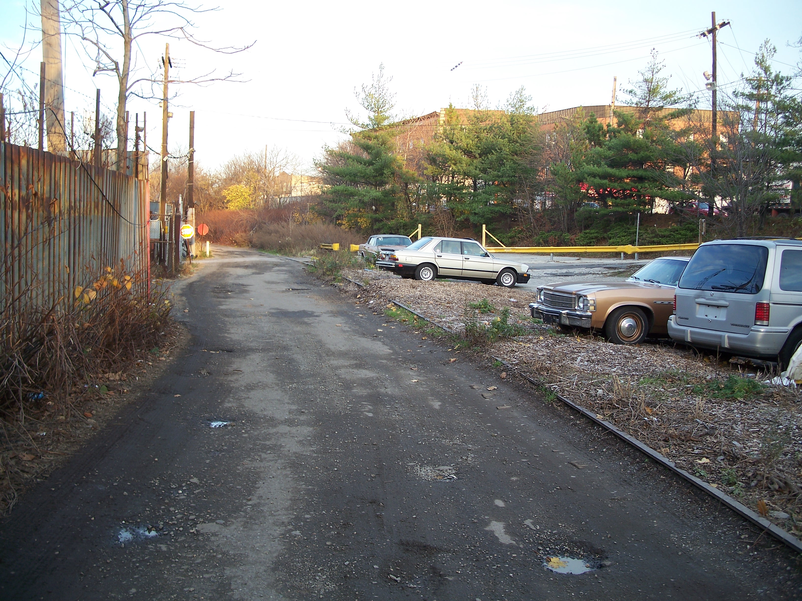 The ROW narrows in this area and runs through active industrial property, notably the Caddell shipyard. Much of the ROW is being used for storage but no permanent structures have been built on it. Elevation and relocation of the track above grade would presumably be required to preserve the businesses here.