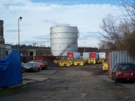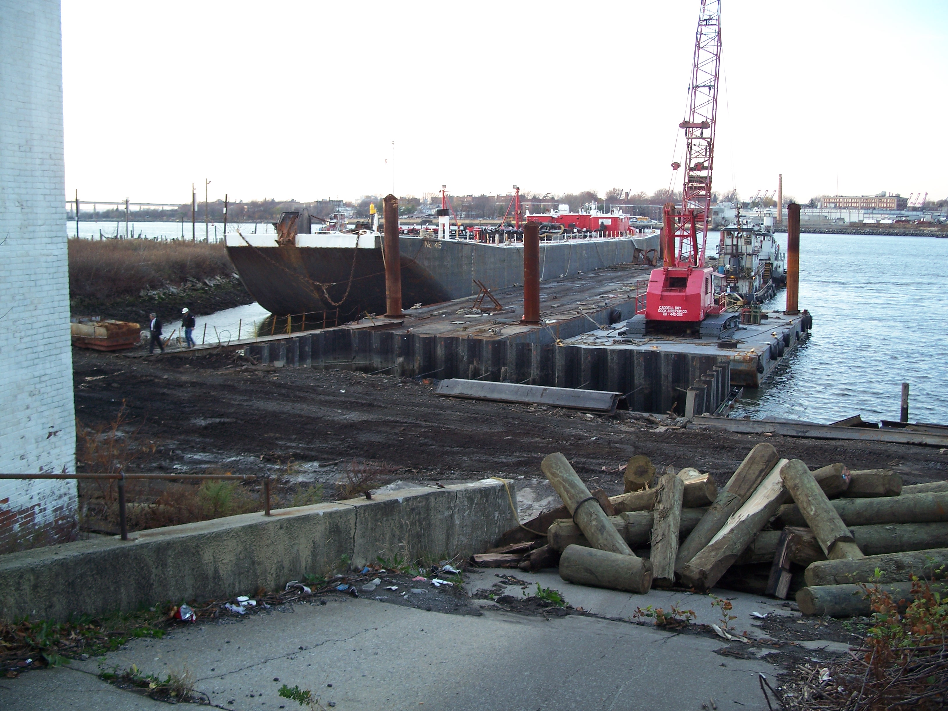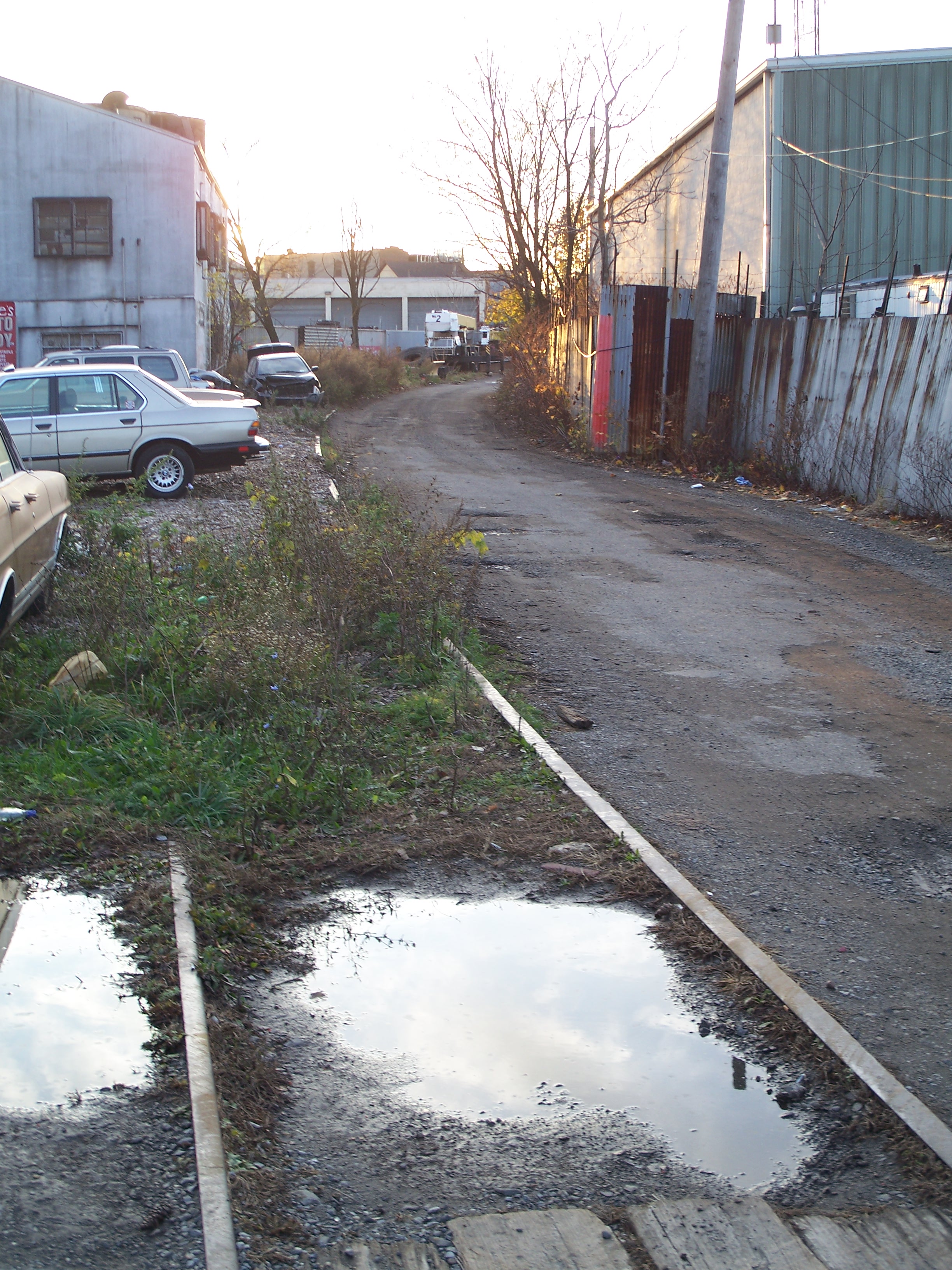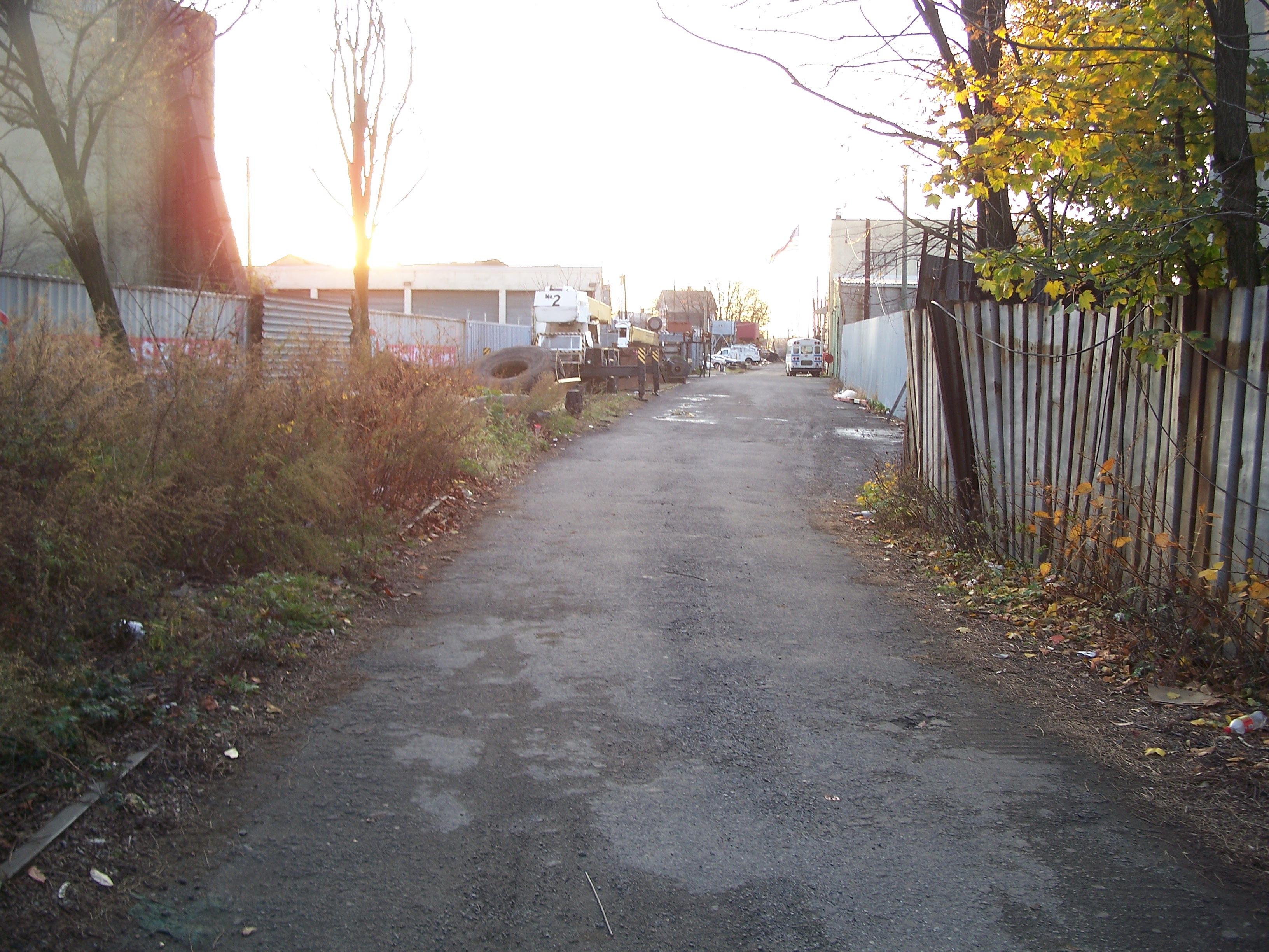 The ROW narrows in this area and runs through active industrial property, notably the Caddell shipyard. Much of the ROW is being used for storage but no permanent structures have been built on it. Elevation and relocation of the track above grade would presumably be required to preserve the businesses here.