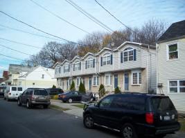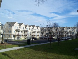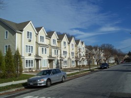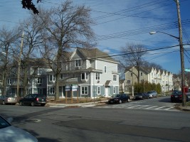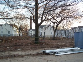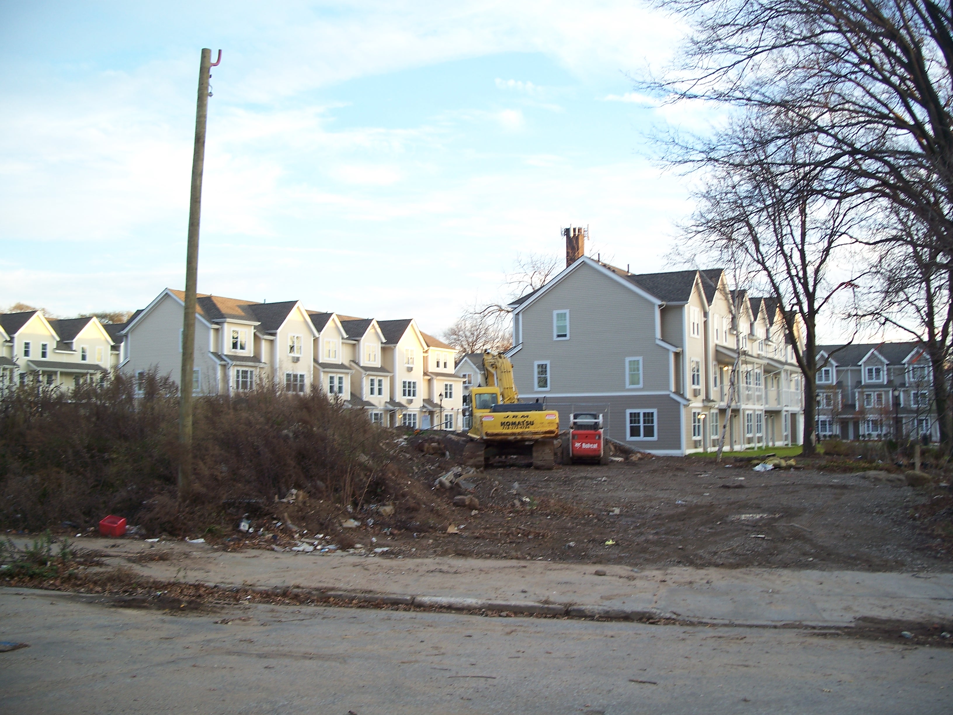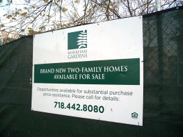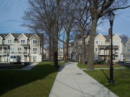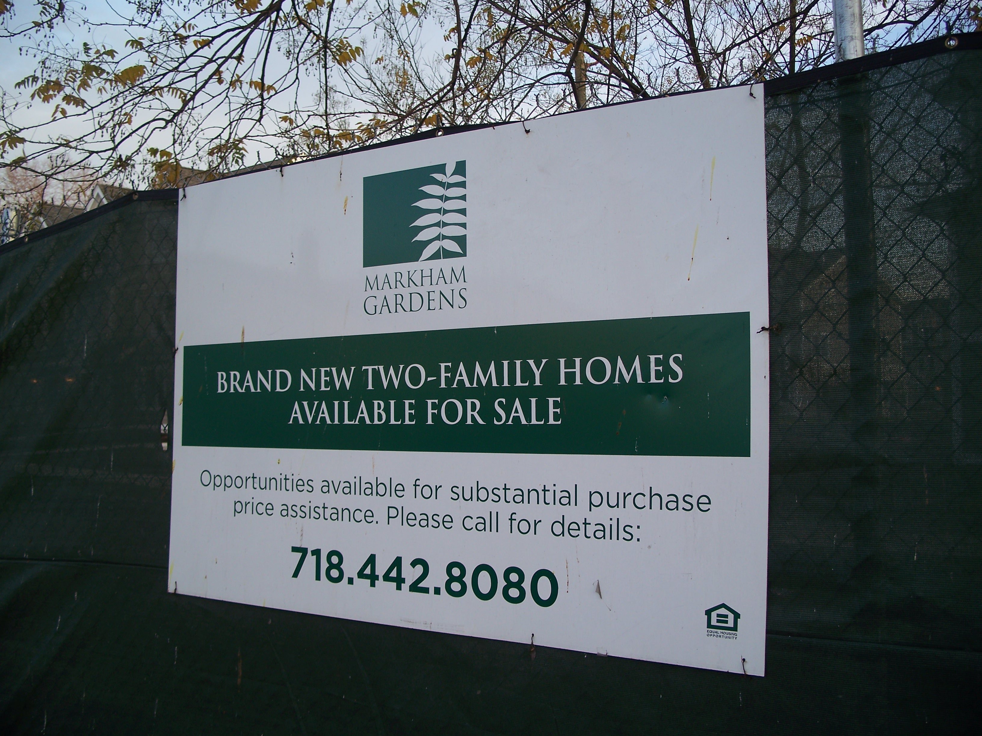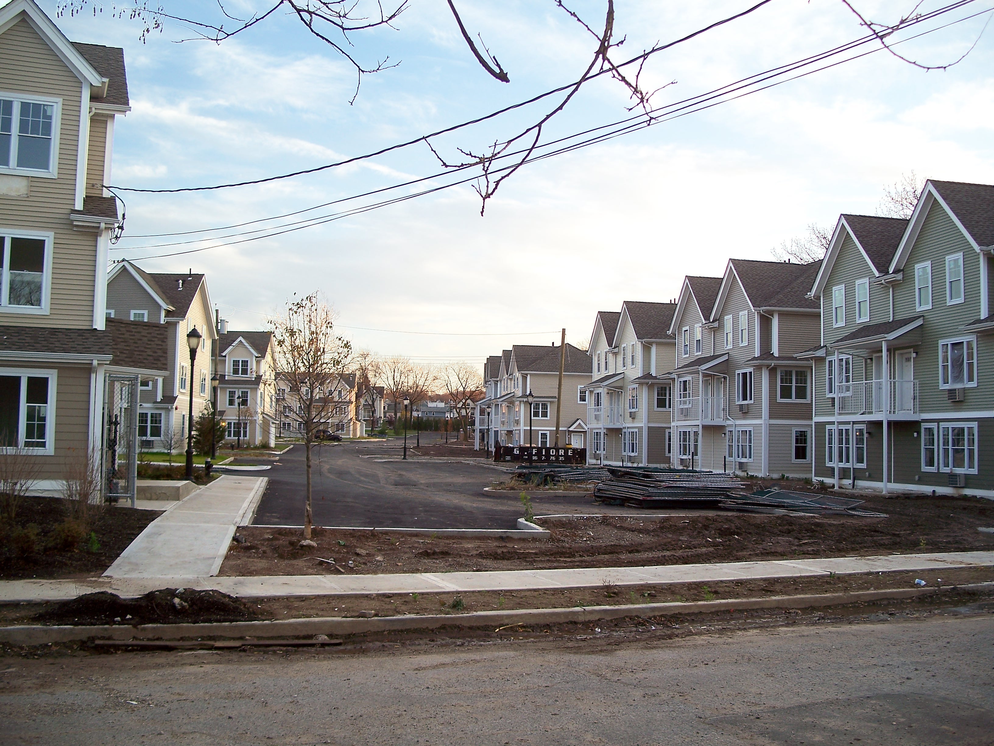 Markham Gardens sits just to the south of the rail line in West Brighton. It was originally built in 1943 as housing for workers in nearby shipyards that were extremely active during WW-II. The 23 two-story buildings were small and frail and were emptied in 2004 to be replaced by subsidized private redevelopment. The new Markham Gardens includes 240 mixed-income rentals, 25 attached two-family homes and senior housing. The hope is that the new buildings will solve the physical woes and the mixed-income structure will solve the spiritual woes, although urban renewal projects invariably involve insensitive displacement in an attempt to dissipate critical masses of poverty. A new rail station just steps away would be a nice amenity as well. (NYC.gov 2009, SILive.com 2009)