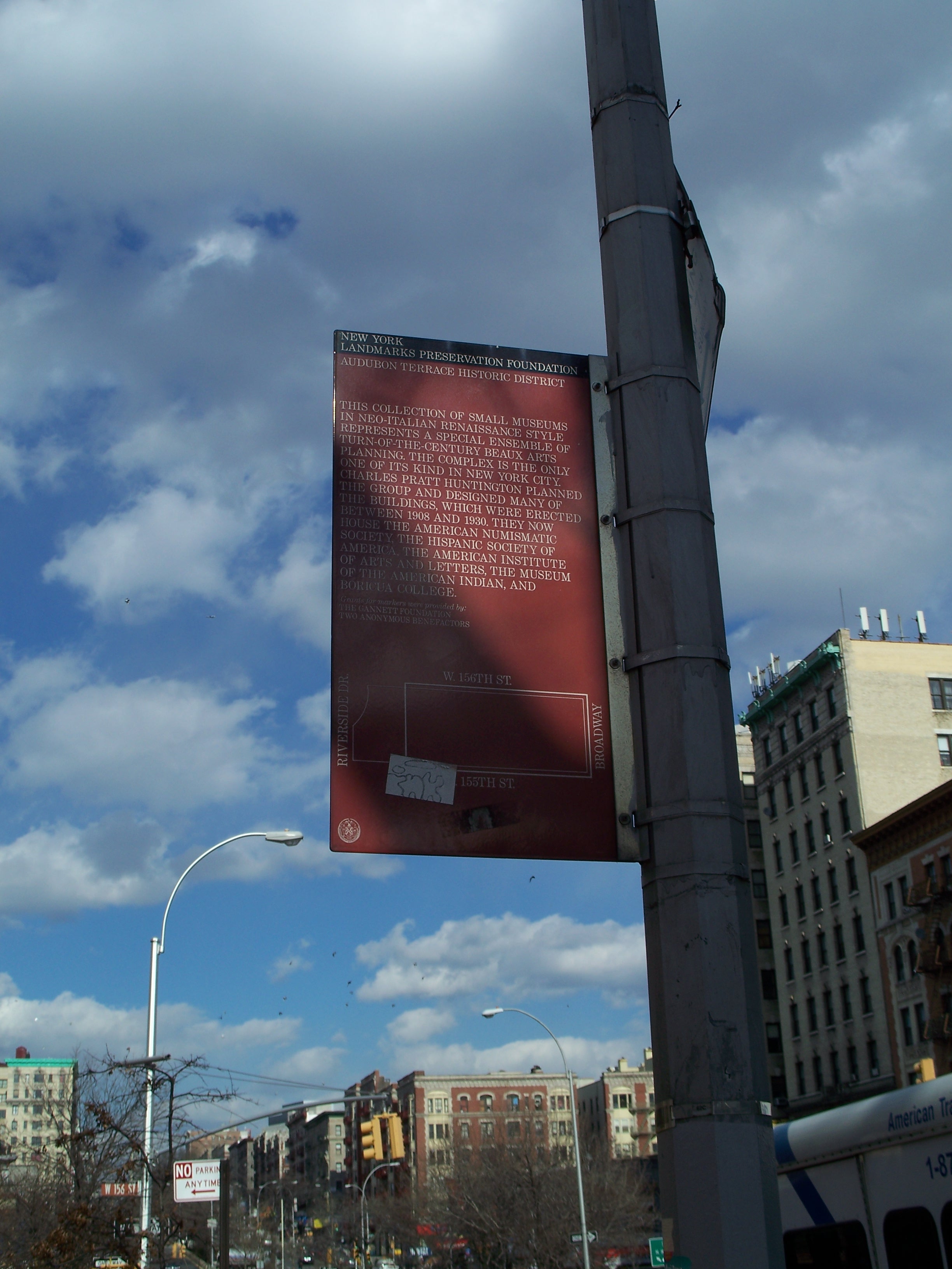 The complex originally included The Hispanic Society (opened 1908), The American Academy and Institute of Arts and Letters (opened 1923), The American Numismatic Society (opened 1908), The American Geographical Society, The Church of Our Lady of Esperanza (consecrated 1912) and the Museum of the American Indian-Heye Foundation (opened 1922).