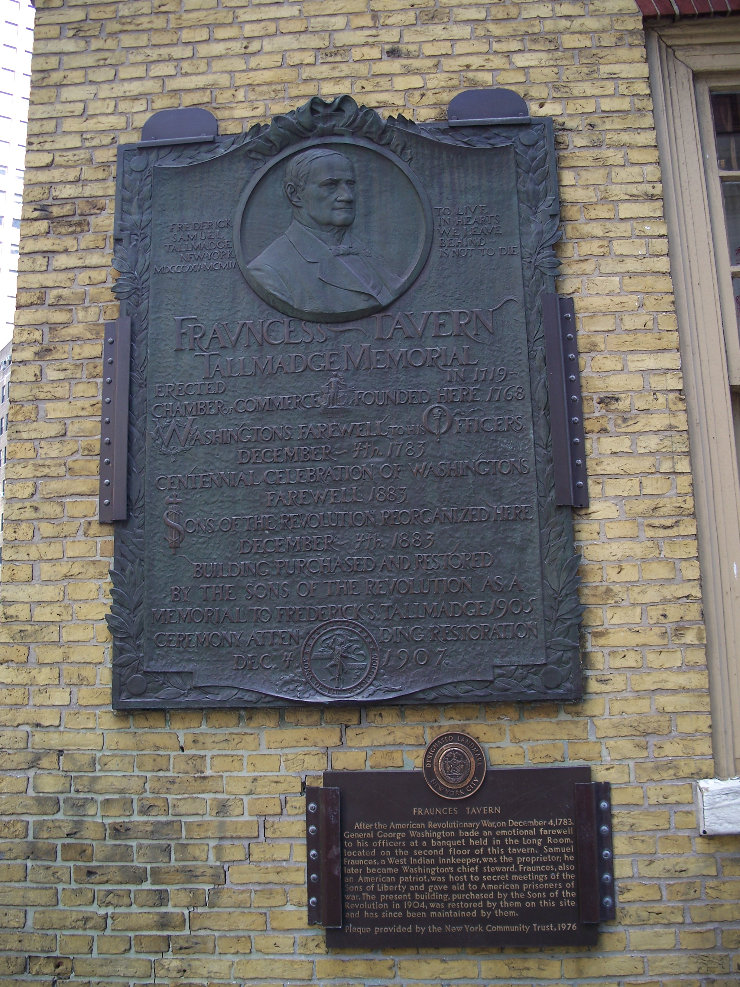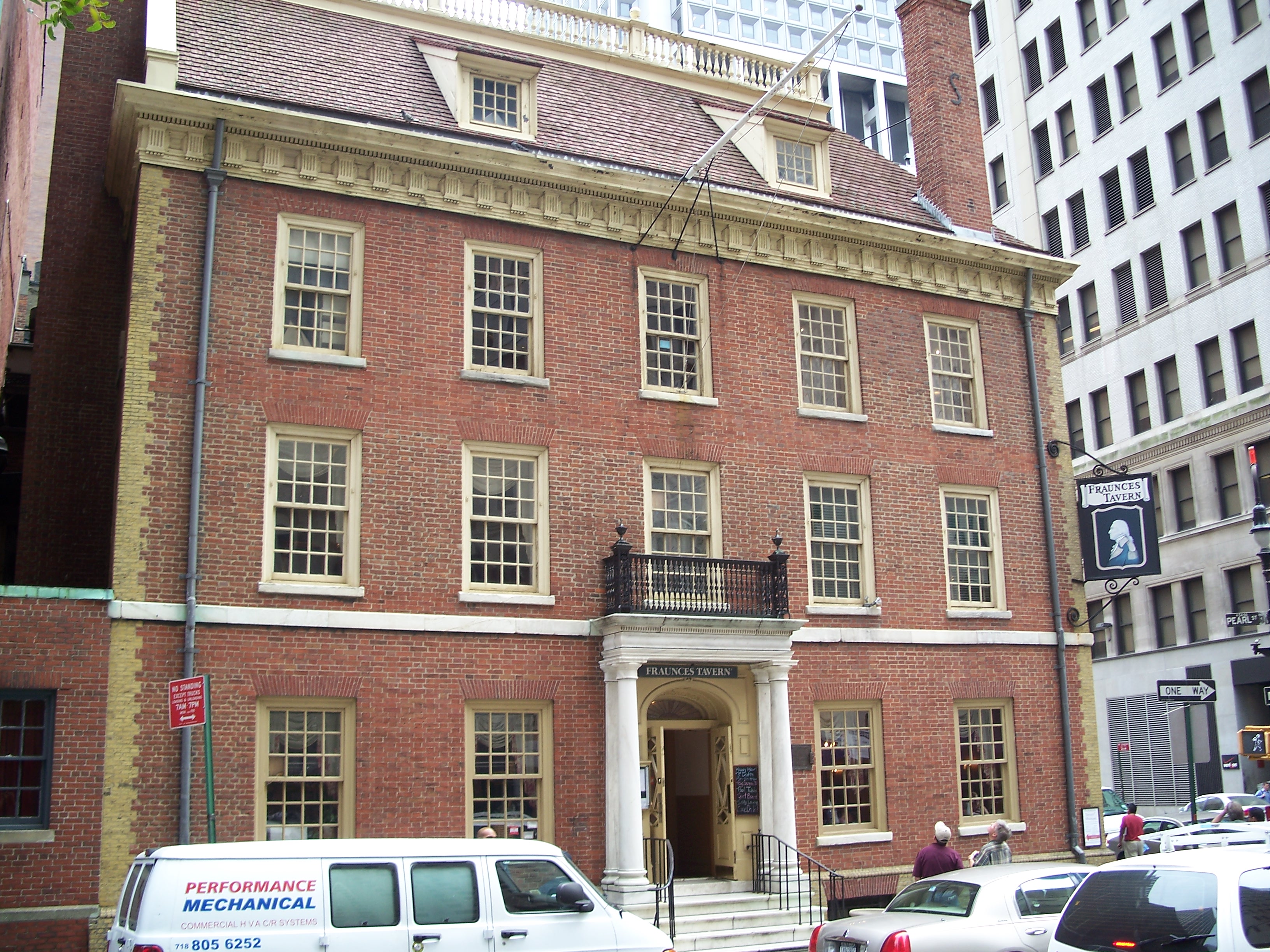 A building was constructed on this site by Stephen De Lancey sometime between 1719 and 1722. After serving a variety of residential and commercial uses, it was opened as a tavern by Samuel Fraunces in 1762. It subsequently became the site of significant political and business activity, perhaps most notably George Washington's 1783 farewell dinner with his troops after the conclusion of the Revolutionary War.