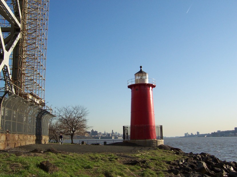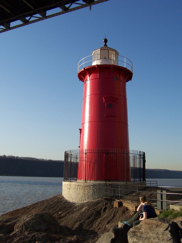 The Little Red Lighthouse is located under the George Washington Bridge on the Manhattan side. It was originally built in Sandy Hook, New Jersey in 1880 and was moved by the Coast Guard in 1921 to guide river traffic away from the shoals at Jeffrey's Hook. In 1942, the lighthouse became a legend when the children's book The Little Red Lighthouse and the Great Gray Bridge was written by Hildegarde Swift.