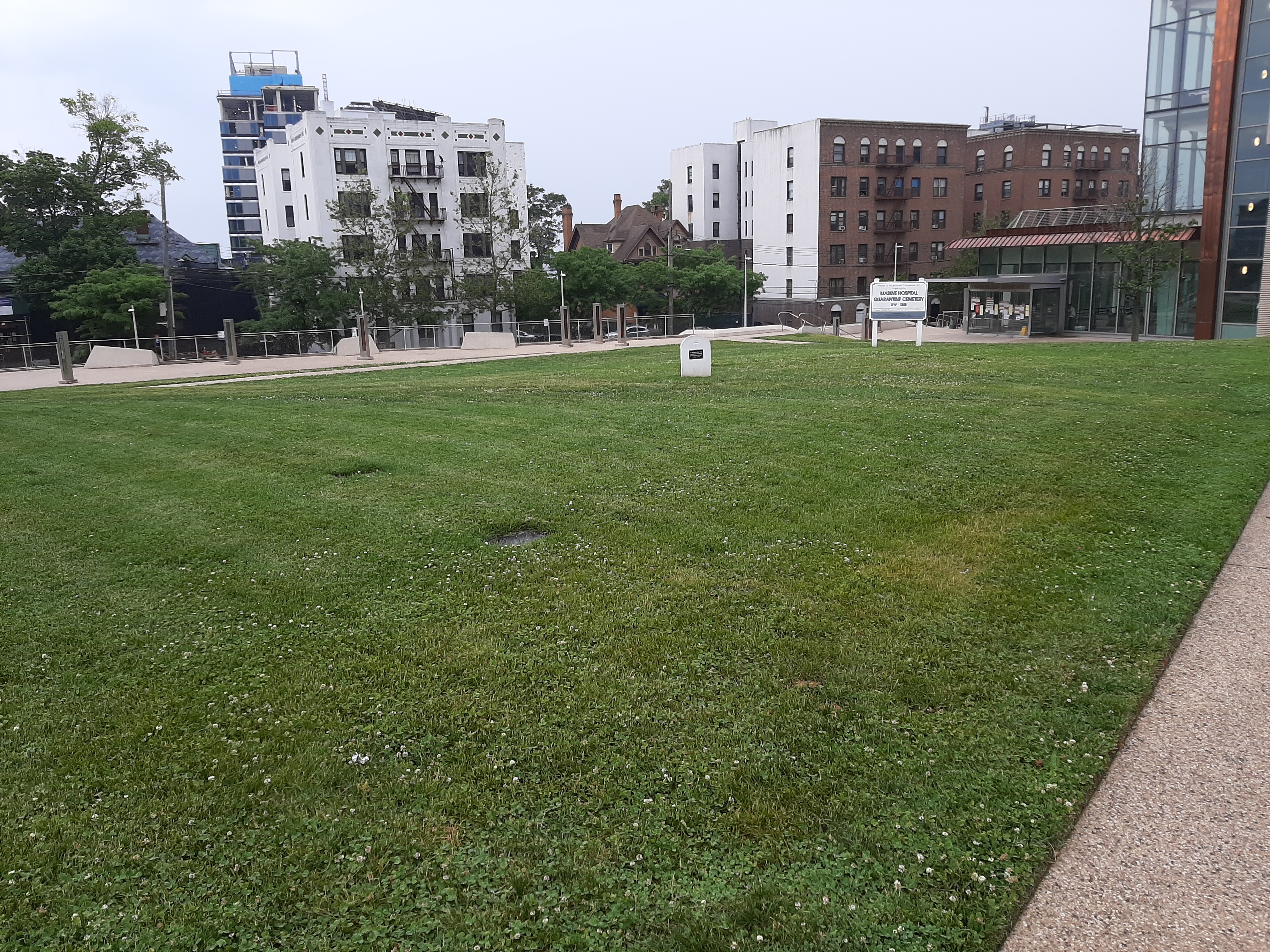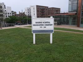 This site across from the St. George Theatre was part of the northern cemetery used for people who died in the Tompkinsville quarantine hospital. The site had been used as a parking lot from the 1950s until preparation for construction of a new court complex in 2003 led to discovery of human remains. The remains of 83 patients were recovered from the southern portion of the one-acre lot, and reinterred in this memorial green on the northern part of the lot, which was landscaped, but otherwise left undisturbed.