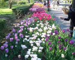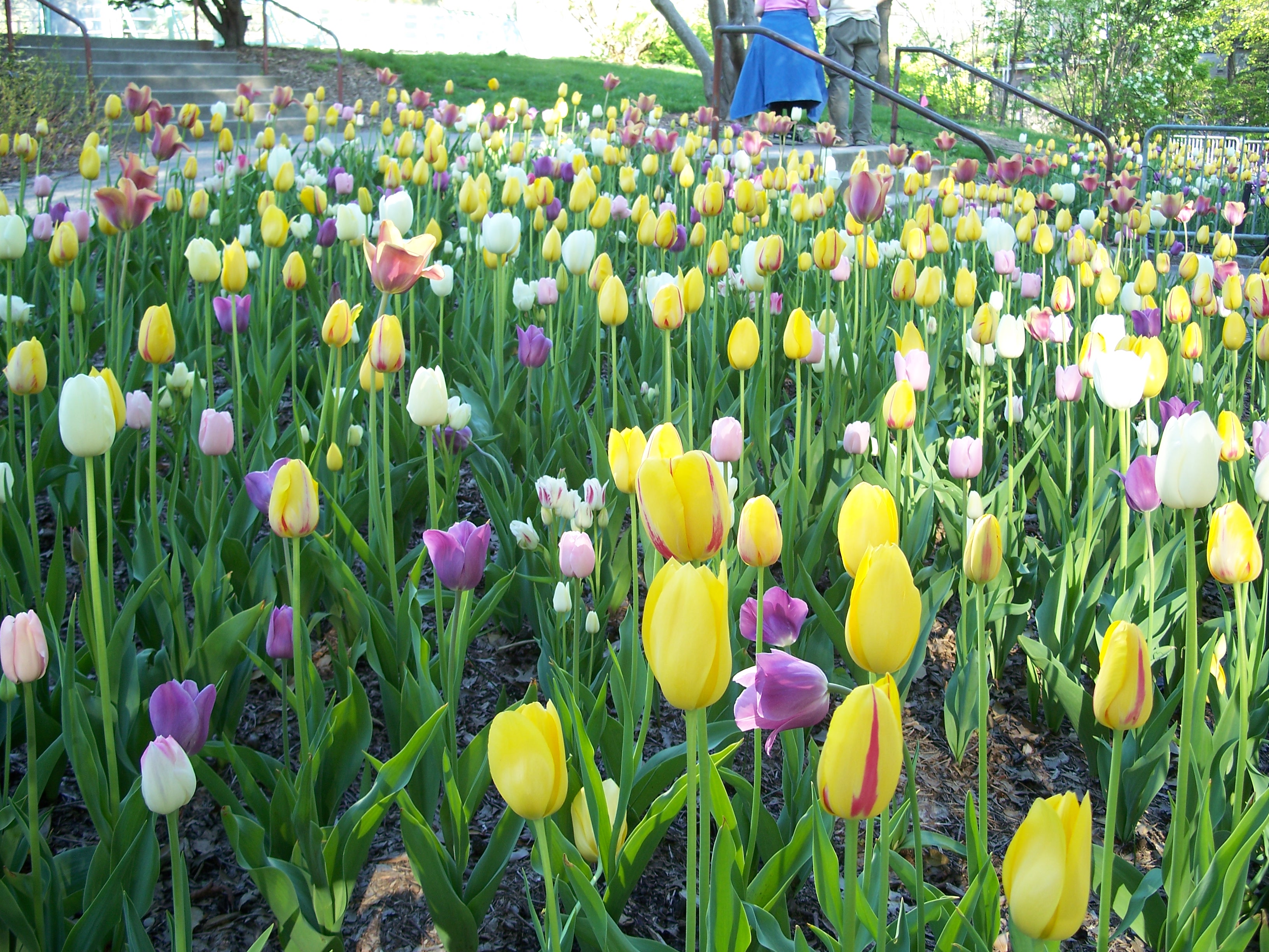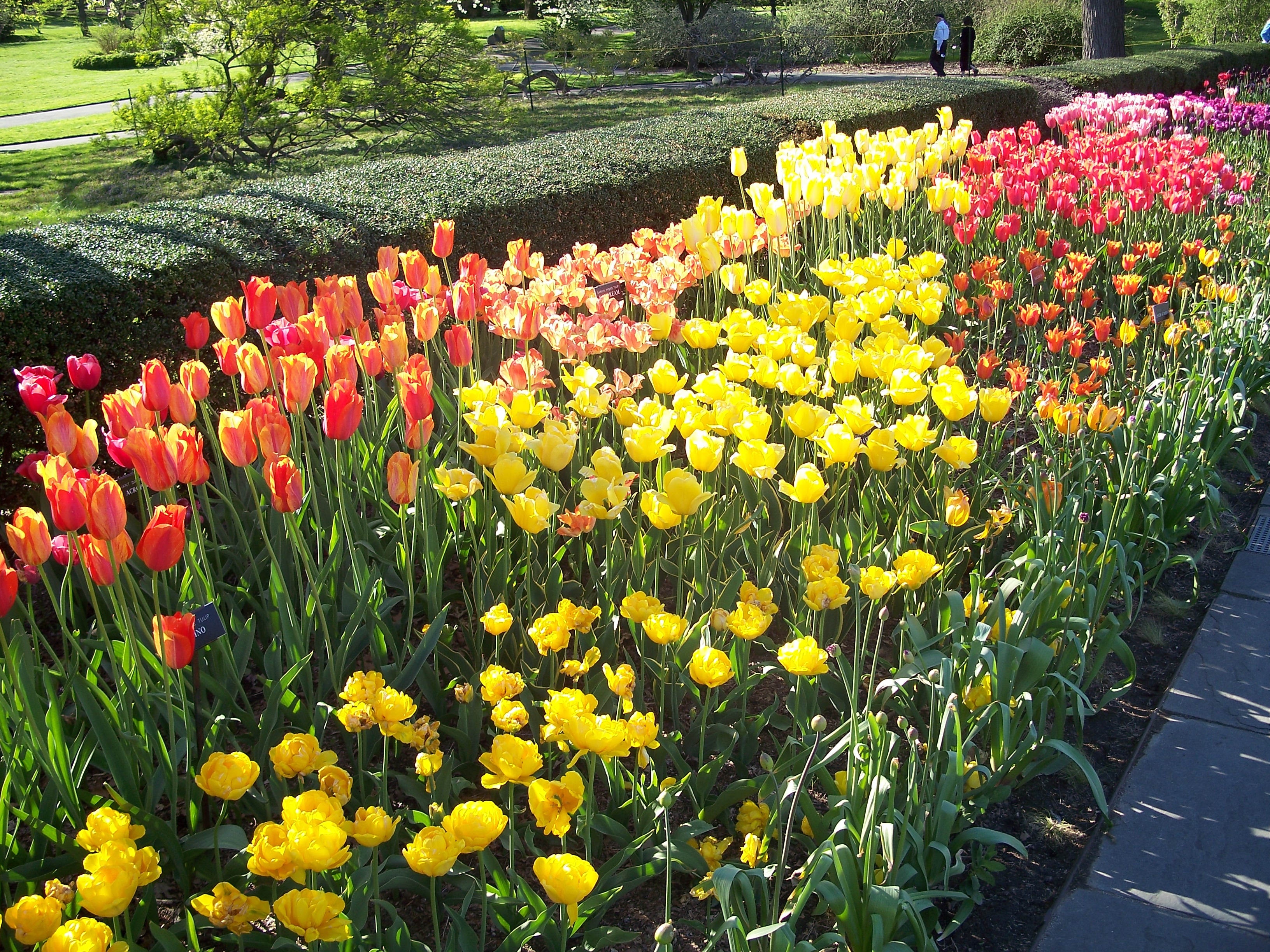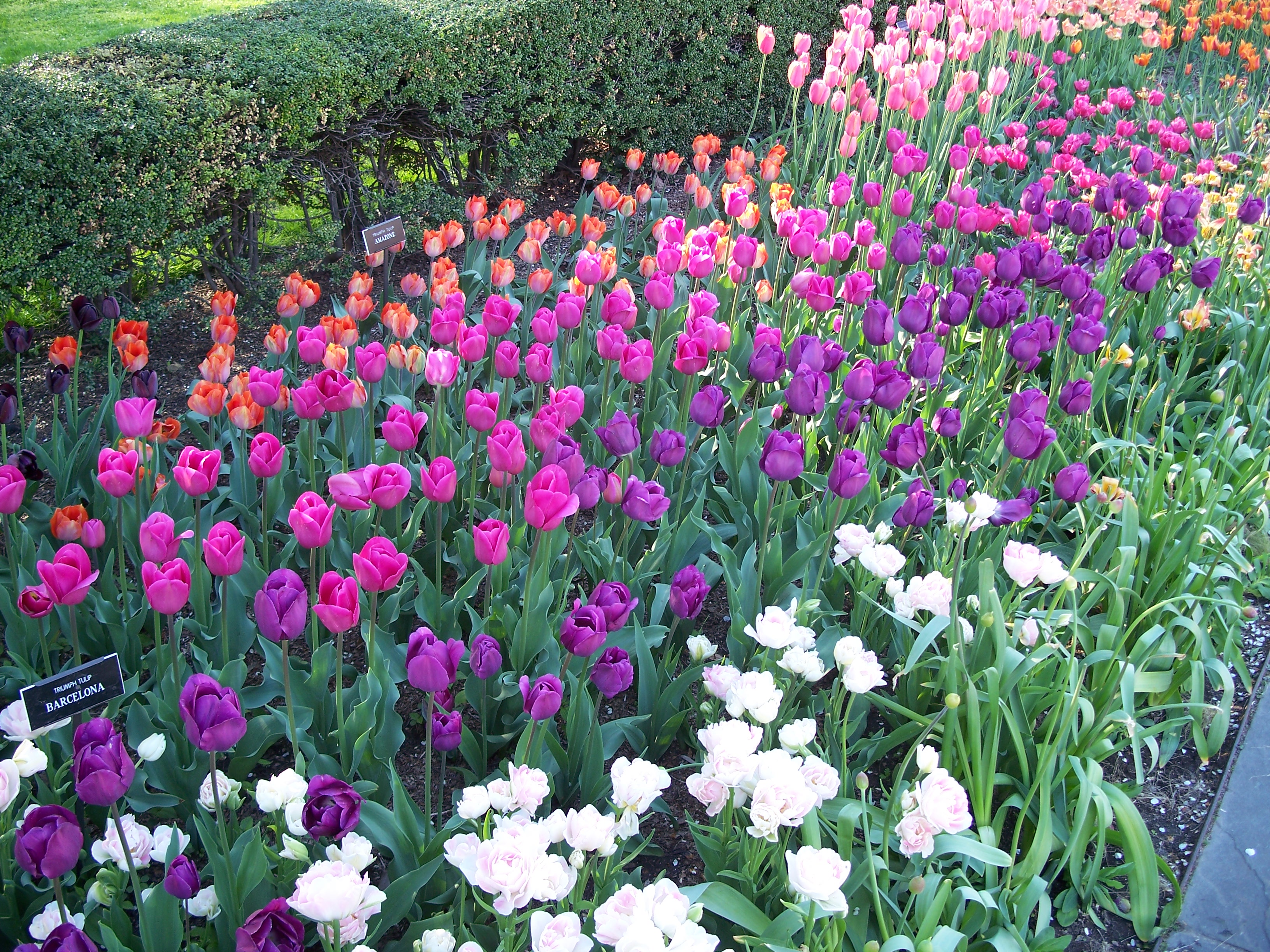 Spring features a rainbow of tulips. Flowering annuals replace them in the summer and fall.