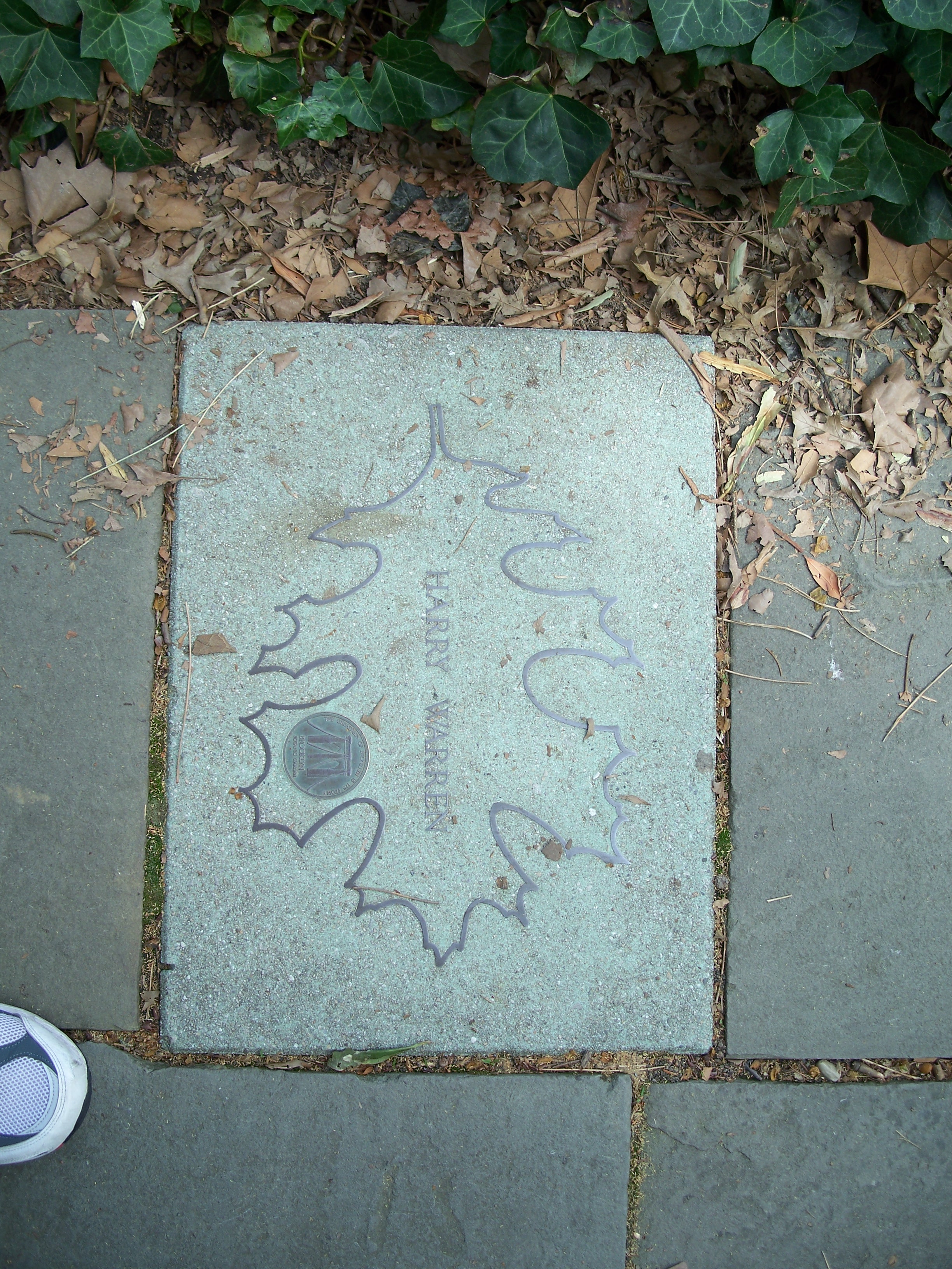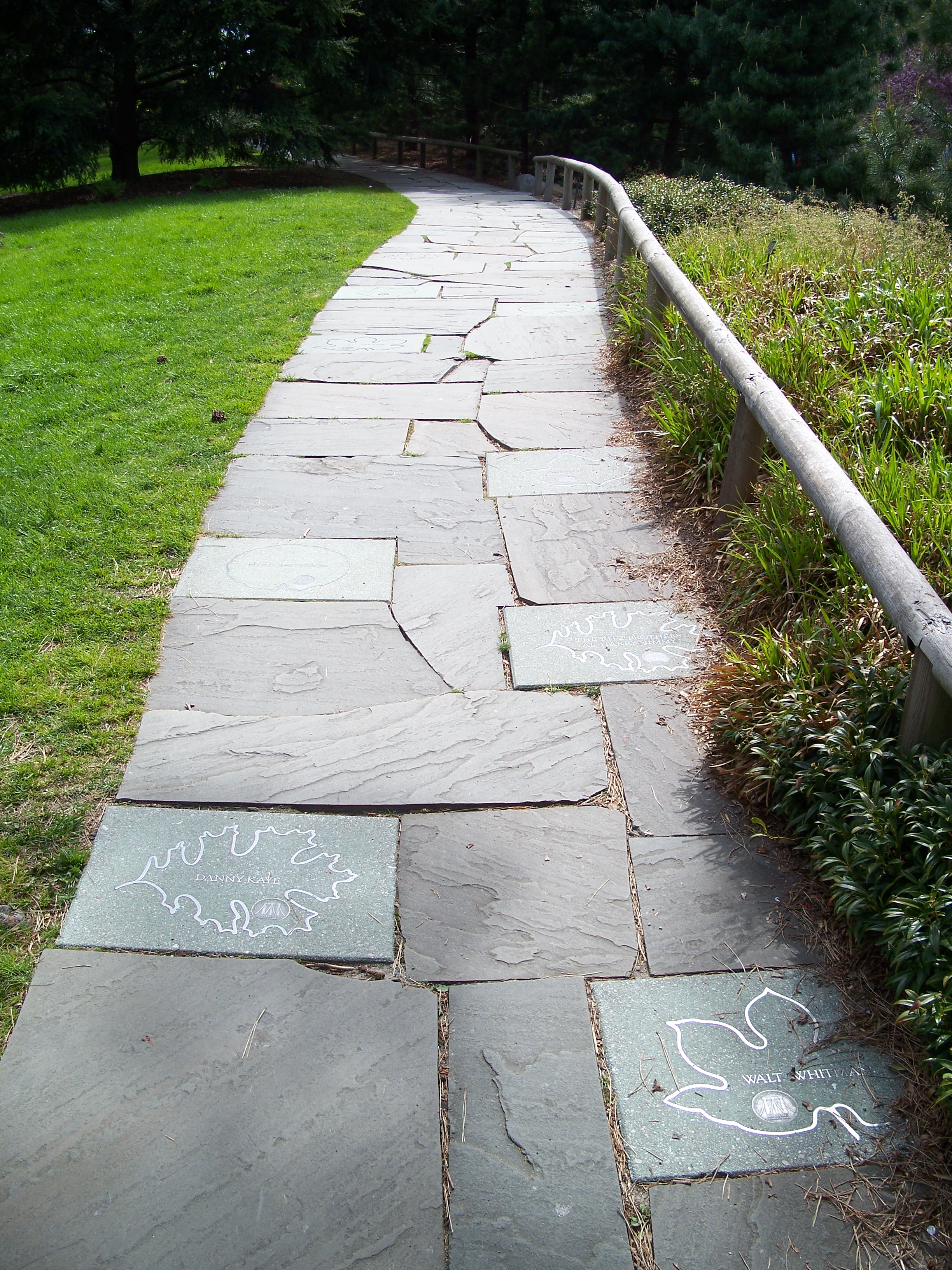 A path with stepping stones labeled with the names of famous Brooklynites. Lots of stars from the early 20th century with a few more recent luminaries.