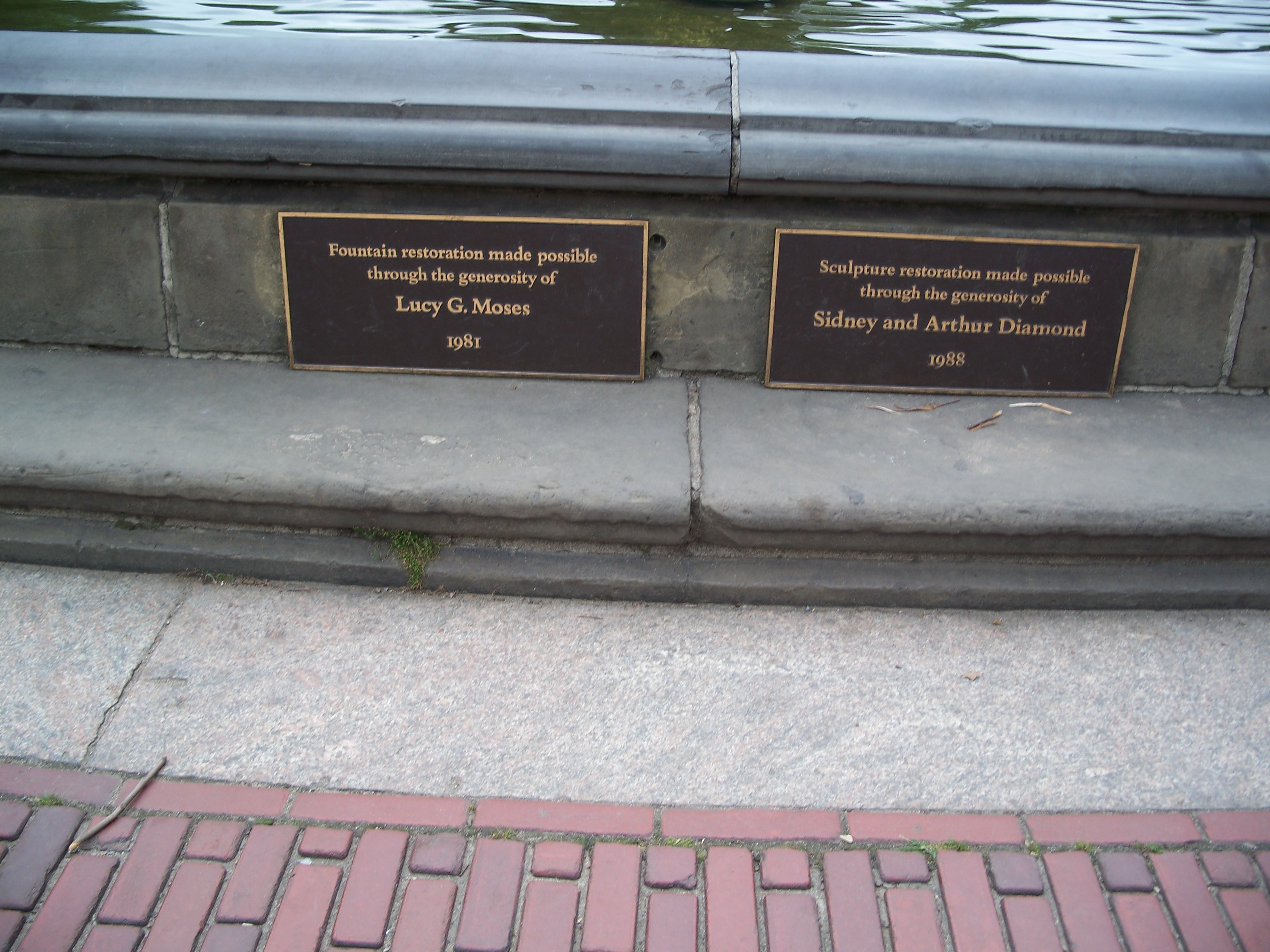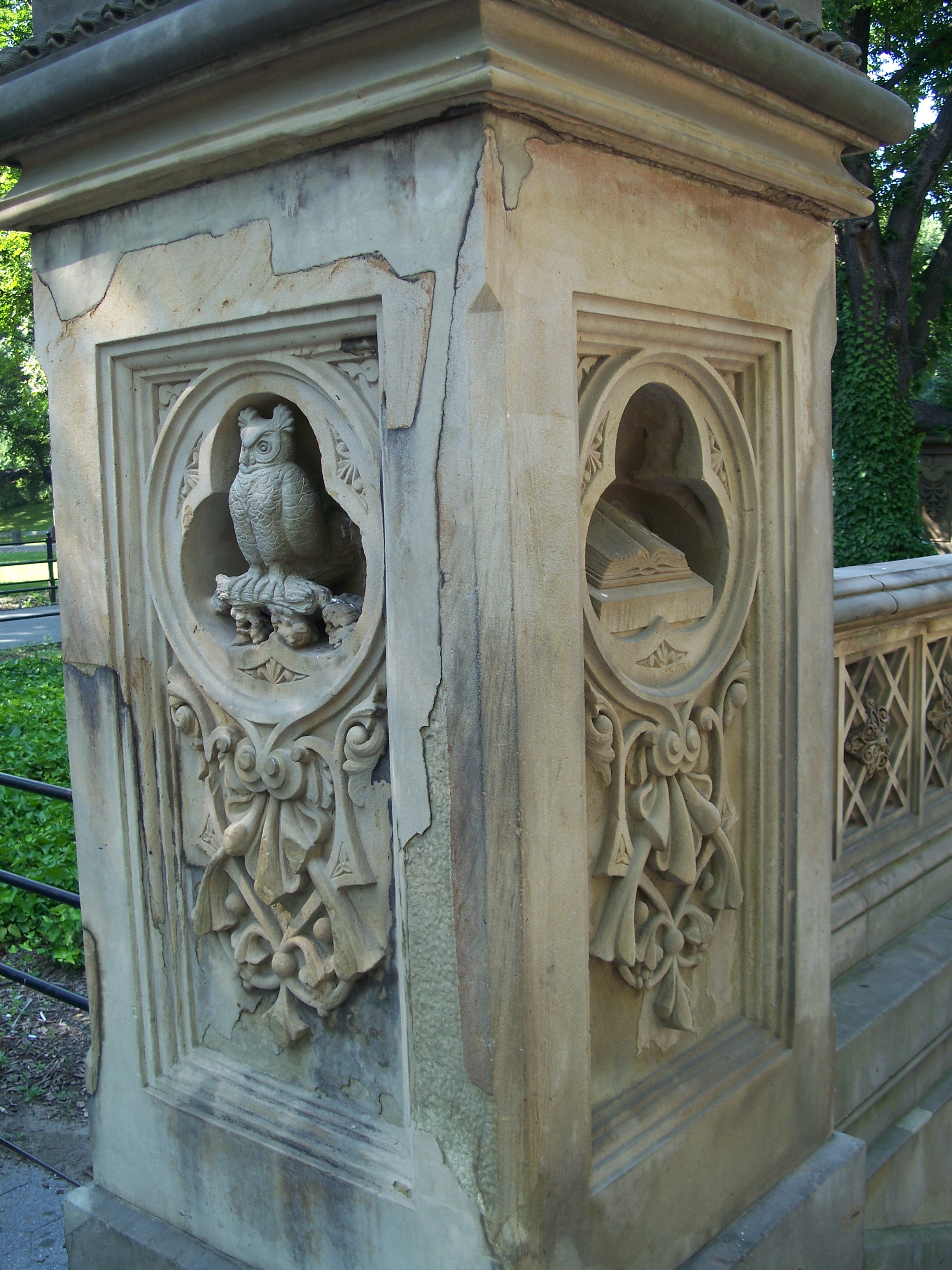 Bethesda Fountain sits in the center of the Terrace, crowned by the iconic sculpture Angel of the Waters (1873) by Emma Stebbins (1815-1882), a noted sculptor whose brother Henry G. Stebbins (1823-1881) was a park commissioner. The $63,000 work was the only statue out of Vaux and Mould's original 1862 proposal for 26 statues of famous Americans. The terrace's name and the sculpture reference the ancient Bethesda healing pool in Jerusalem, mentioned in the Bible's fifth chapter of John as the site of one of Jesus' healing miracles. This reference also symbolizes the health benefits of fresh water brought to the city by the completion of the Croton Aqueduct in 1842. The cherubim on the shaft supporting the lower fountain represent Temperance, Purity, Health, and Peace.
