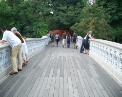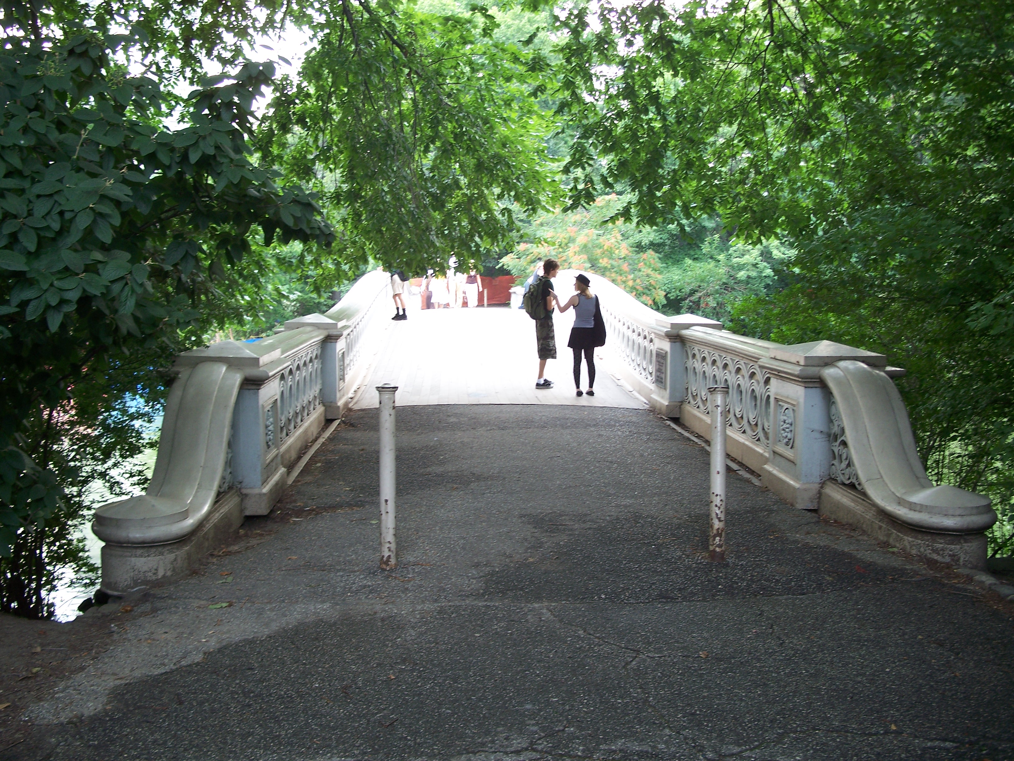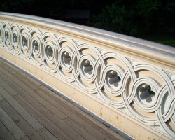 One of the most popular and often photographed bridges in the park. One of the original seven cast iron bridges built in the park between 1859 and 1875. The bridge was renovated in 1974 and 1998. The railing features Gothic cinquefoils and interlaced spiral designs. Cannonballs are set in the base of the north end of the bridge to allow temperature expansion.