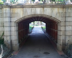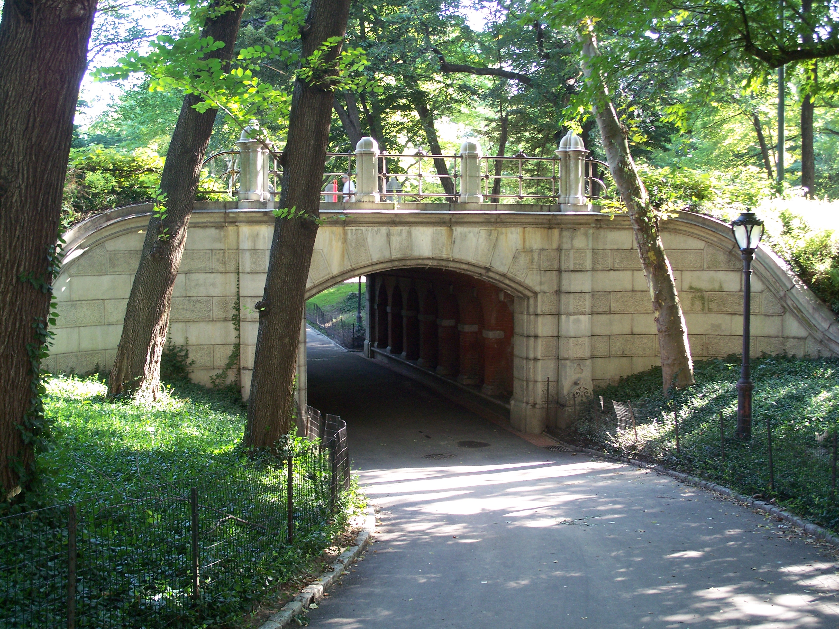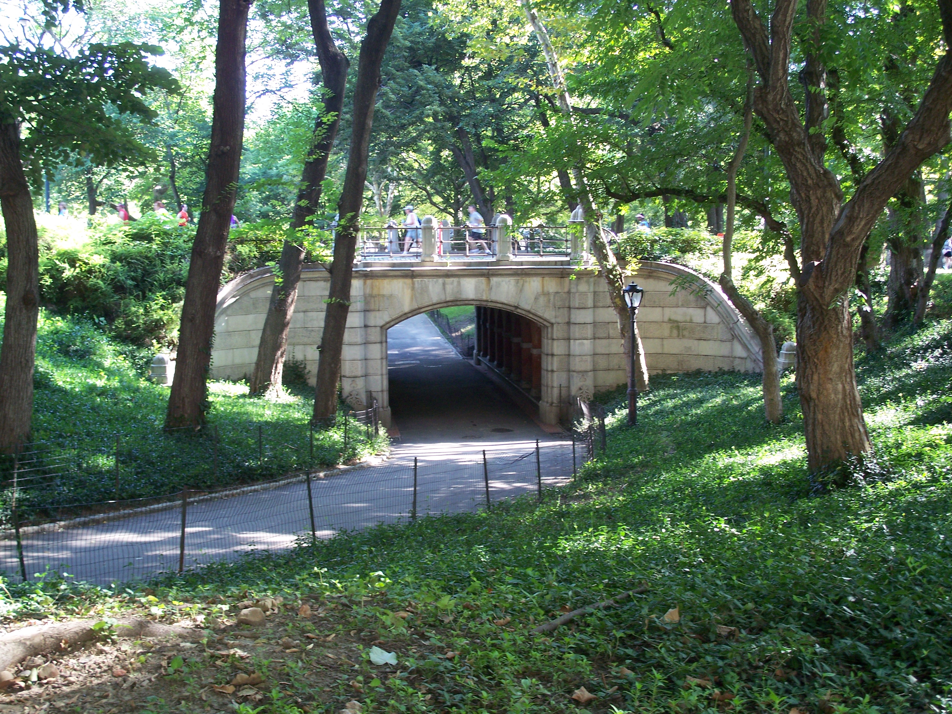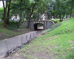 This bridge allows pedestrians to bypass Center Drive, which can be quite busy during running or bike races or at rush hour. The path leads to Heckscher Playground and used to cross Spur Rock Arch, which was destroyed by Robert Moses in 1938 to permit expansion of Heckscher Playground.