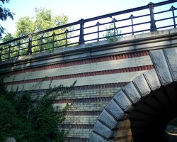 Its festive yellow and red bricks and beige voussoir blocks harken back to a time when this part of the park was designated the Children's District. One side of the original railing remains with the other side being a reproduction from 1989.