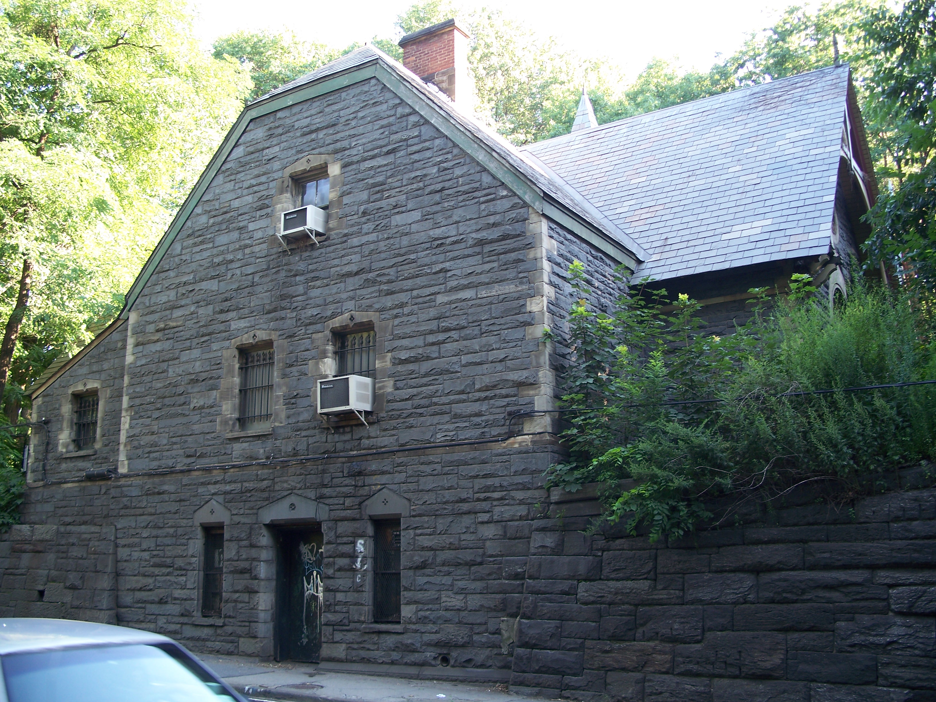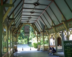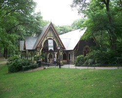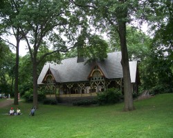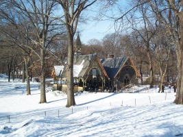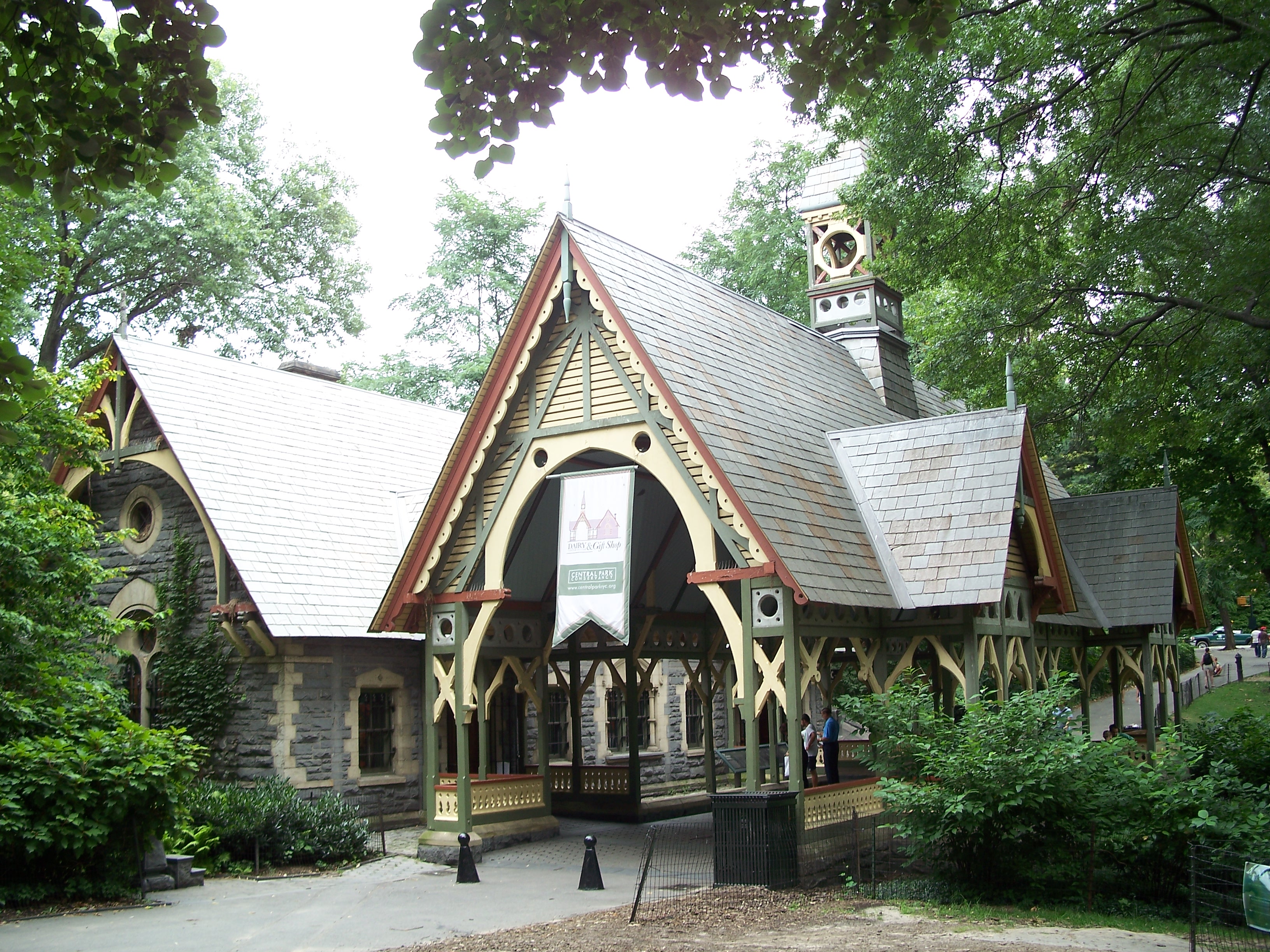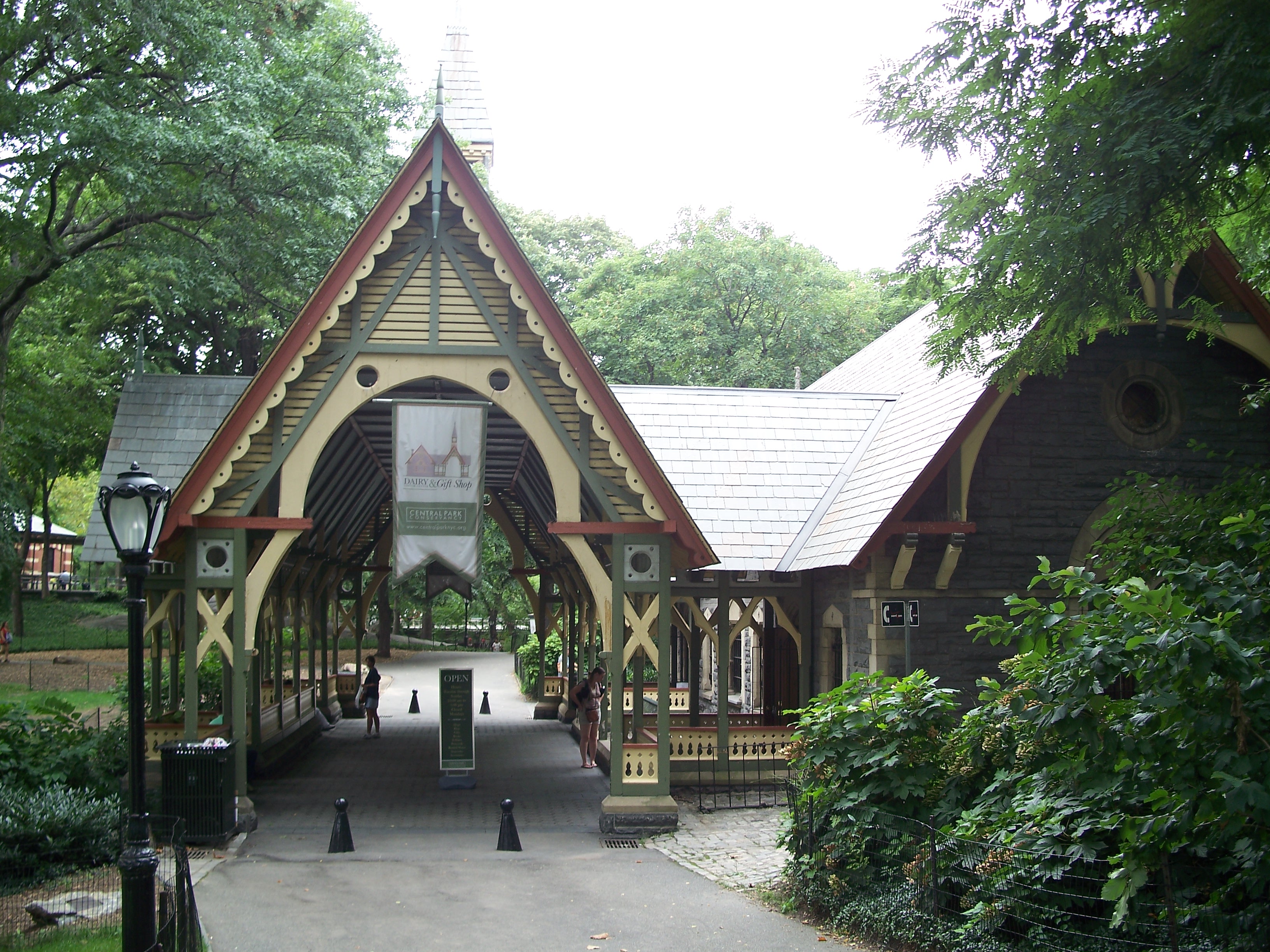 The Dairy is located in mid park at about 65th street. The building was designed by Calvert Vaux and completed in 1871. It is a rather schizophrenic structure in a style called Victorian Gothic. The northern half (facing a transverse road) is a granite structure with a gambrel roof that resembles a country church. The southern half is a wooden loggia (roofed open gallery) with geometric gingerbread borders. It was designed to catch cool summer breezes from The Pond to the south, while retaining sunlight in the winter. The Dairy had a nice view of The Pond until 1950 when the northern arm of the pond was converted to Wollman Rink.