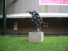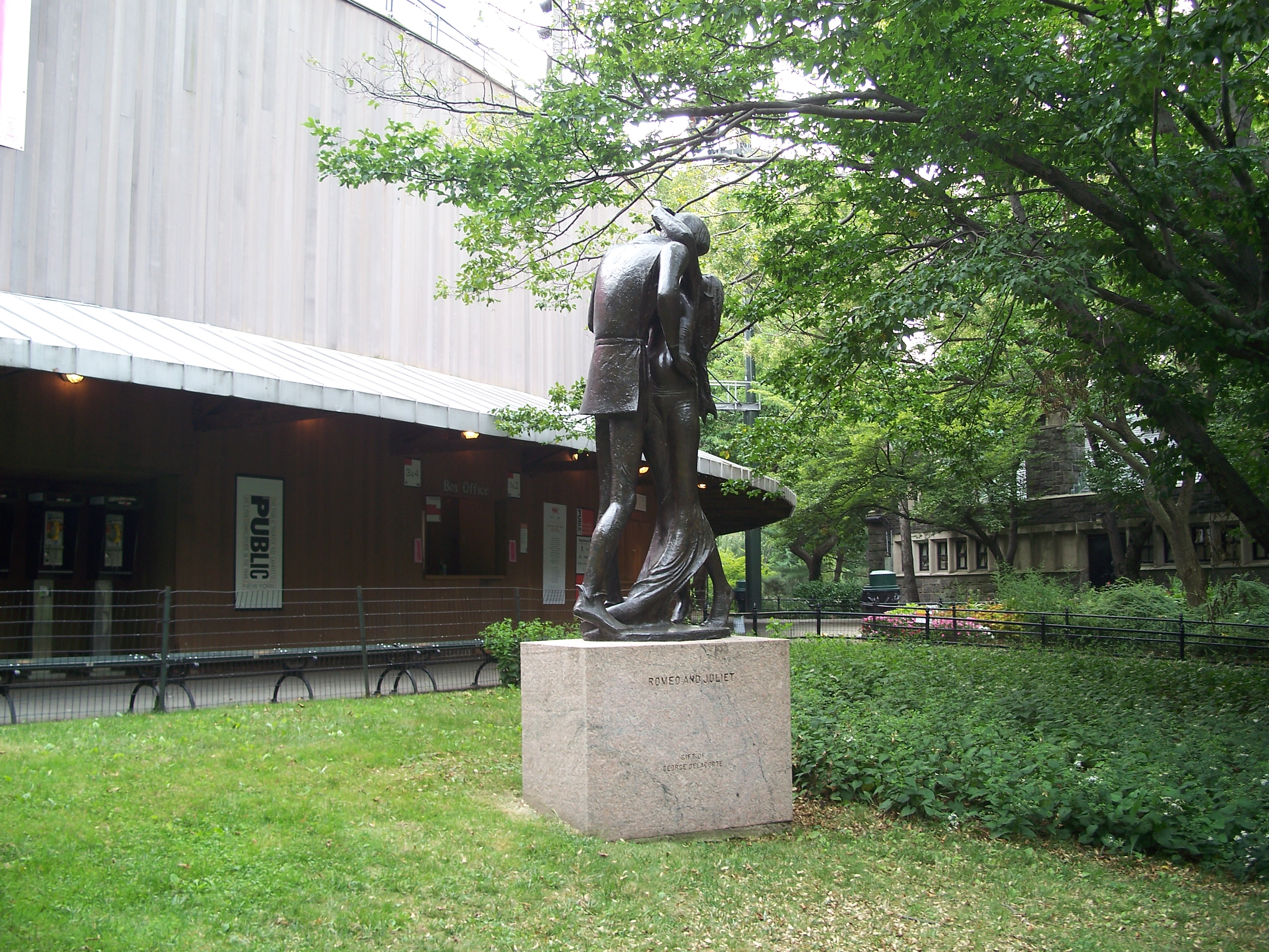 The two statues of Shakespearean characters that stand in front of the Delacorte Theatre were gifts from Delacorte that were sculpted by Milton Hebald (b. 1917). Prospero is depicted in The Tempest, which was unveiled in 1966 (reference). The two star-crossed lovers embrace in a scene from Romeo and Juliet, which was unveiled in 1977 (reference).