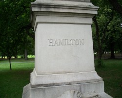 Hamilton was killed in a duel across the Hudson in Weehawken, NJ. His home in what is now the Hamilton Heights neighborhood in Harlem (Hamilton Grange) has been preserved. Hamilton is buried in Lower Manhattan's Trinity Church cemetery. (reference)