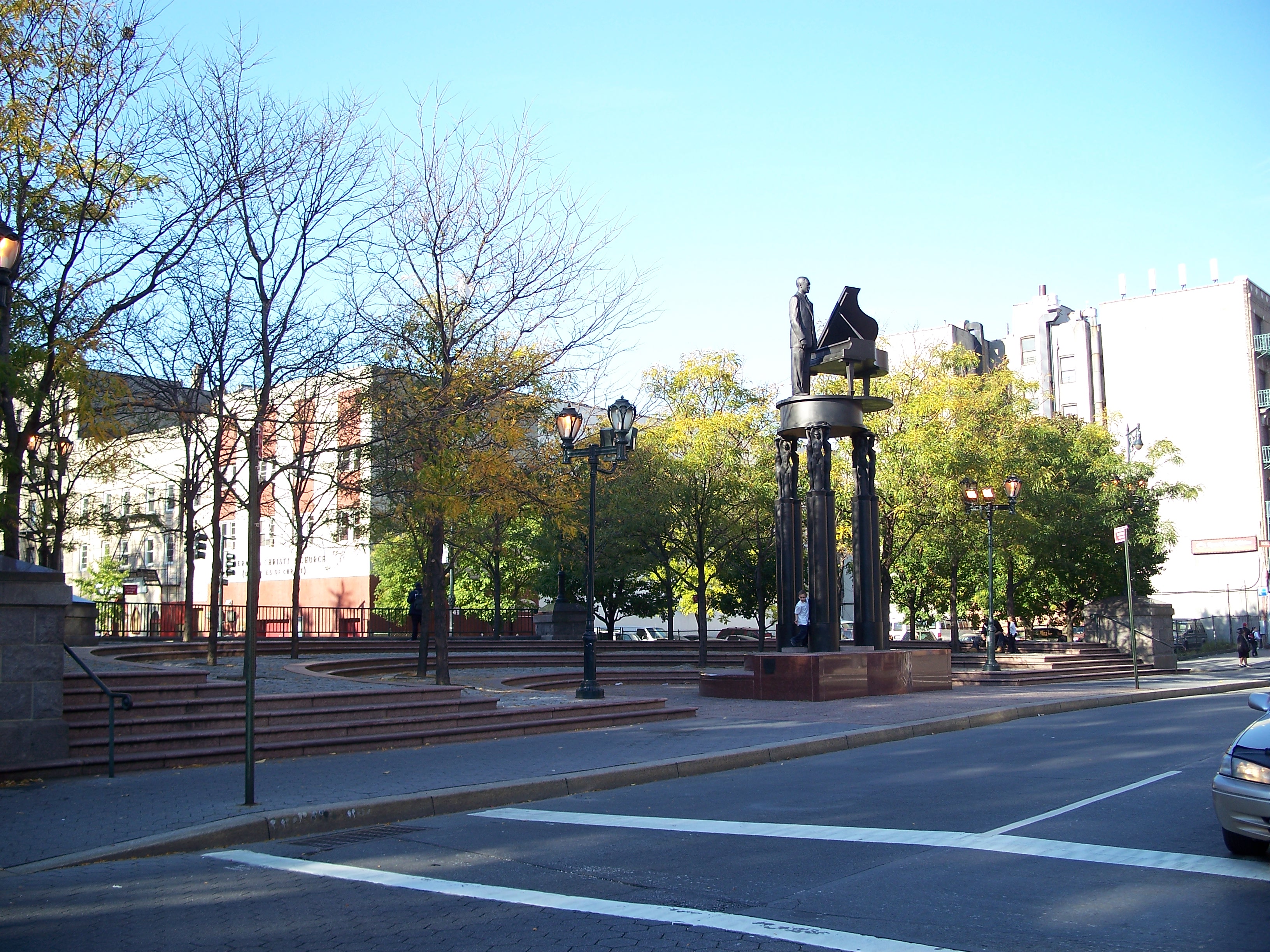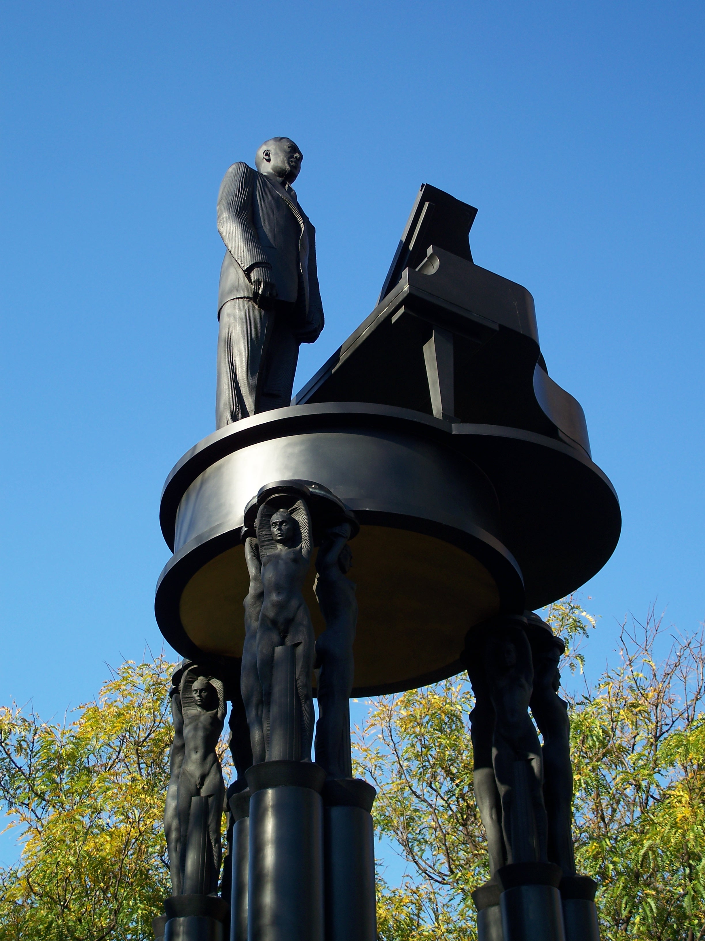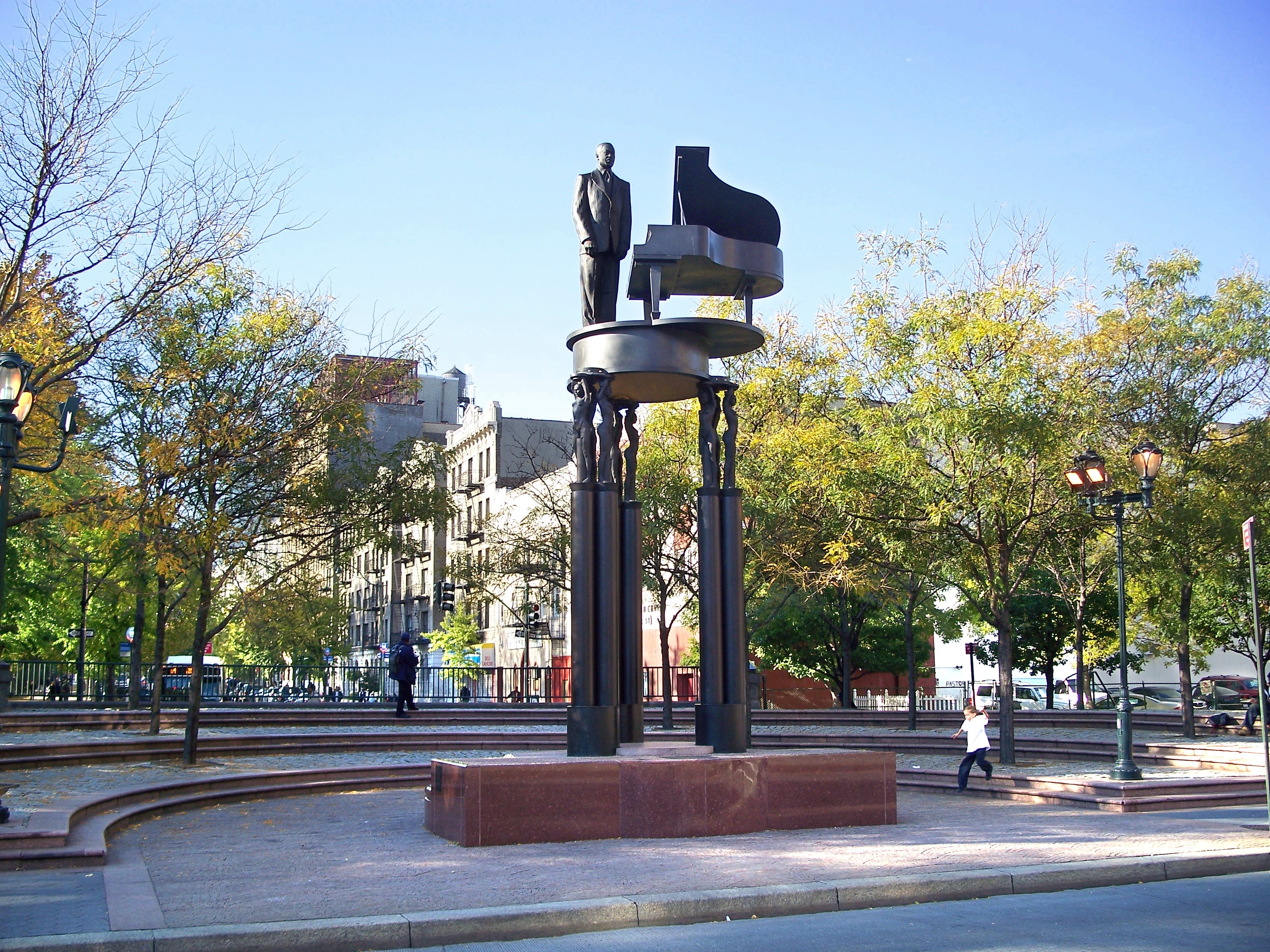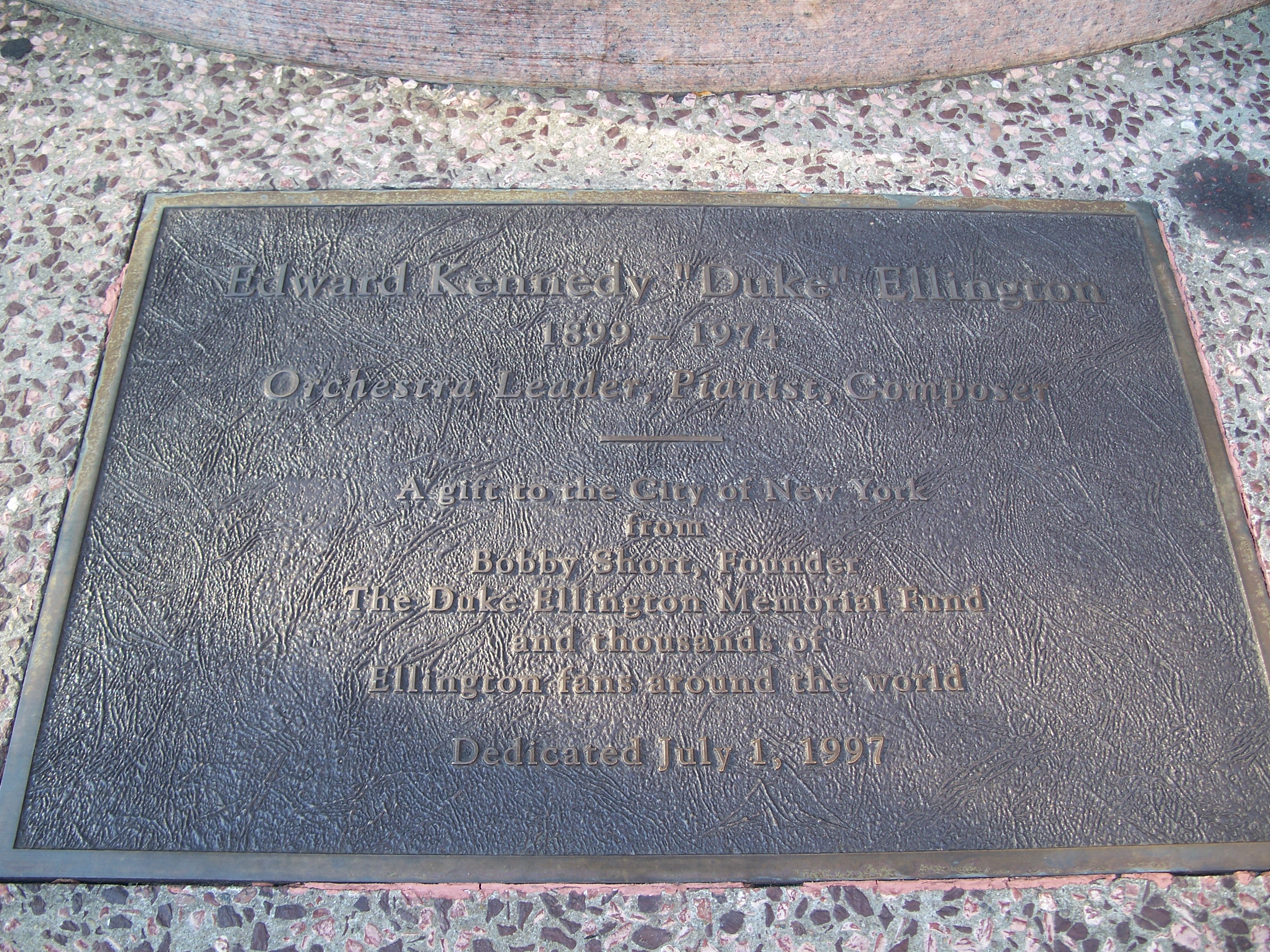 Edward Kennedy "Duke" Ellington (1899-1974) was an American composer, bandleader and pianist who came to prominence performing in Harlem and who lived a large part of his life in New York City. This 8-foot bronze by Robert Graham (b. 1938) was a gift from the Duke Ellington Memorial Fund that was unveiled in 1997. The statue sits on a tableau next to an open grand piano. The platform stands on three 10-foot tall pillars crowned with nude female figures representing the muses. The monument sits in a small ampitheatre within the traffic circle also named after Ellington.