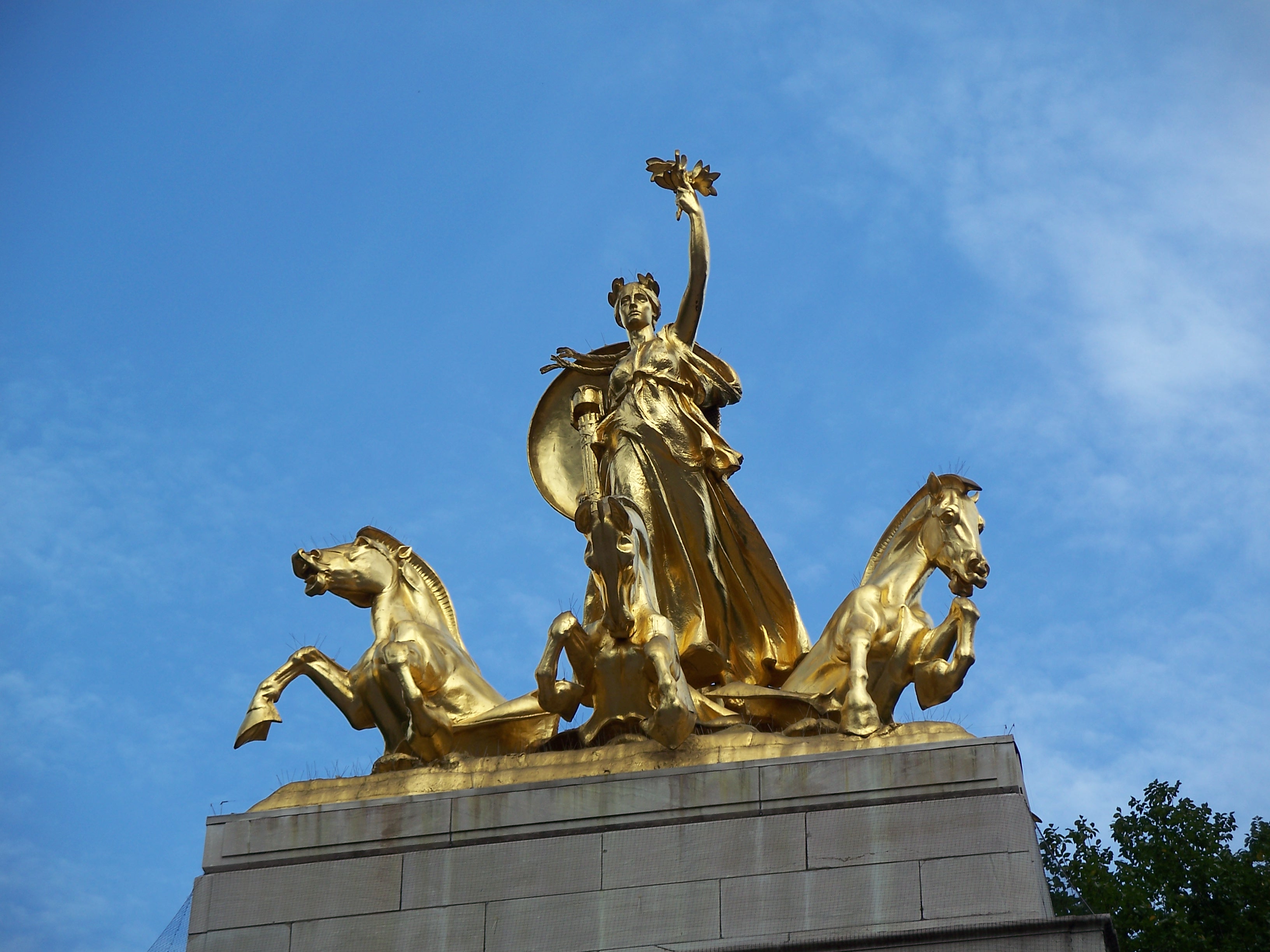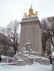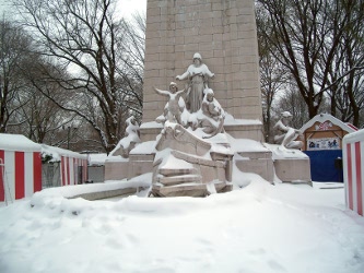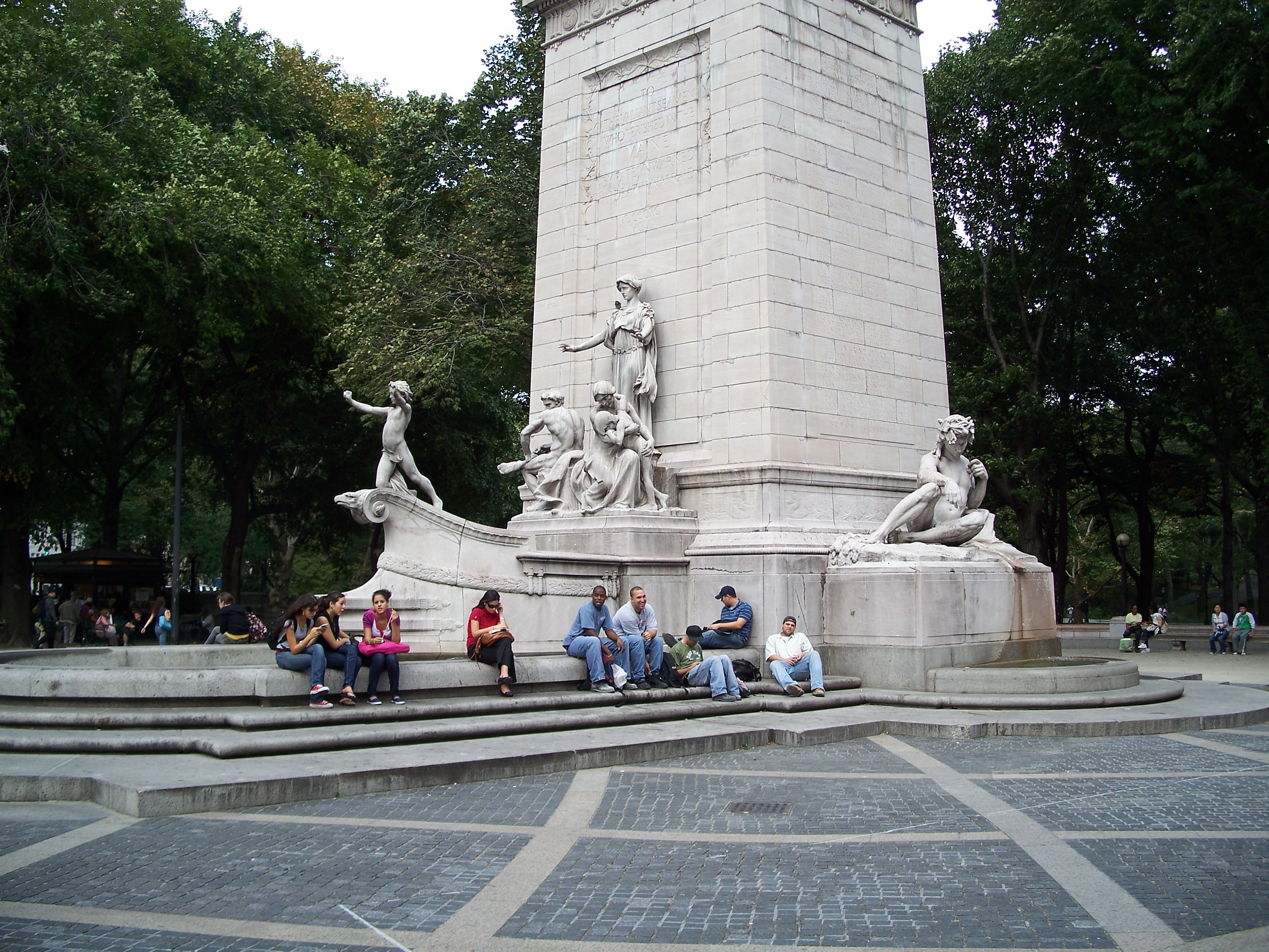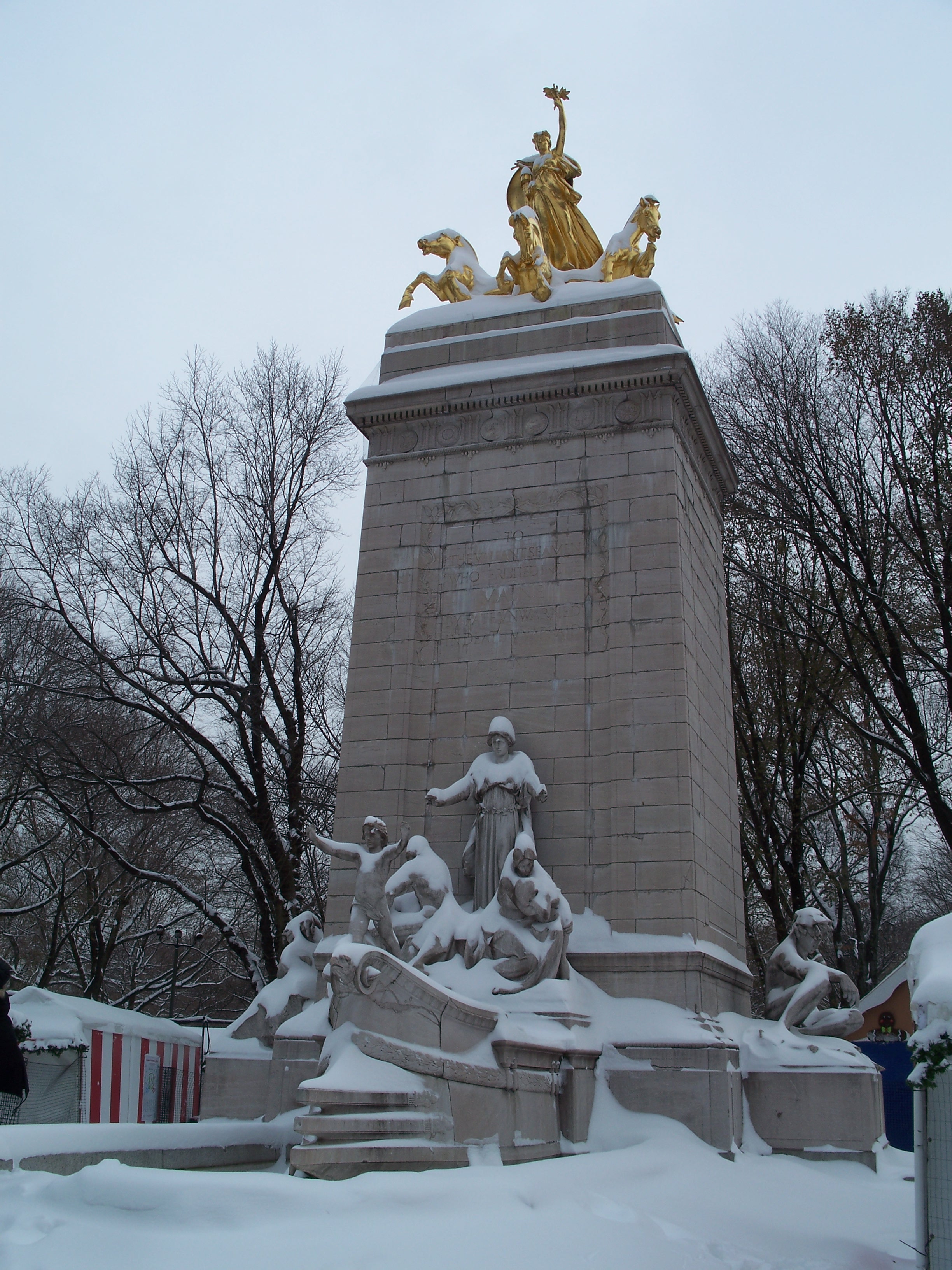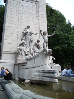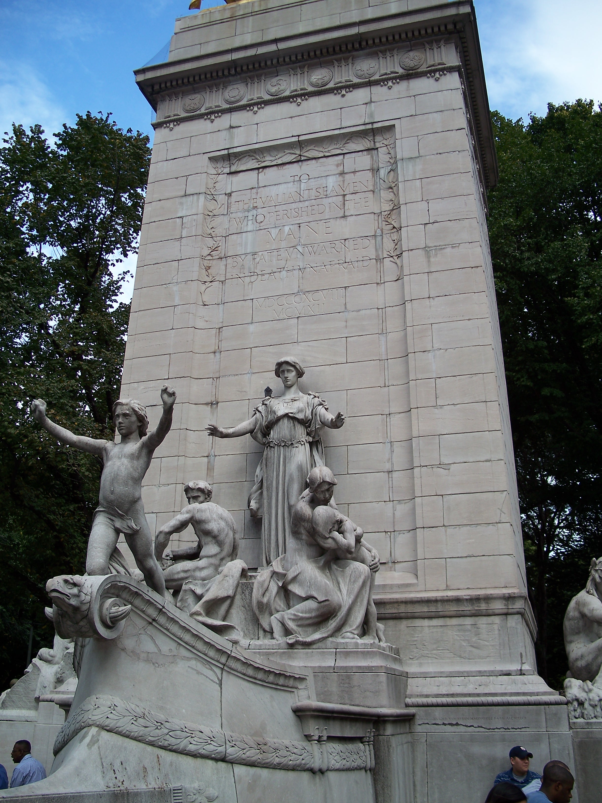 This is a monument to the 266 American soldiers who died when the battleship U.S.S. Maine exploded in Havana, Cuba on February 15, 1898. Although the cause of the explosion is uncertain, publisher William Randolph Hearst joined with pro-war forces in promoting the disaster as an act of sabotage and triggering the Spanish-American War, which resulted in American acquisition from Spain of Cuba, Puerto Rico, Guam and the Philippines. Hearst solicited donations for this monument over a period of years with architect H. Van Buren Magonigle and sculptor Attilio Piccirilli selected as the designers. The monument was dedicated in the park in 1913. (reference)