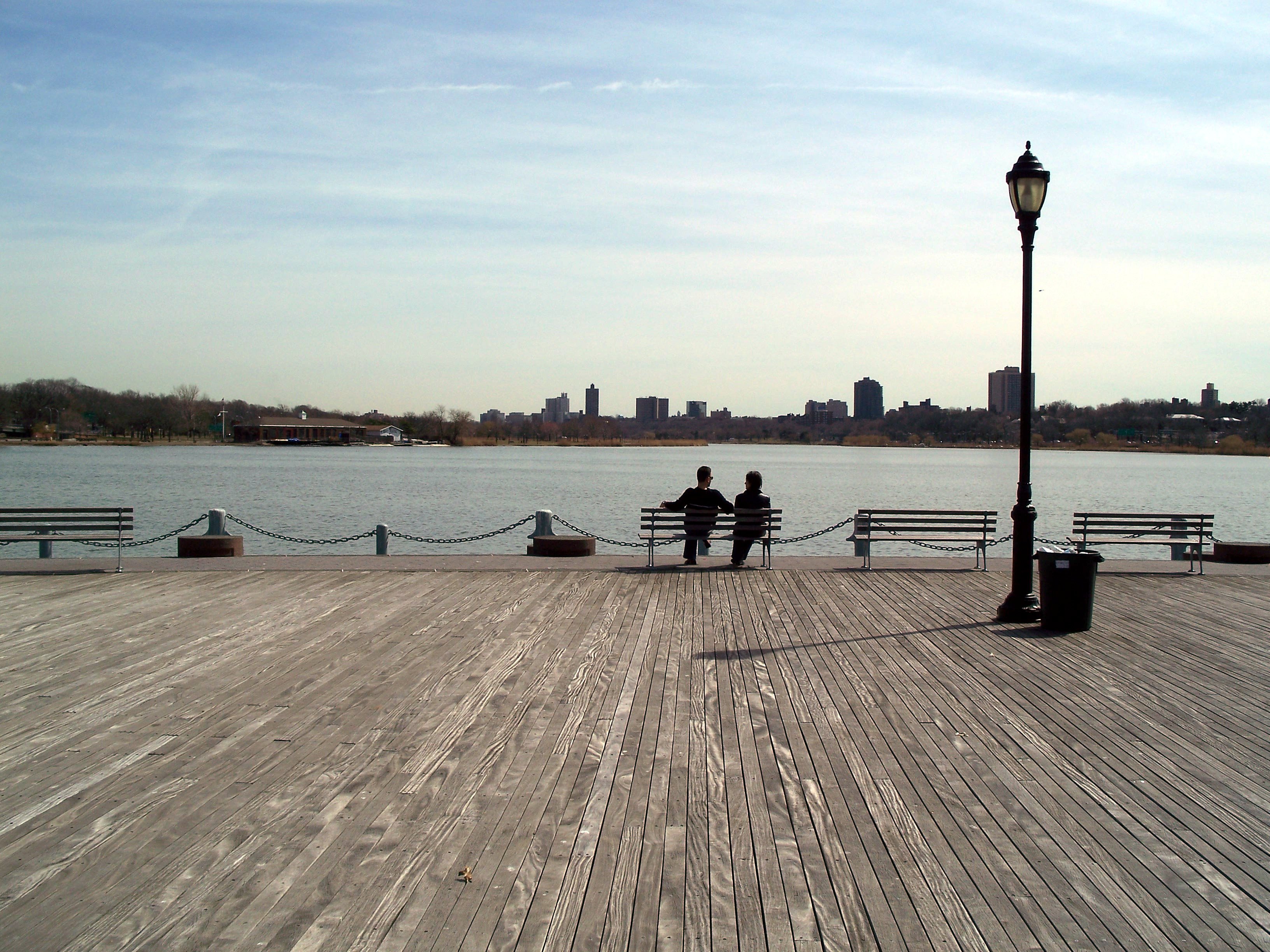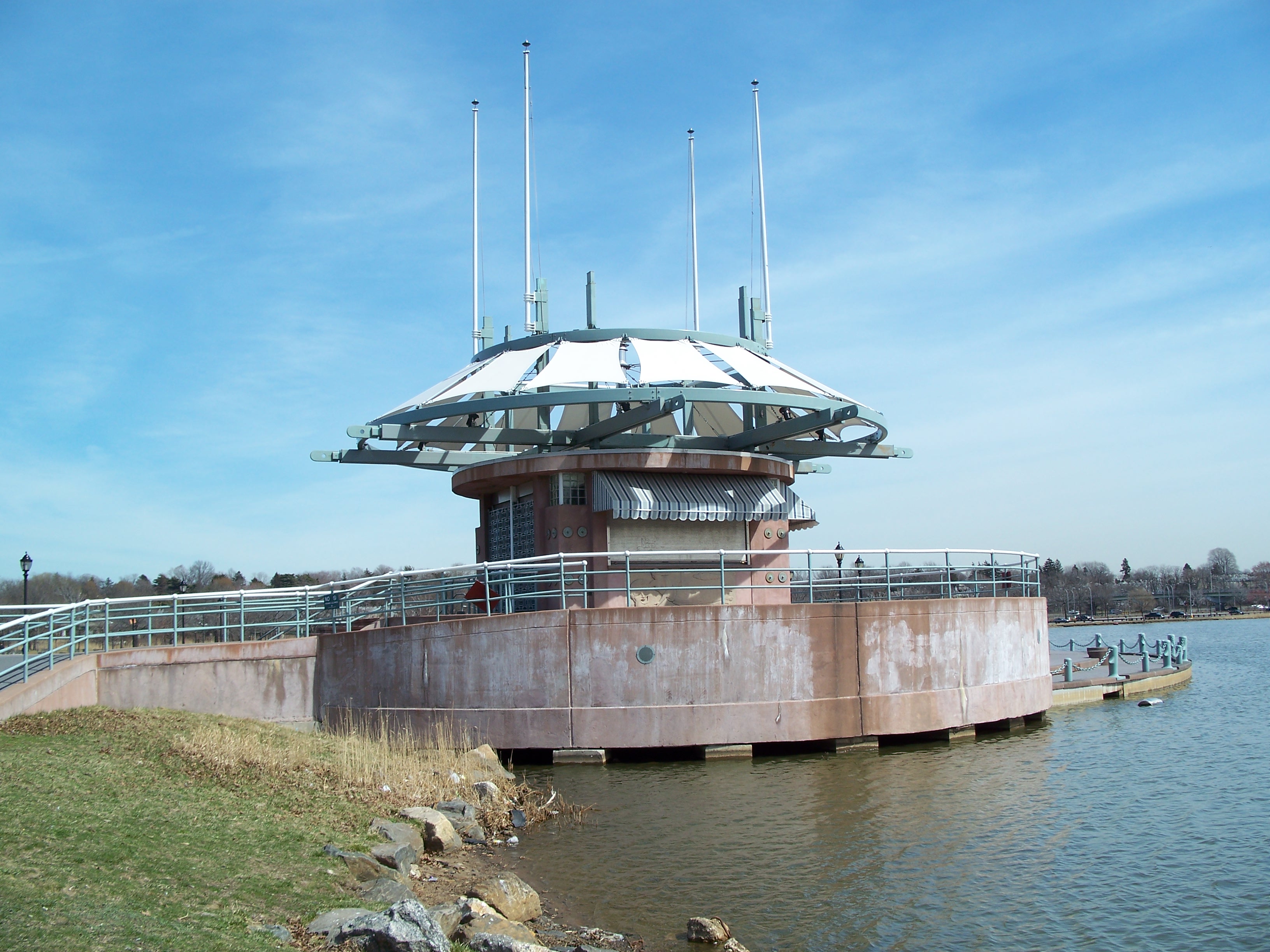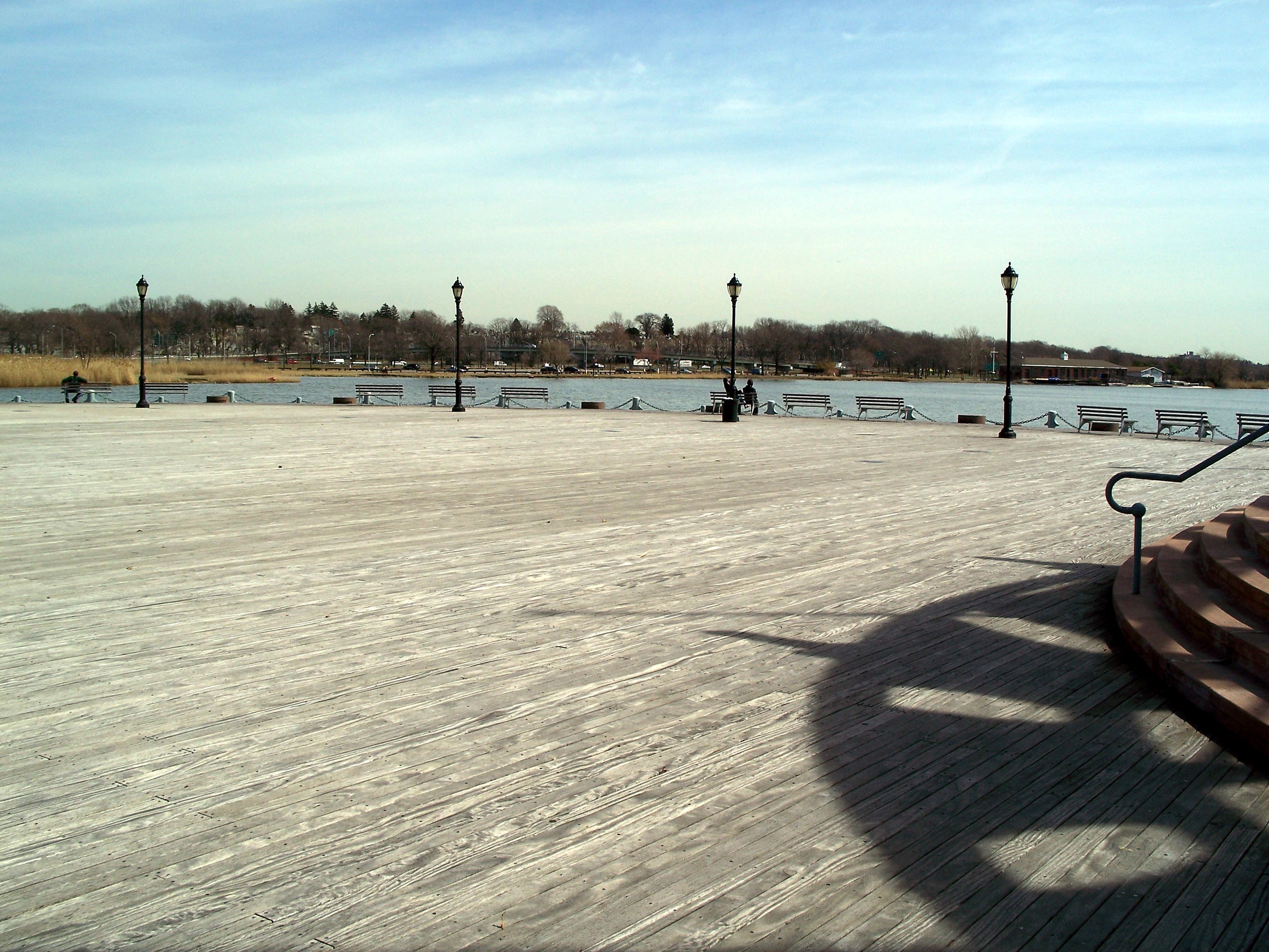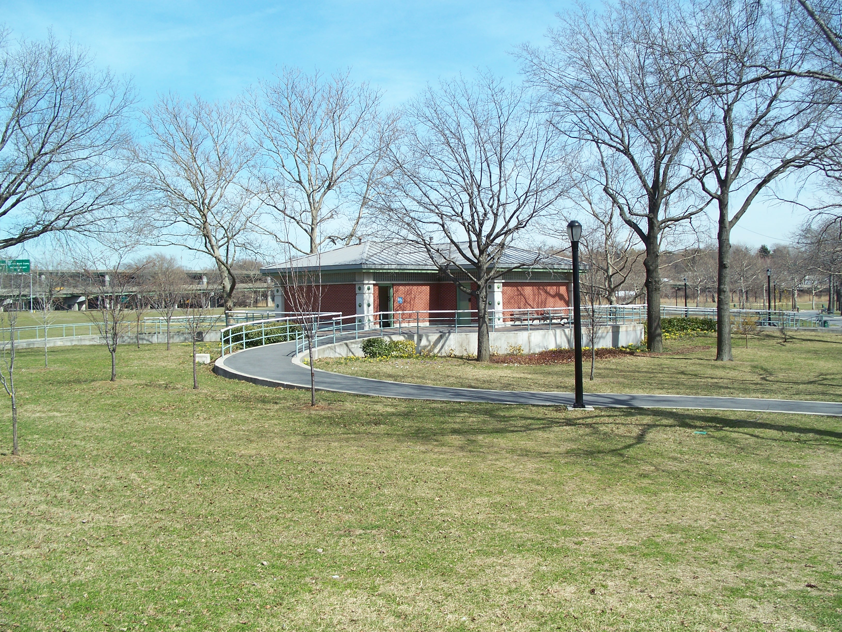 This site on the northern side of Meadow Lake was the home of an Ampitheatre (also known as the Billy Rose Aquacade) built for the 1939 World's Fair. After the fair it was reopened as a public pool. It was renamed Gertrude B. Ederle Amphitheater in 1976 to mark the 50th anniversary of the Olympian's historic swim across the English Channel. The Ampitheatre fell into glorious decay after years of neglect and was finally demolished in 1996. After a planned new pool was moved to the other side of the park, the $13.5 million Ederle Terrace project was completed in 2004 with 13 landscaped acres of parkland and a new comfort station. (reference) (NY Times History)