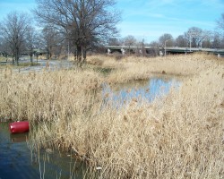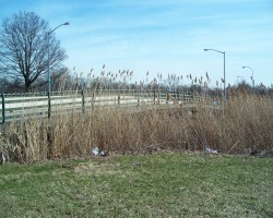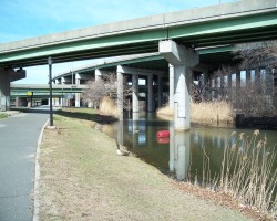 Boathouse Bridge crosses what is left of Flushing Creek and provides automobile access to the Meadow Lake boathouse. As befits a bit of 1960s modernist dreck, it lacks any stylistic charm beyond a twisted extruded guard rail. The creek passes through the Fountain of the Planets and down to Flushing Bay.