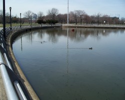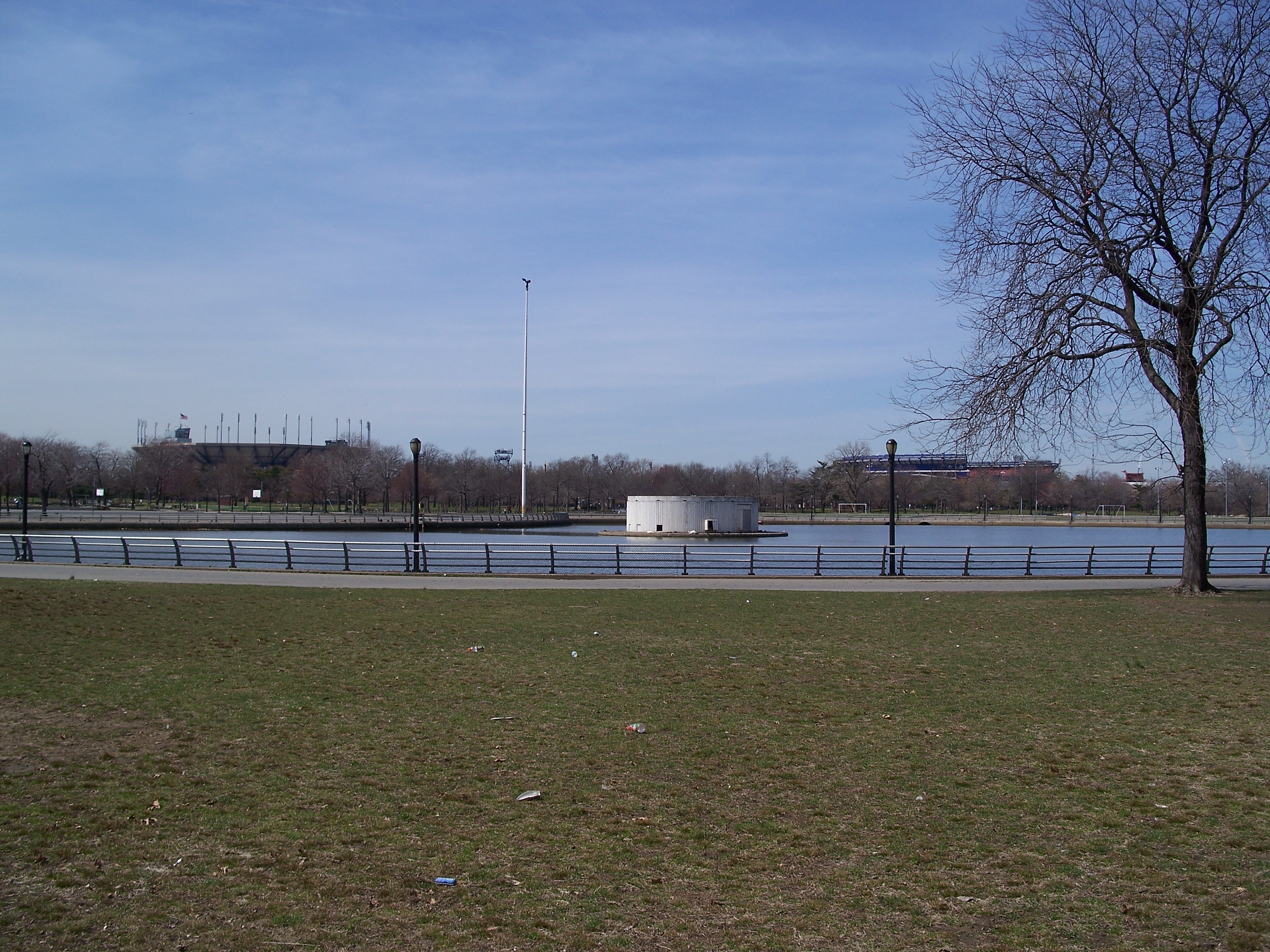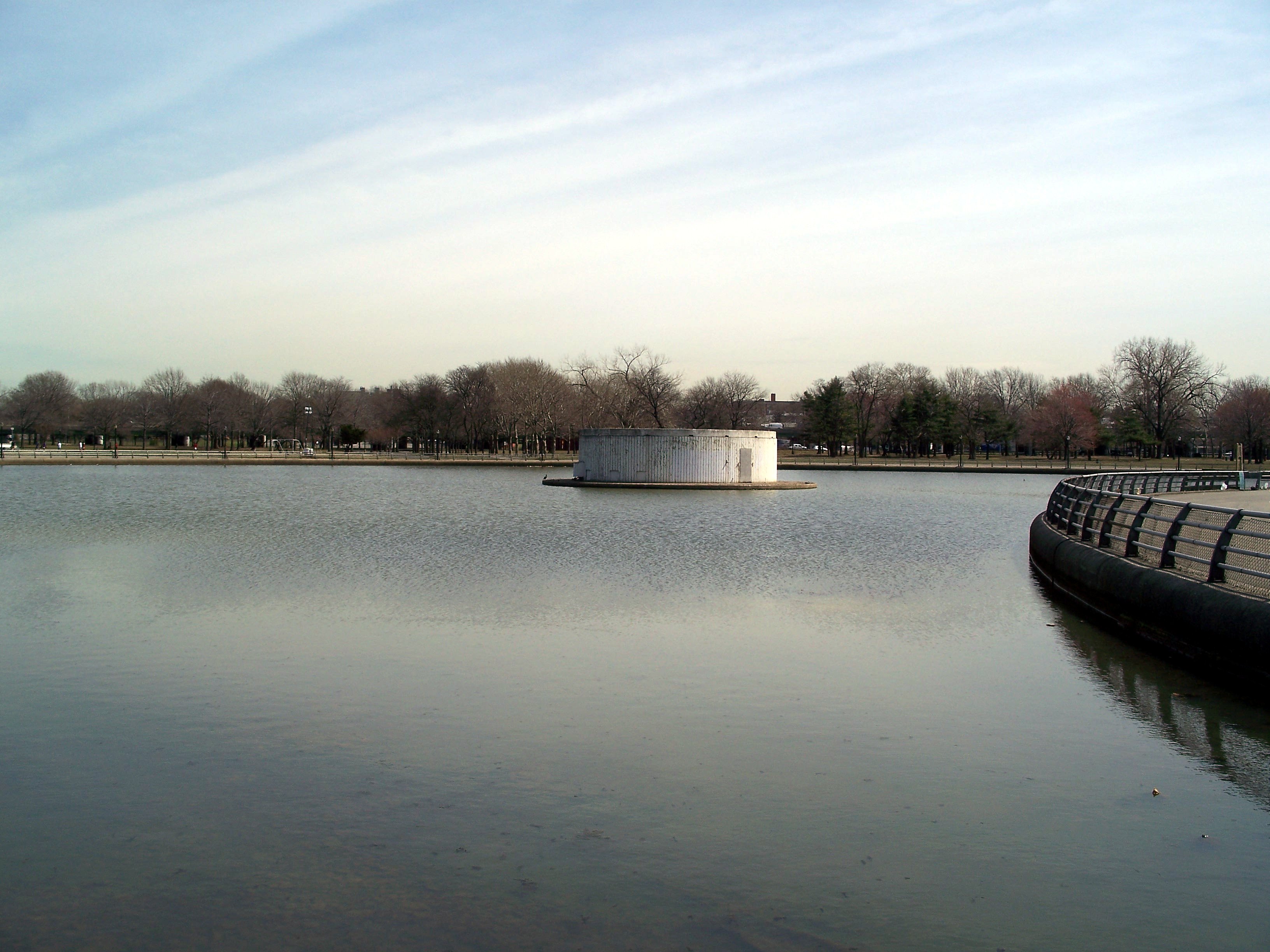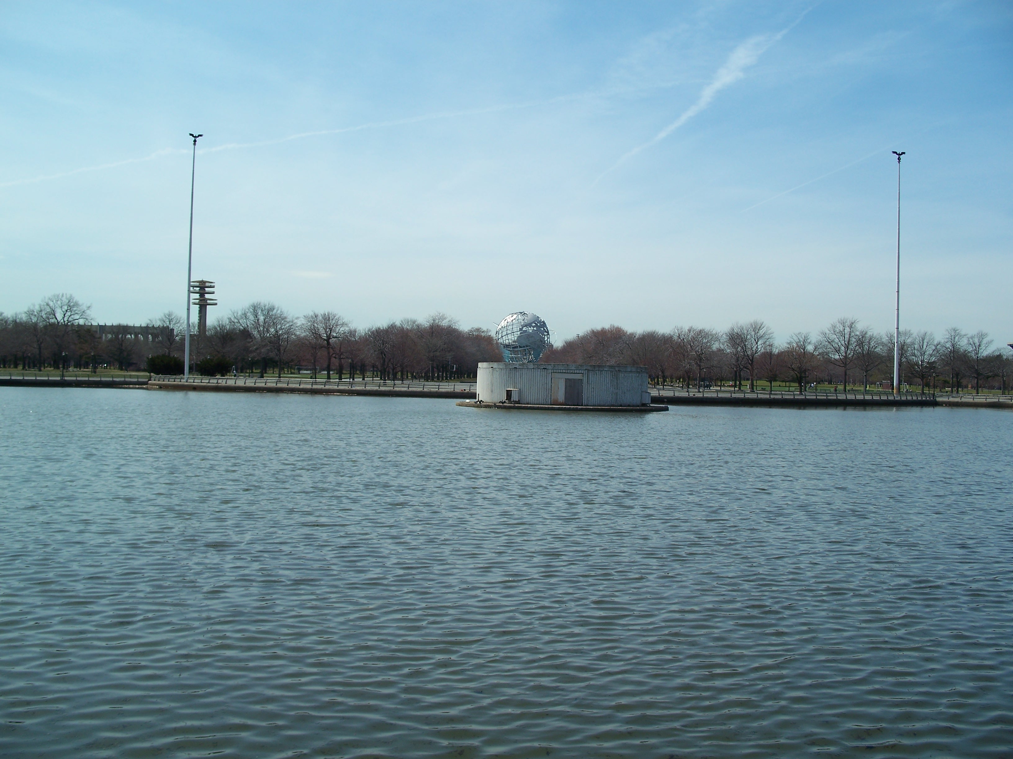 For the 1964 fair, the Flushing River (aka Flushing Creek) was filled in on the western end of the fair grounds. The circular Fountain of the Planets was placed over the old river path and, supposedly, the river flows through the fountain via tunnels on its way from Meadow Lake to Flushing Bay. I suspect the fountain has been inactive for years, although the presence of fowl demonstrates that the water isn't too fetid to support life.