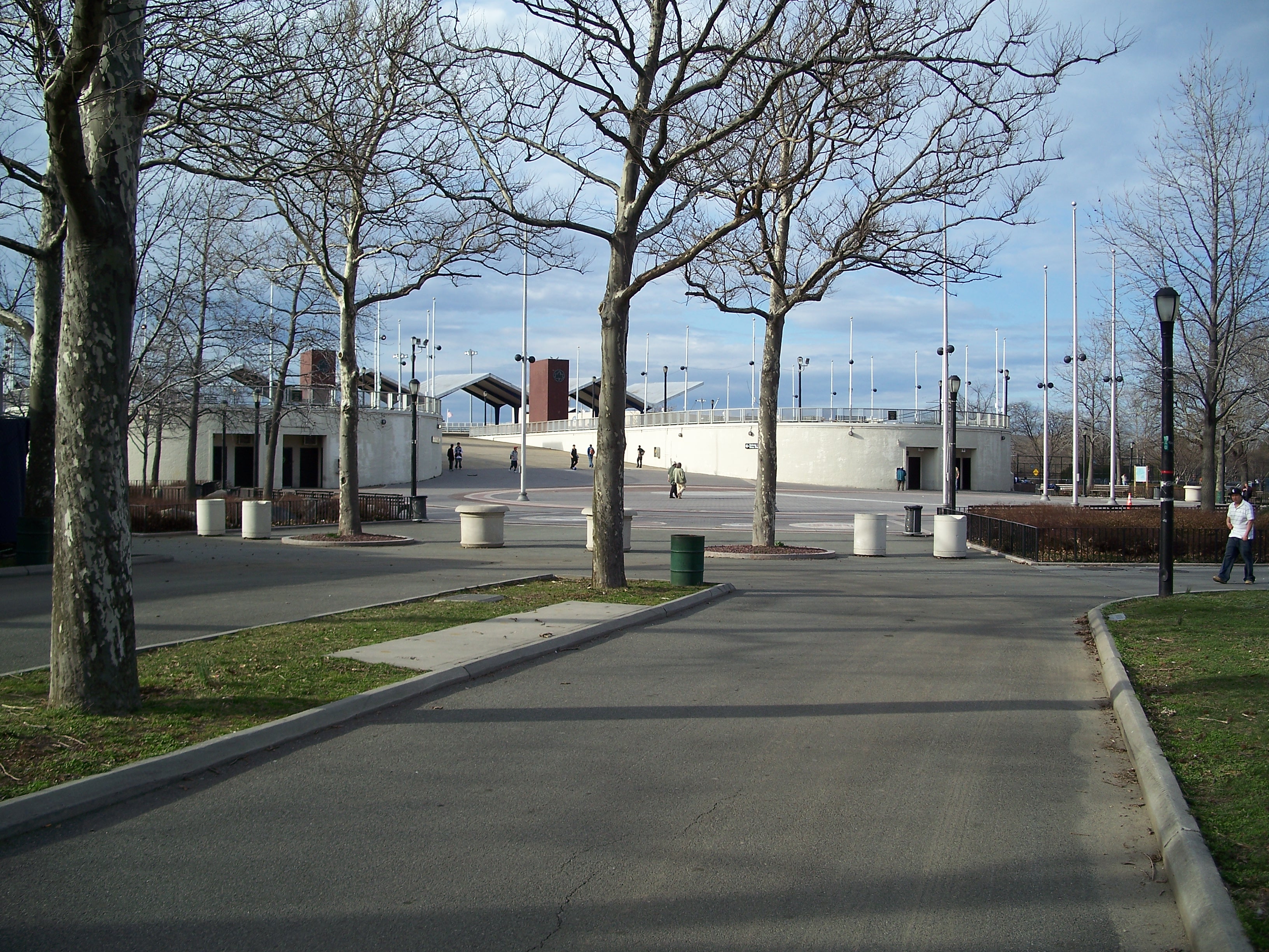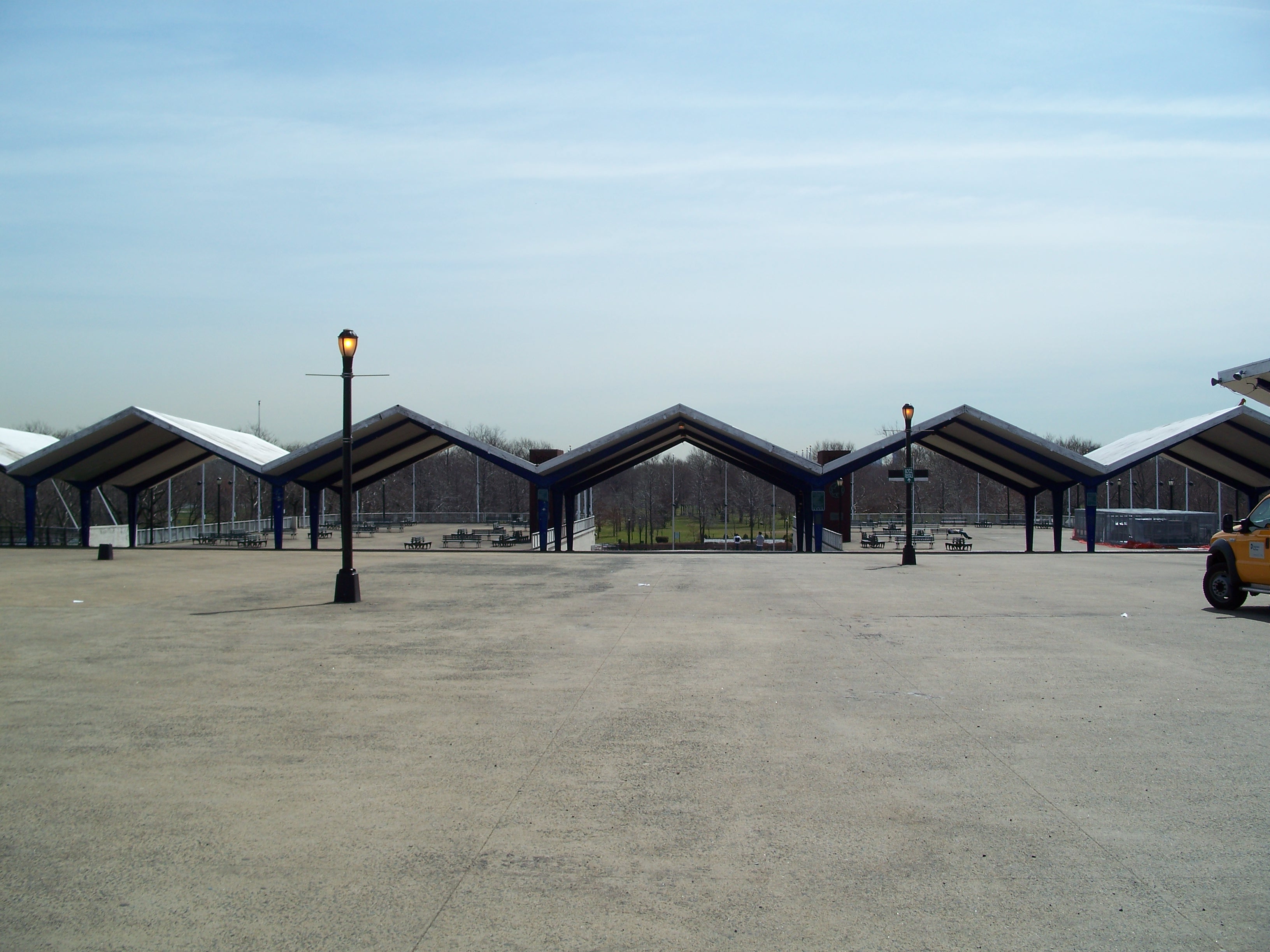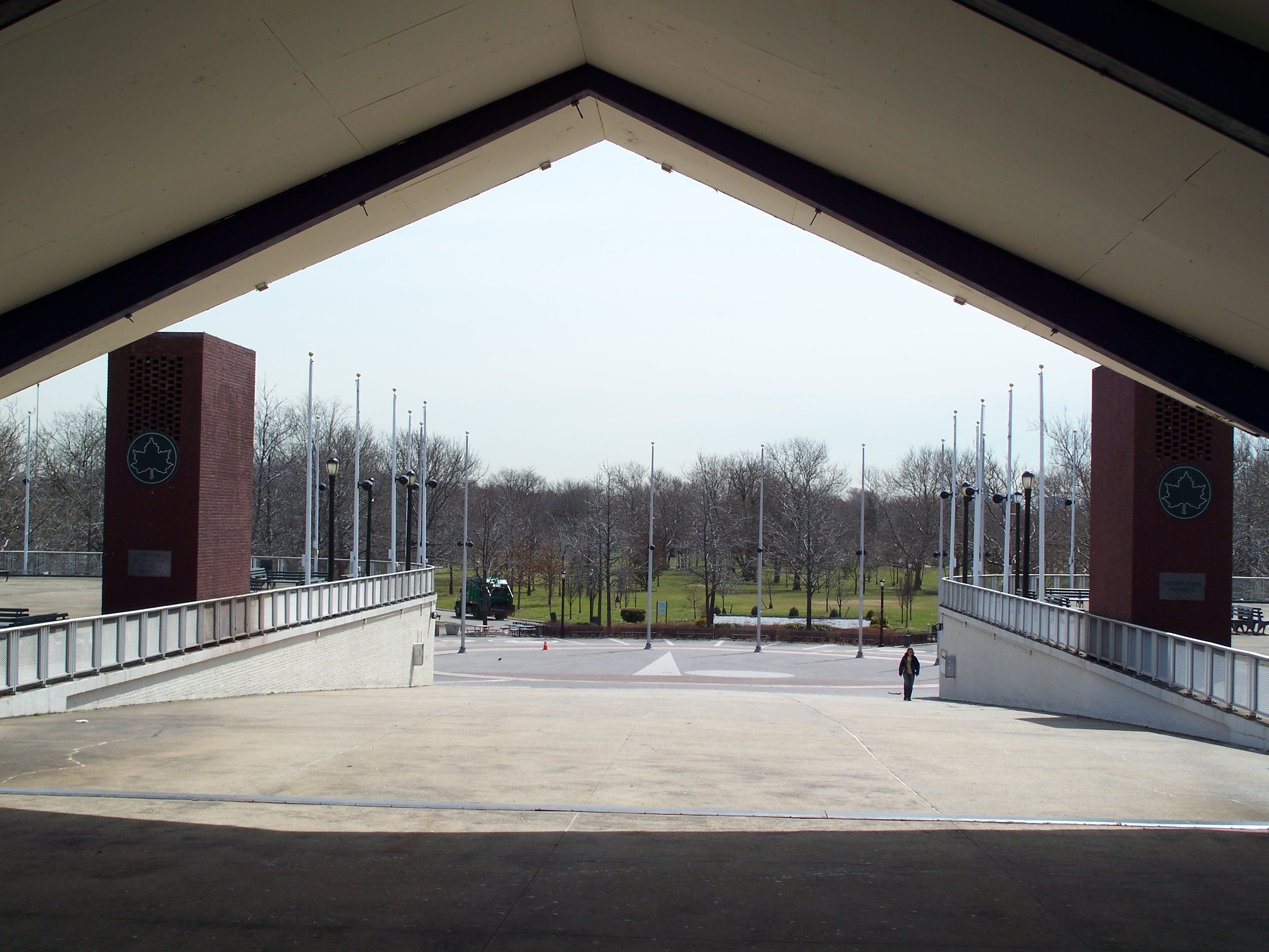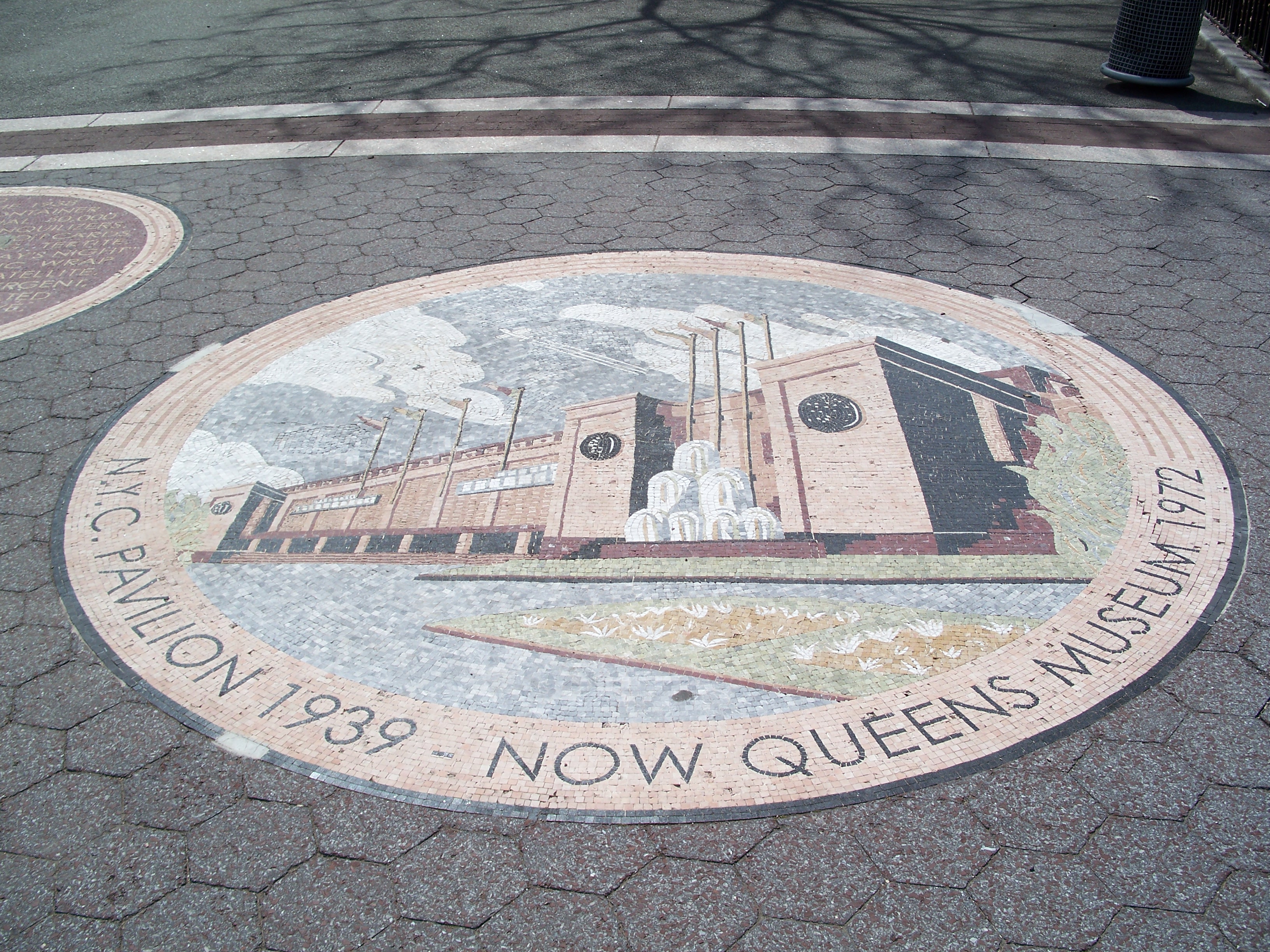 The entrance to the park from the #7 train is the Passarelle Entrance via the Passarelle Overpass over the LIRR tracks and MTA subway train yard. The plaza building includes a comfort station and recreation rooms and the ground level includes a group of crumbling circular mosaics that commemorate the past fairs.