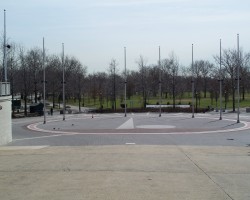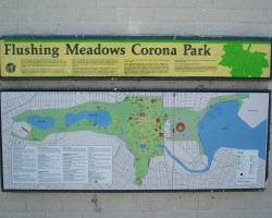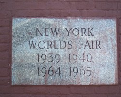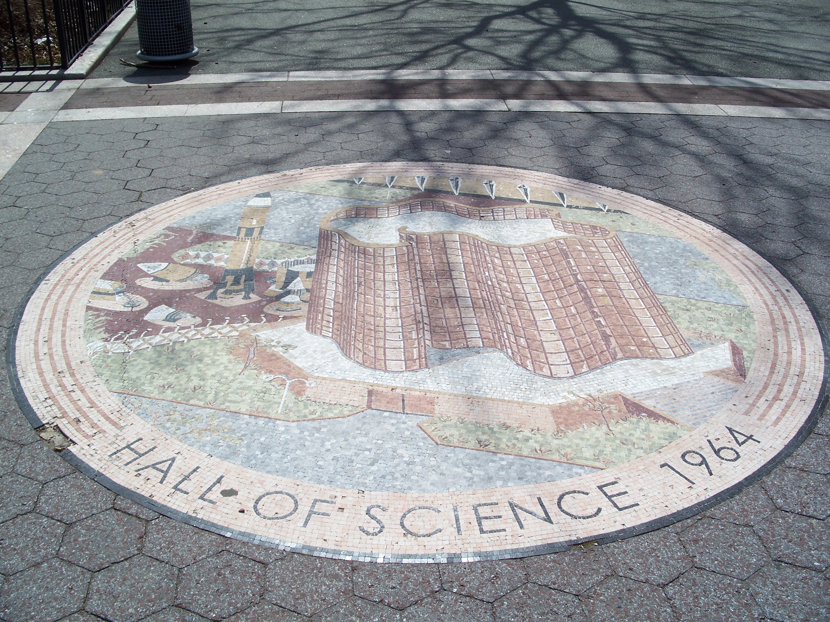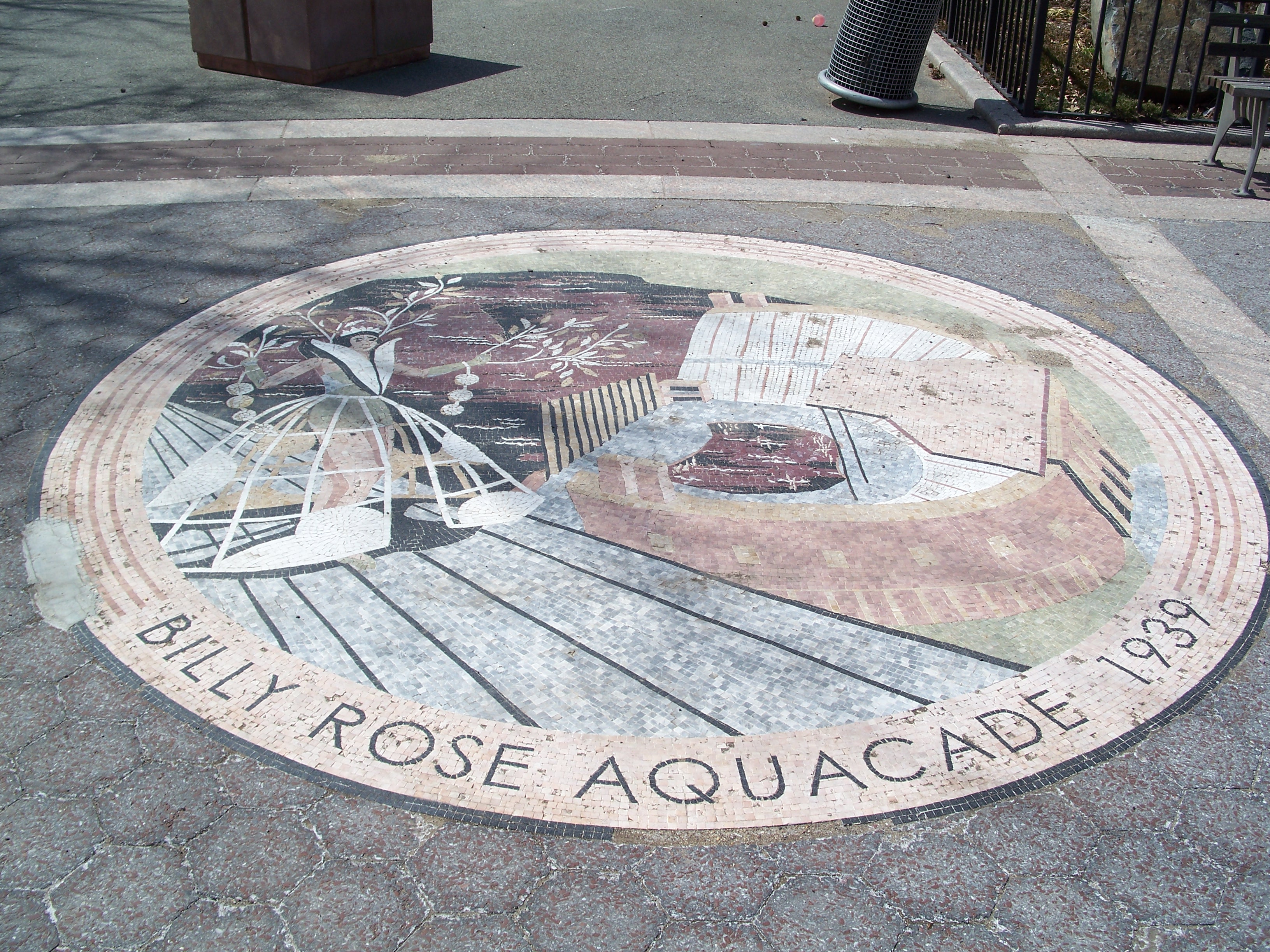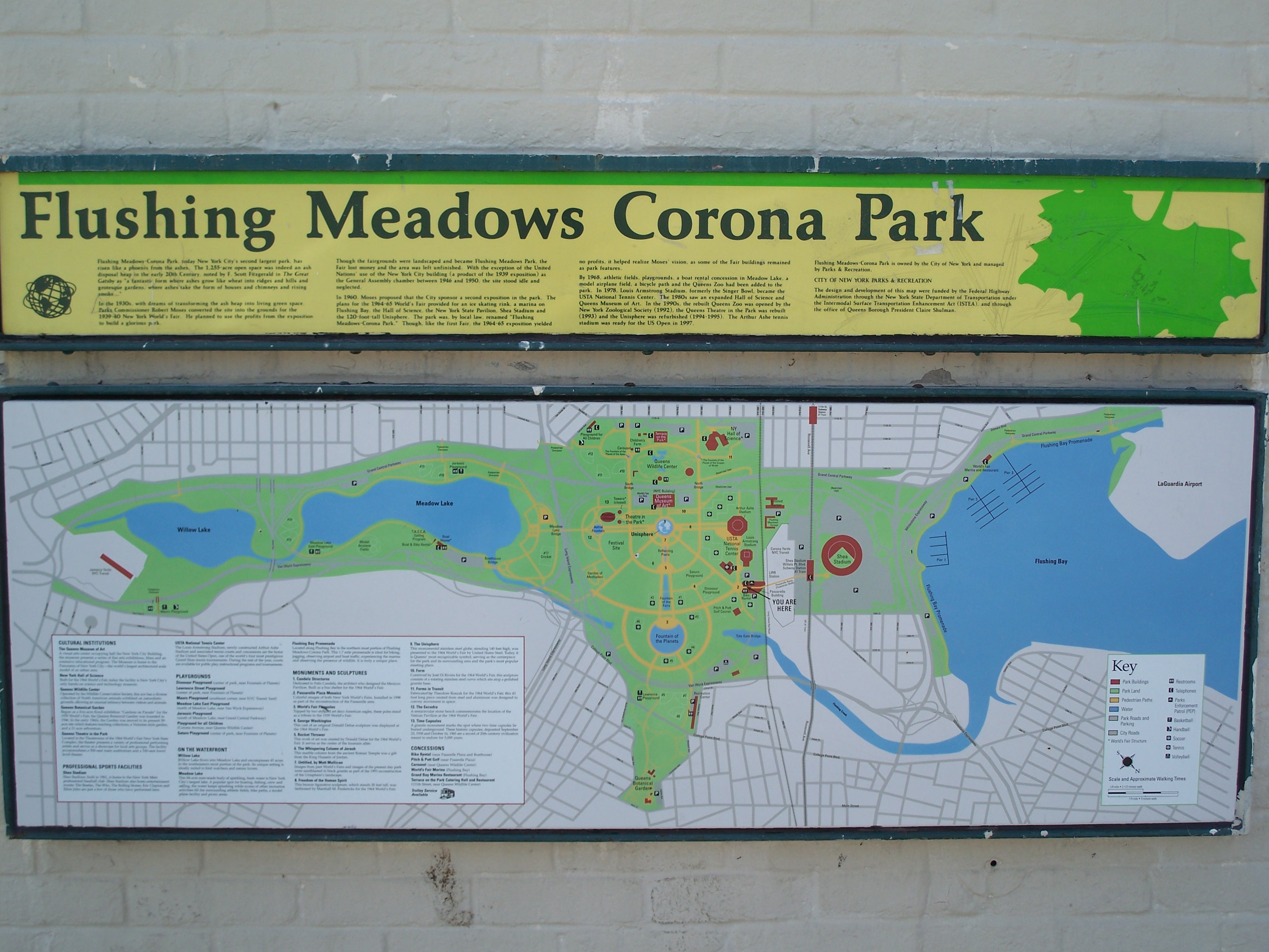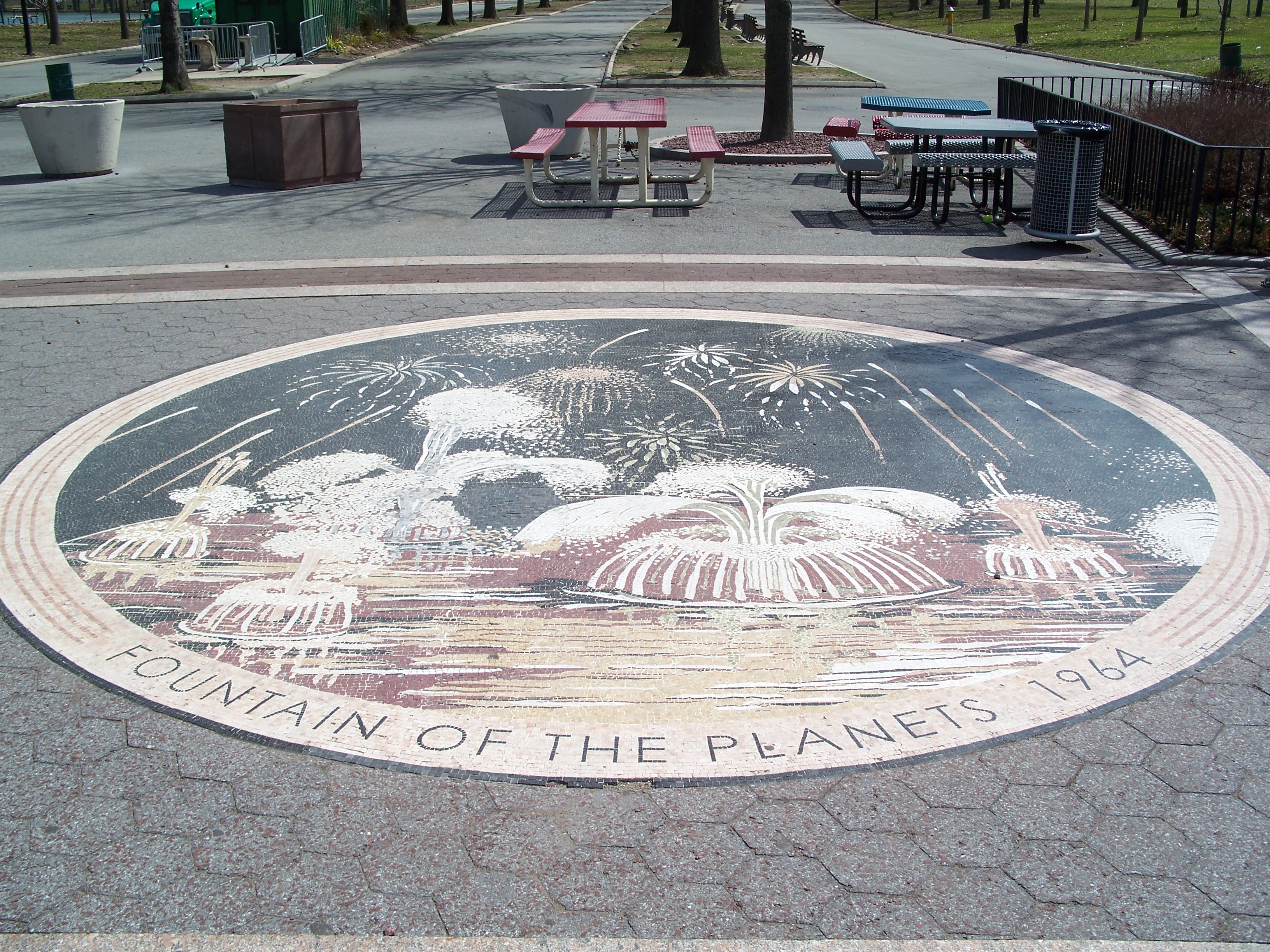 The entrance to the park from the #7 train is the Passarelle Entrance via the Passarelle Overpass over the LIRR tracks and MTA subway train yard. The plaza building includes a comfort station and recreation rooms and the ground level includes a group of crumbling circular mosaics that commemorate the past fairs.