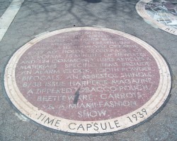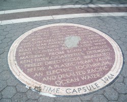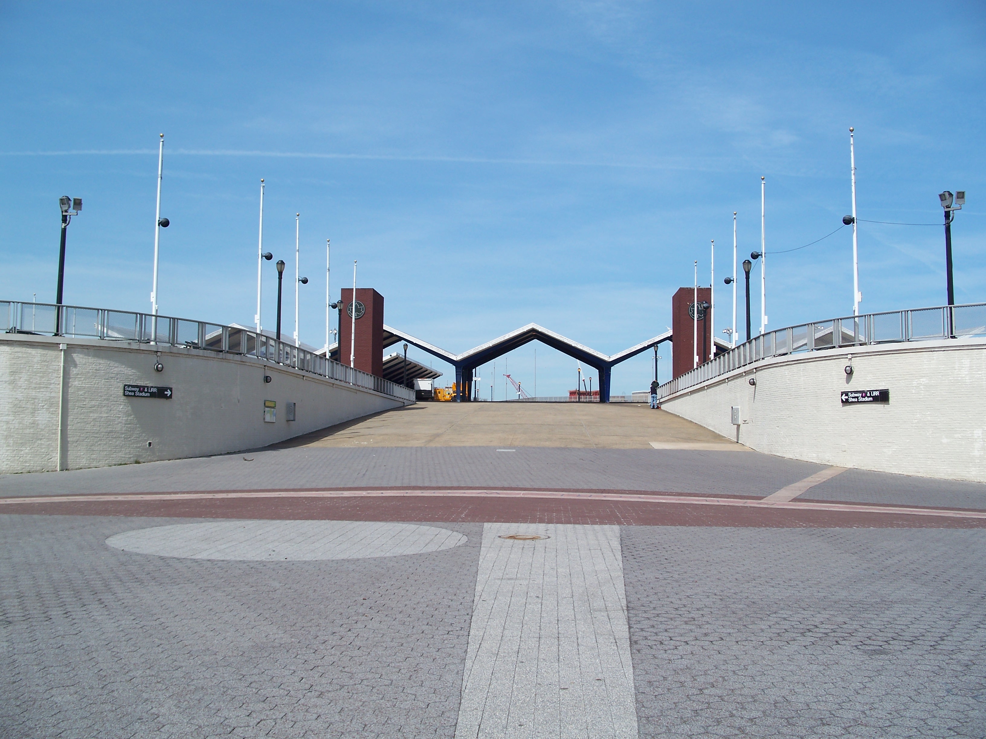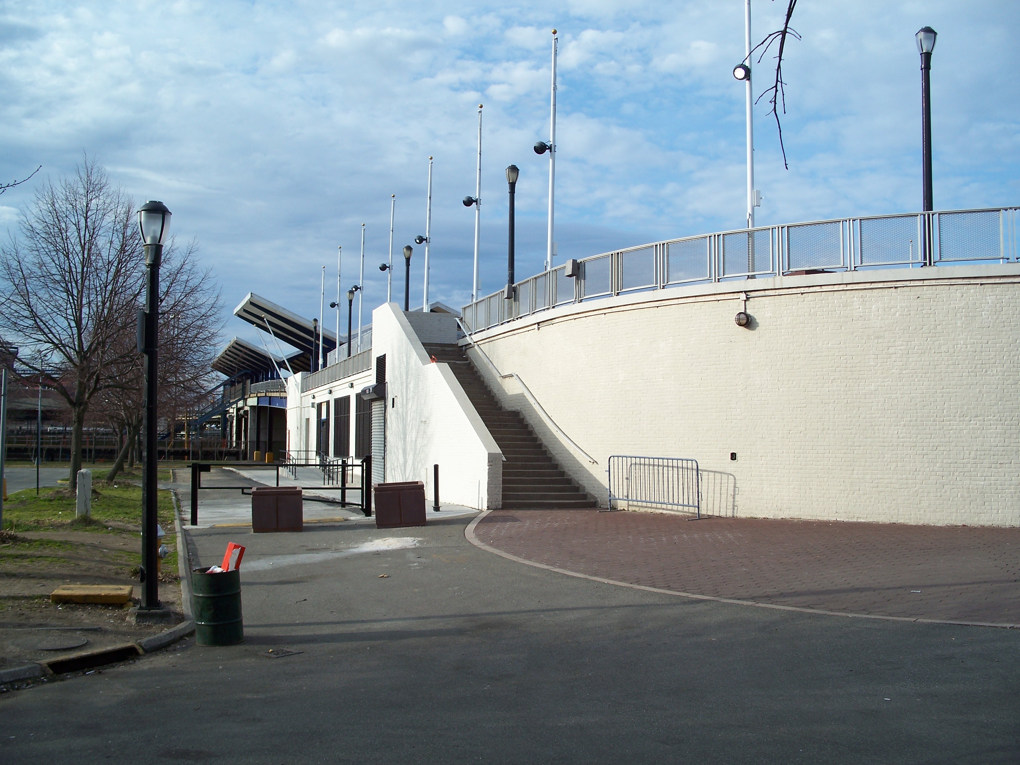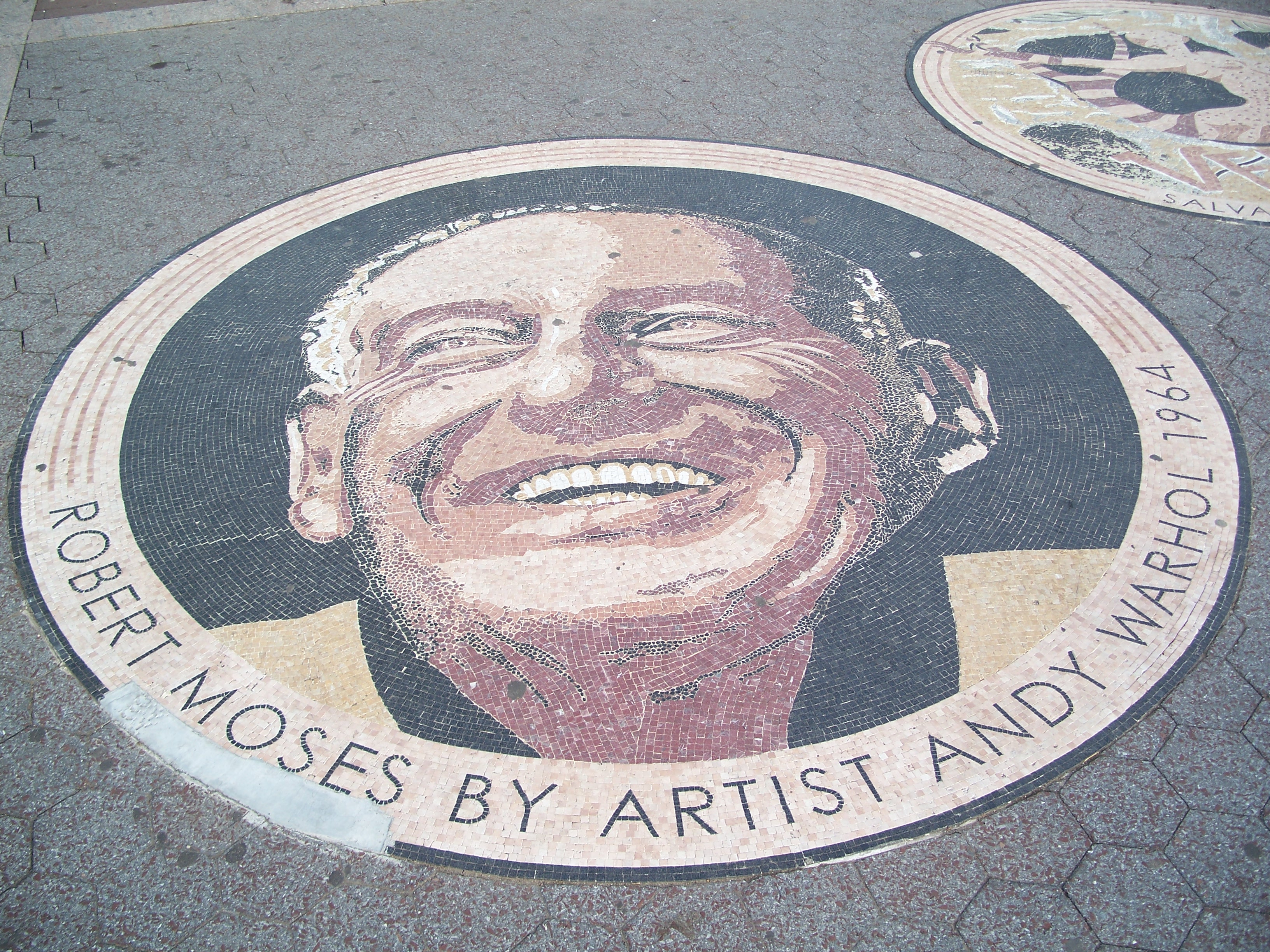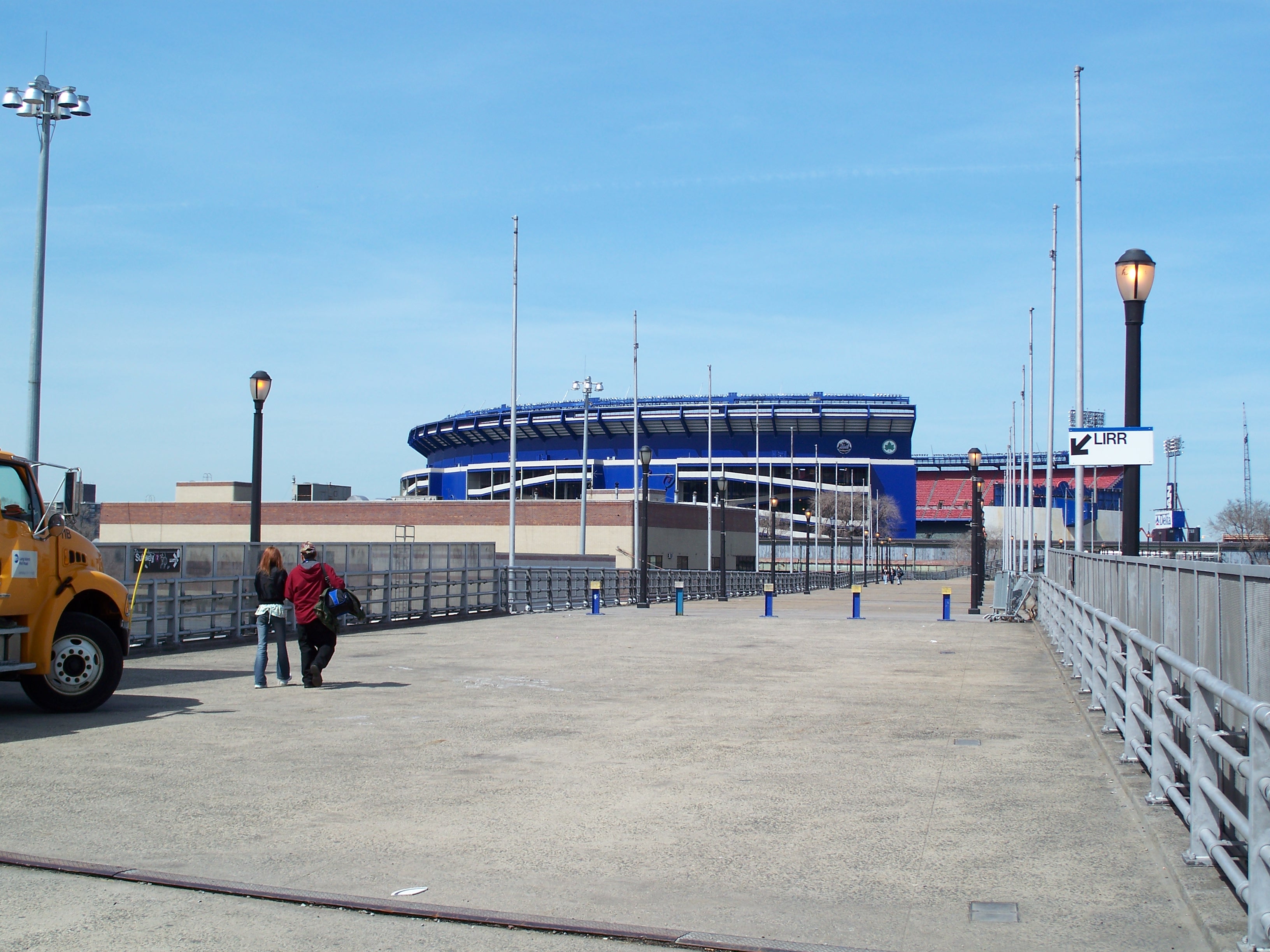 The entrance to the park from the #7 train is the Passarelle Entrance via the Passarelle Overpass over the LIRR tracks and MTA subway train yard. The plaza building includes a comfort station and recreation rooms and the ground level includes a group of crumbling circular mosaics that commemorate the past fairs.
